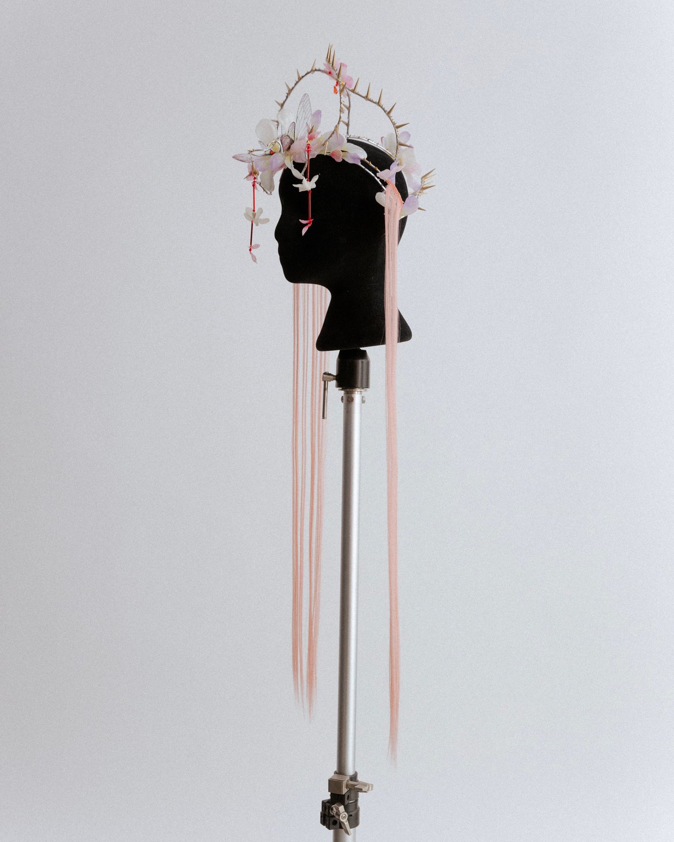 アシスタント時代から、作品撮りでヘッドピースのような物を試しに作っていたんです。まあ、師匠や周りの人たちからは「日本ではあまり必要とされないよ」って言われちゃいましたけど(笑)。それもそのはずで、当時はファッションシーンでは「ノームコア」がトレンドで、作り込んだとしても目に見えるものは限りなく削ぎ落としたシンプルな美しさが求められていたんです。だから仕事でヘッドピースが登場することはなくて、自然とヘアメイクの仕事に注力していきました。