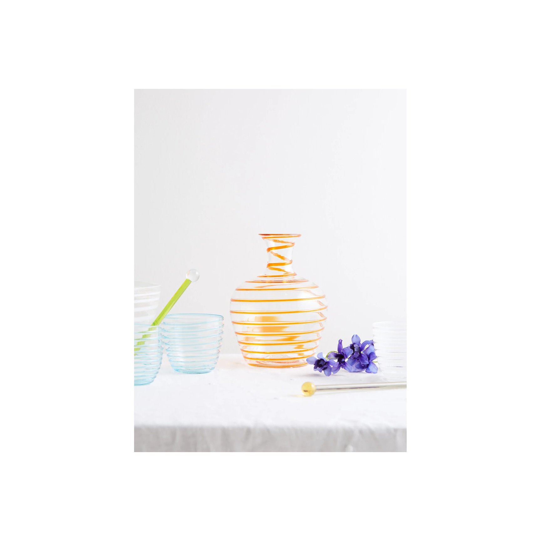 「ヤリ?ガラス(Yali Glass)」のカラフェはオレンジのスパイラルパターンが華やか。精密な手作業で作り上げられた、技巧の光るアイテムです。楽しげなムードを盛り上げてくれそうですね。