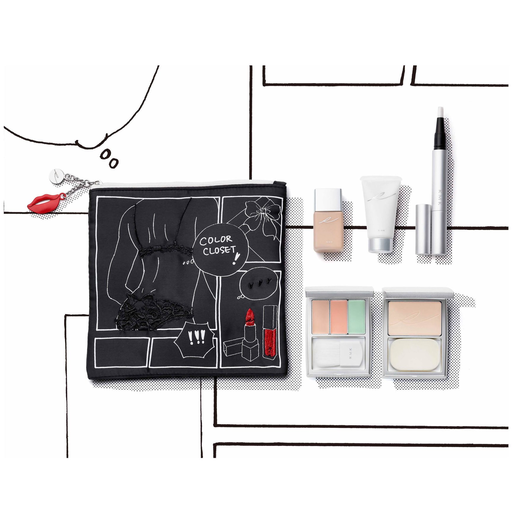アールエムケーのコフレは漫画家の桜沢エリカさんとのコラボレーション。「いつもとはちょっと違う私」をテーマにしたメーキャップセット2種類を用意しています。桜沢さんのイラストをあしらったオリジナルポーチ付きで、Rロゴやコスメモチーフのチャームが付属。