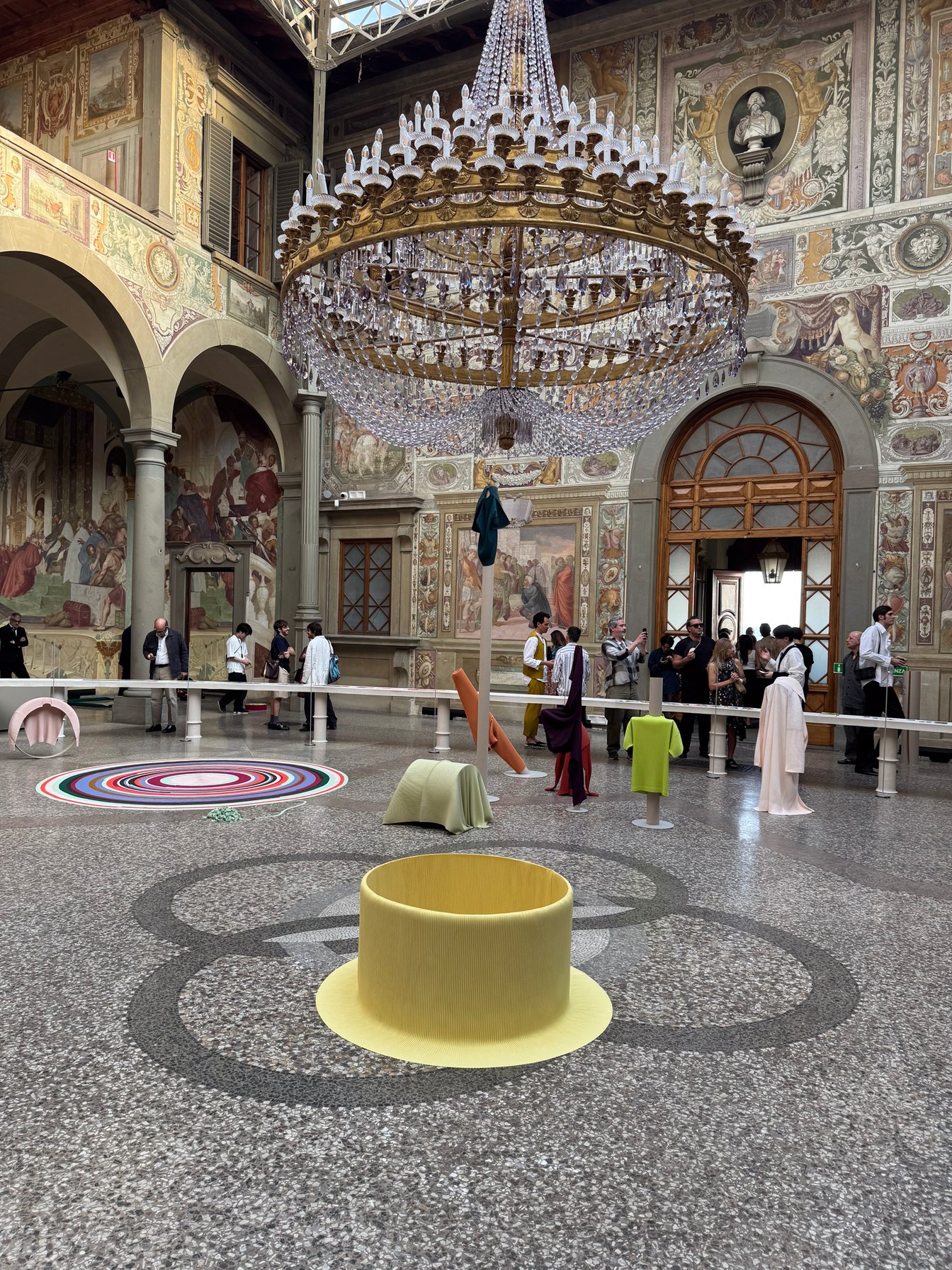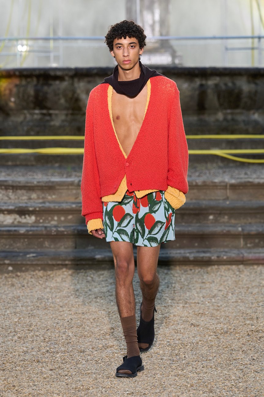ルネサンス期のイタリア?フィレンツェにおいて実質的な支配者として君臨したメディチ家にゆかりのある「Villa Medicea della Petraia」を会場に、オム プリッセ イッセイ ミヤケの2026年春夏コレクションは展覧会とファッションショーの2部で構成された。豪華絢爛の壁画とシャンデリアが存在感を放つ屋内施設では、日本デザインセンター 三澤デザイン研究室と協業して作り上げたインスタレーションを展開。デザインチームがフィレンツェを含むイタリアの都市の豊かな自然風景と生活が息づく町々を巡り、民家の壁や野菜の色など、採集した色彩と得られた着想源を知ることができる。プリーツ素材による作品群は、覆う、被せる、巻く、折る、重ねるなど素材に無理のない自然な手法から生地のなりたいかたちを探求したという。