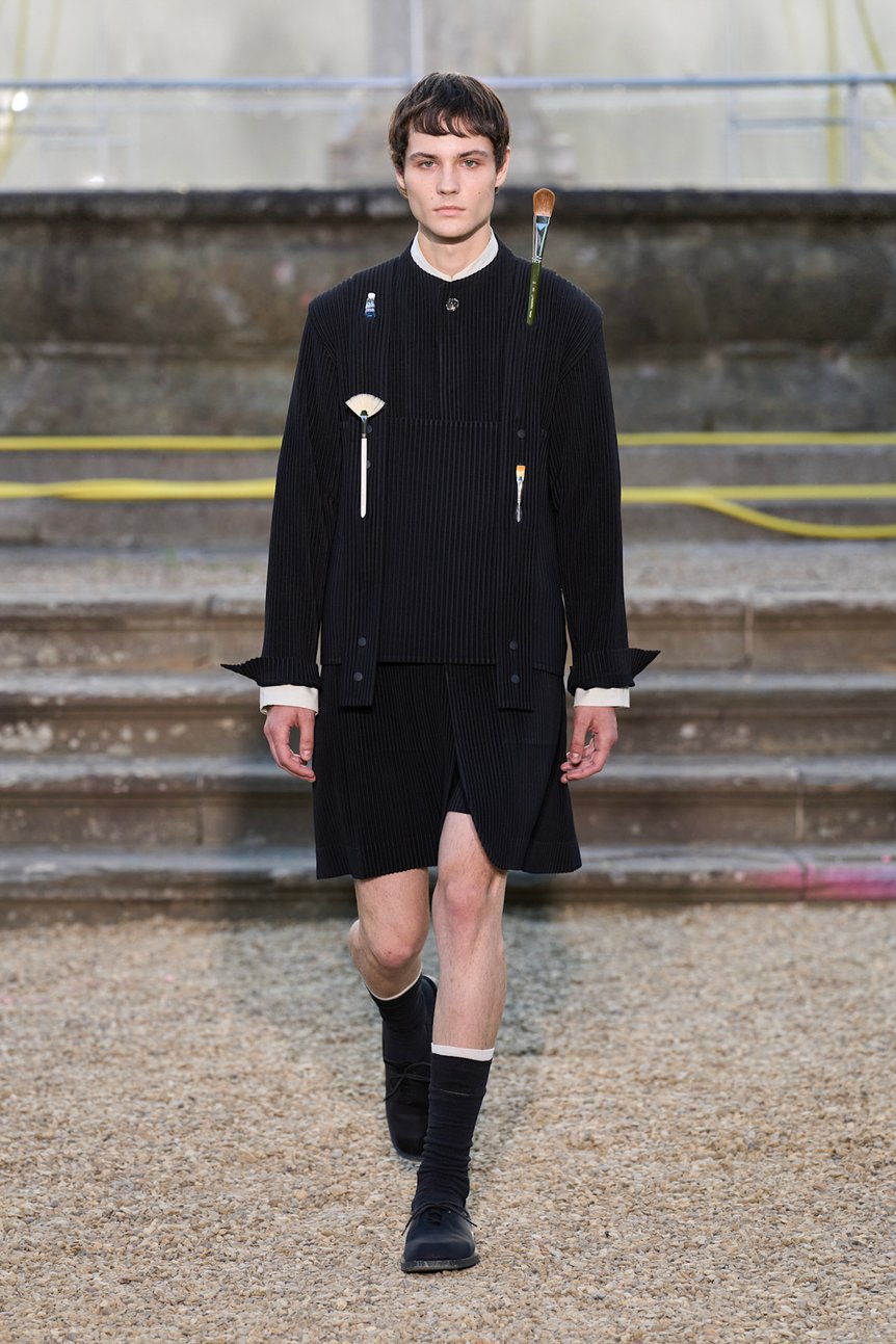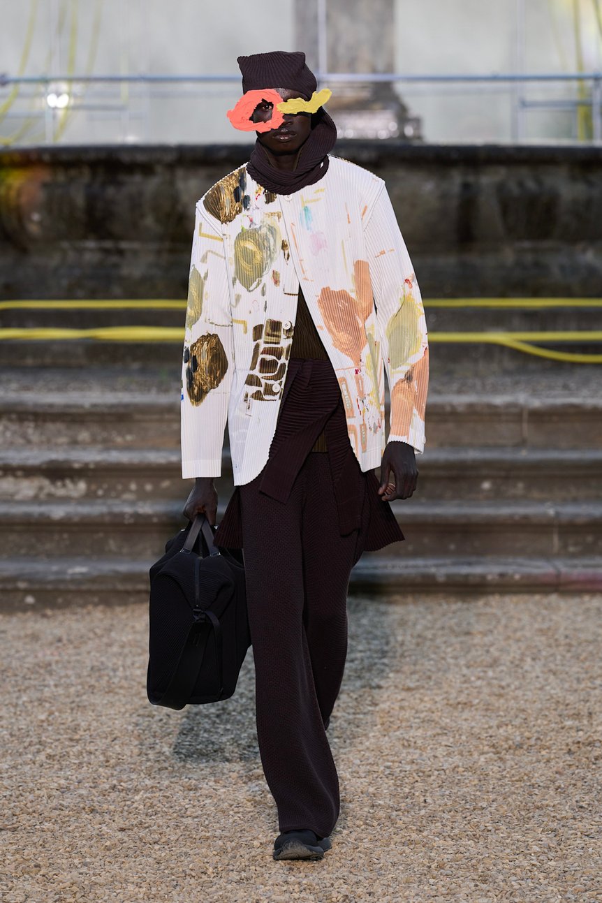 コレクションに用いた色の着想源を巡る展覧会会場を抜けた先には、スプリンクラーが設置された広大な庭園が広がり、ランウェイショーはここで行われた。ショーの進行や音楽と美しく連動するスプリンクラーと光を組み合わせ、虹を再現した演出が目を引いた会場では、色の採集に必要な道具を収納するというアイデアから生まれた、筆や絵の具などの描き道具のみならず、ポケットティッシュなど日常生活の小物を携行するのにも便利なシリーズ「PAINTER’S GEAR」や、ブランドの定番として提案している二つボタンのジャケットに加え、新型のノーカラーロングジャケット、ロングダブルブレストジャケットといった幅広いセットアップが揃うテーラードプリーツシリーズ「TAILORED PLEATS」、イタリアでの色の採集に使用したパレットそのものをモチーフとしたプリントシリーズ「PALETTE」、リネンのような風合いを持ち、肌離れの良いさらっとした素材感が特徴のテーラードシリーズ「LINEN LIKE」といったシリーズで分けたアイテム群を披露。ガーメントプリーツの技術を基盤に、着る人の多様性に対応するユニバーサルな日常着をデザインした。