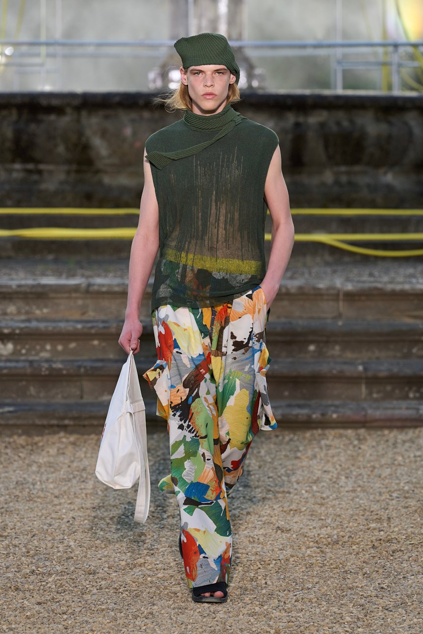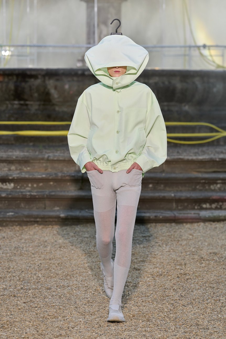 また、後半のルックではハンガーをかけた衣服が多数登場するが、これは衣服を入れて持ち運ぶガーメントバッグを着用するという発想から生まれたシリーズ「CARRIER CARRIED」のアイテム。着用しない時は折り畳んでガーメントバッグの形にもなるパッカブル仕様で、旅先に服を運ぶバッグがそのまま服へと姿を変え、さらに着用者を次の場所へと誘う、遊び心と実用性を兼ね備えたアイテムとなっている。