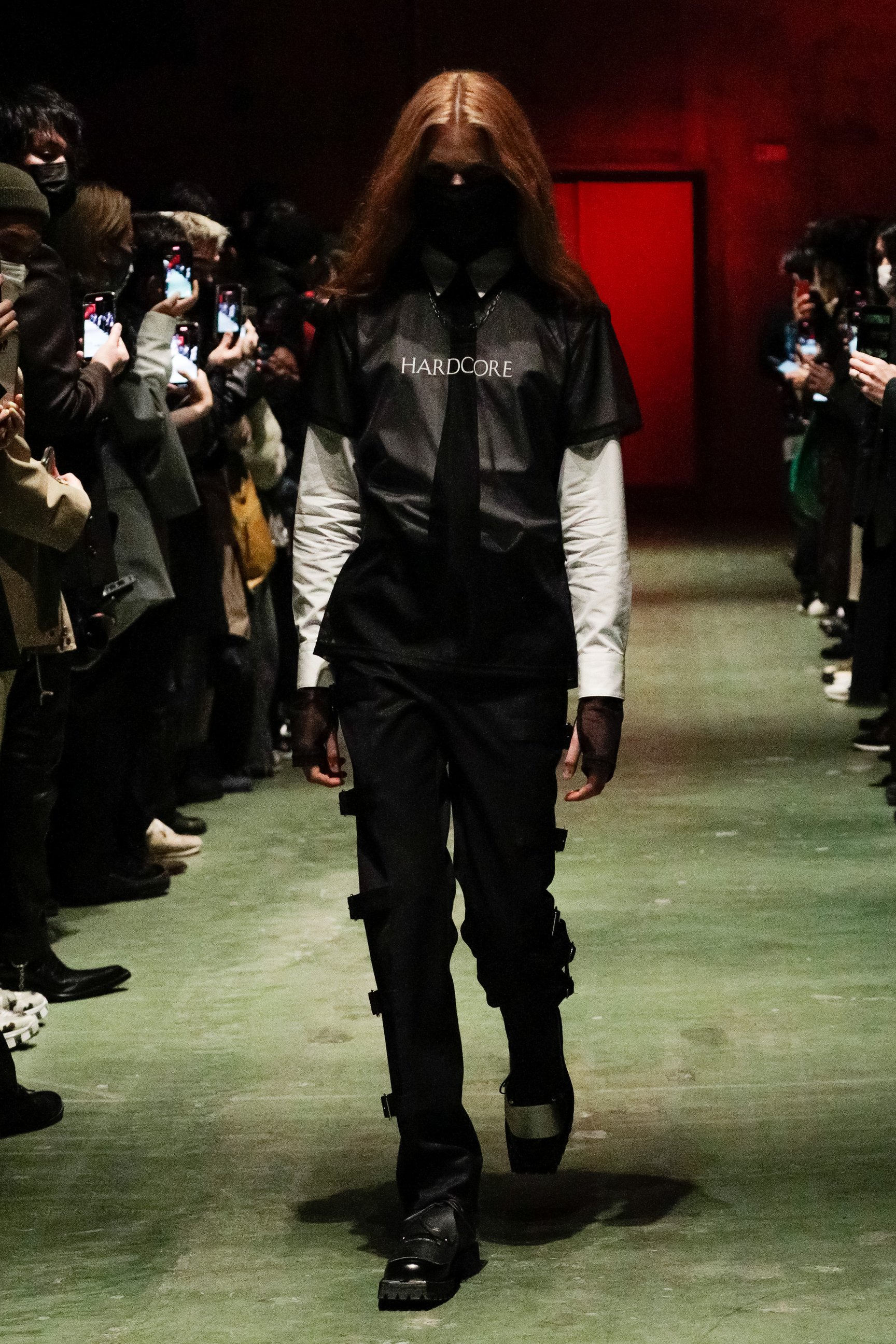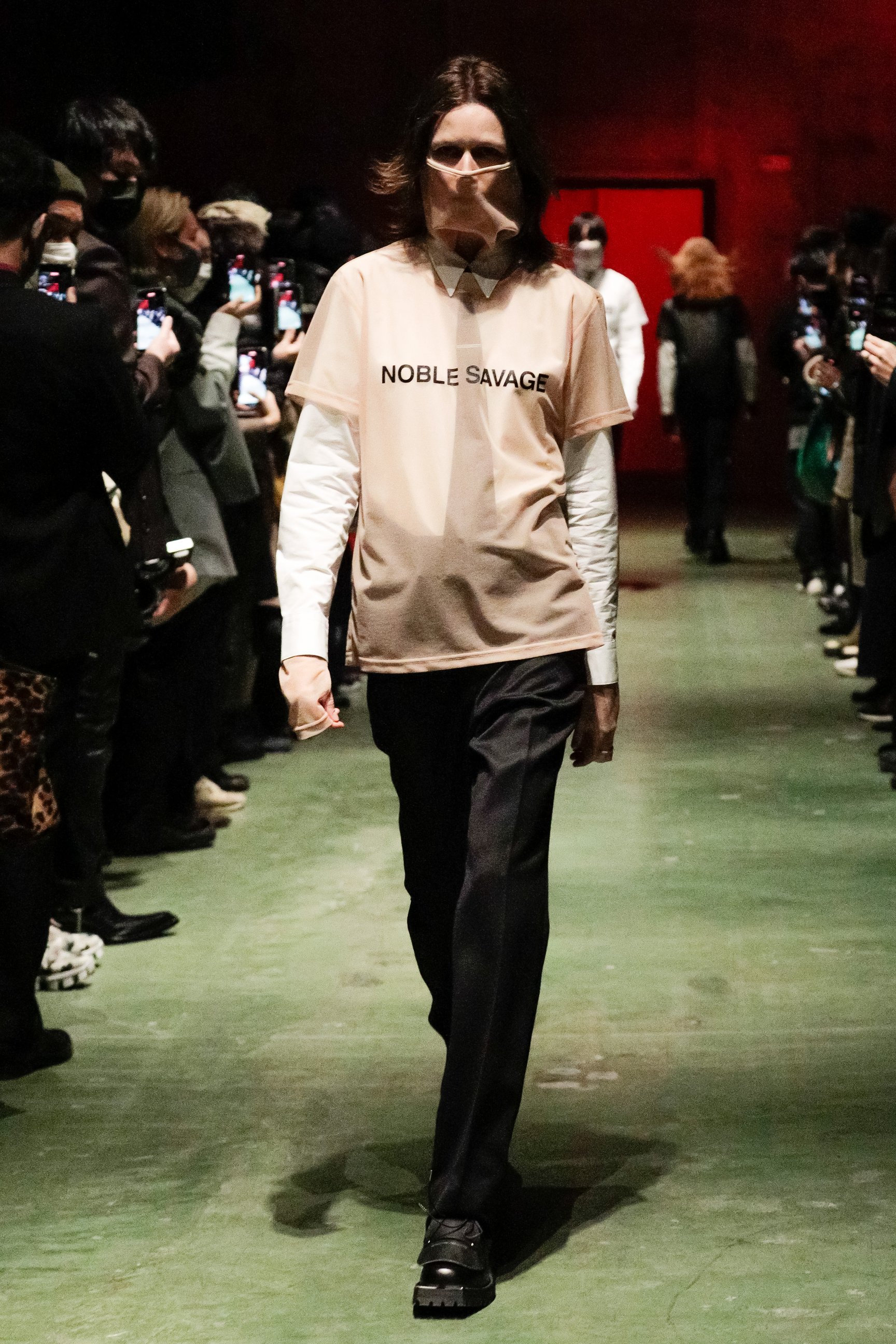 赤いライトをバックにランウェイに登場した序盤の3体は、いずれもシャツとタイに薄手の半袖トップスを重ね、「HARDCORE」「NOBLE SAVAGE」「PROTECTED」のメッセージをプリント。
