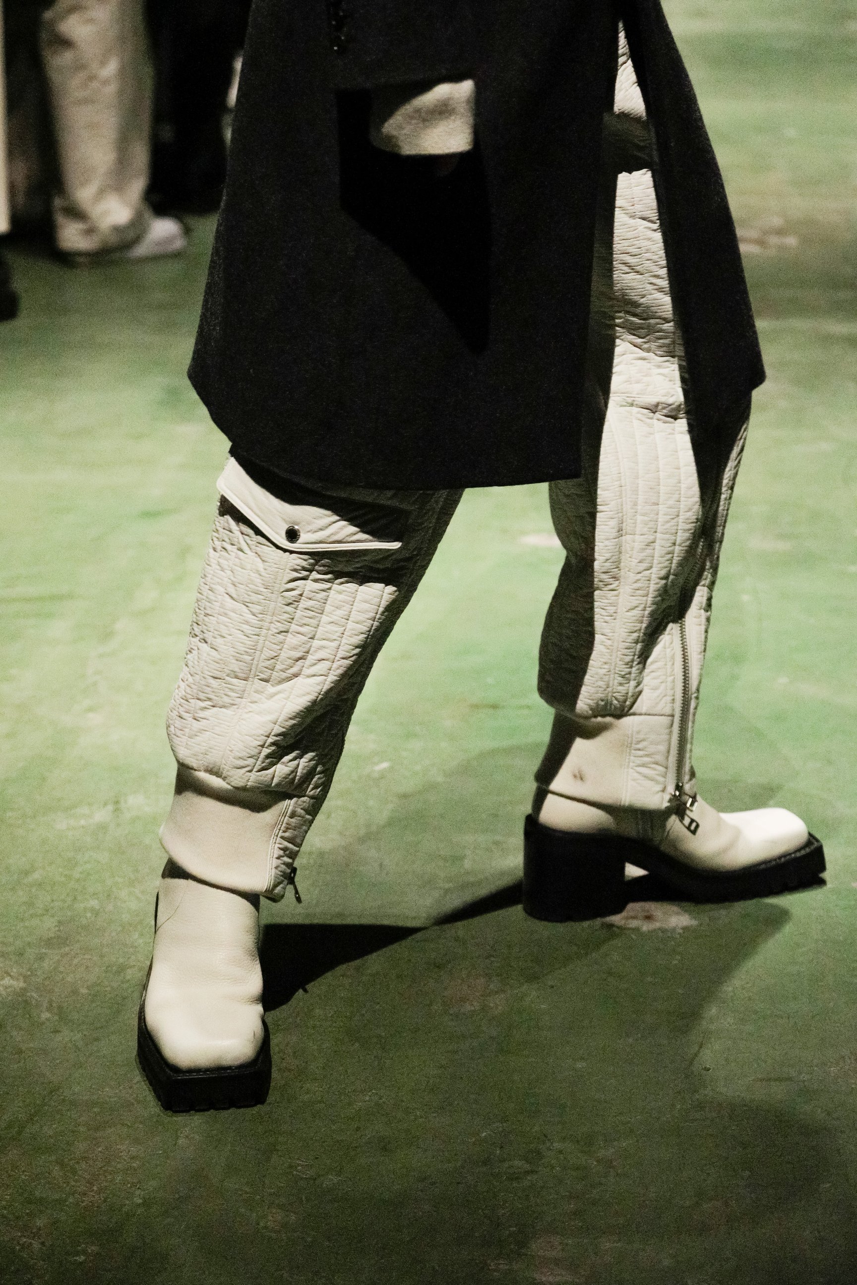 キルティングパッド付きコートはアイスホッケーのキーパーウェアから着想。前身頃にチャップスのようなレイヤーを施したパンツやスカート、ボンデージの装飾も目立つ。アクセサリーの感覚で様々なフェイスマスクが登場し、ネックゲーター型のマスク付きカットソーといったアイテムも。金属のシューアクセサリーは、工事現場作業員の鉄板入りシューズから着想している。