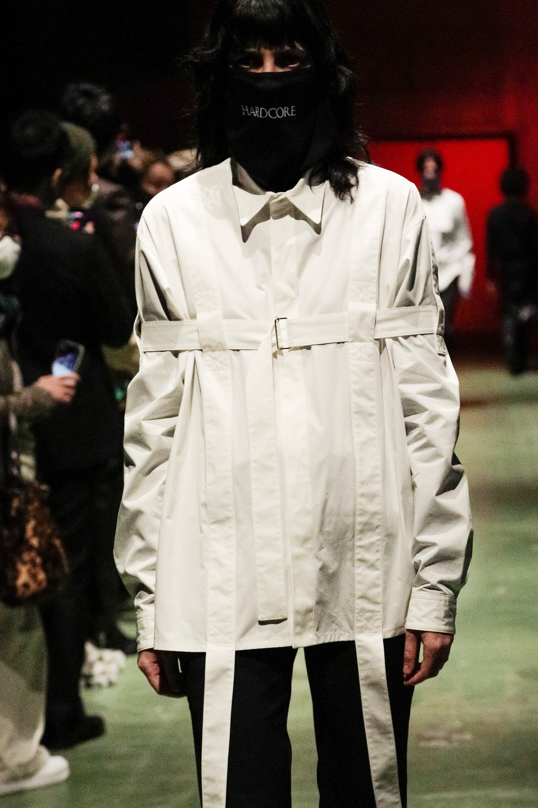 柳川は、コレクションの見せ方などについても「宮下さんに導いてもらった部分も多かった」と話している。柳川ならではのアグレッシブさではなく「静かなる強さ、静かな怒り」といった宮下の提案から気付きを経て、模索しながら作り上げたという。フィナーレで登場した柳川は、同じ世界で闘うデザイナーに敬意を払うように、タカヒロミヤシタザソロイスト.のフェイスマスクを着用していた。