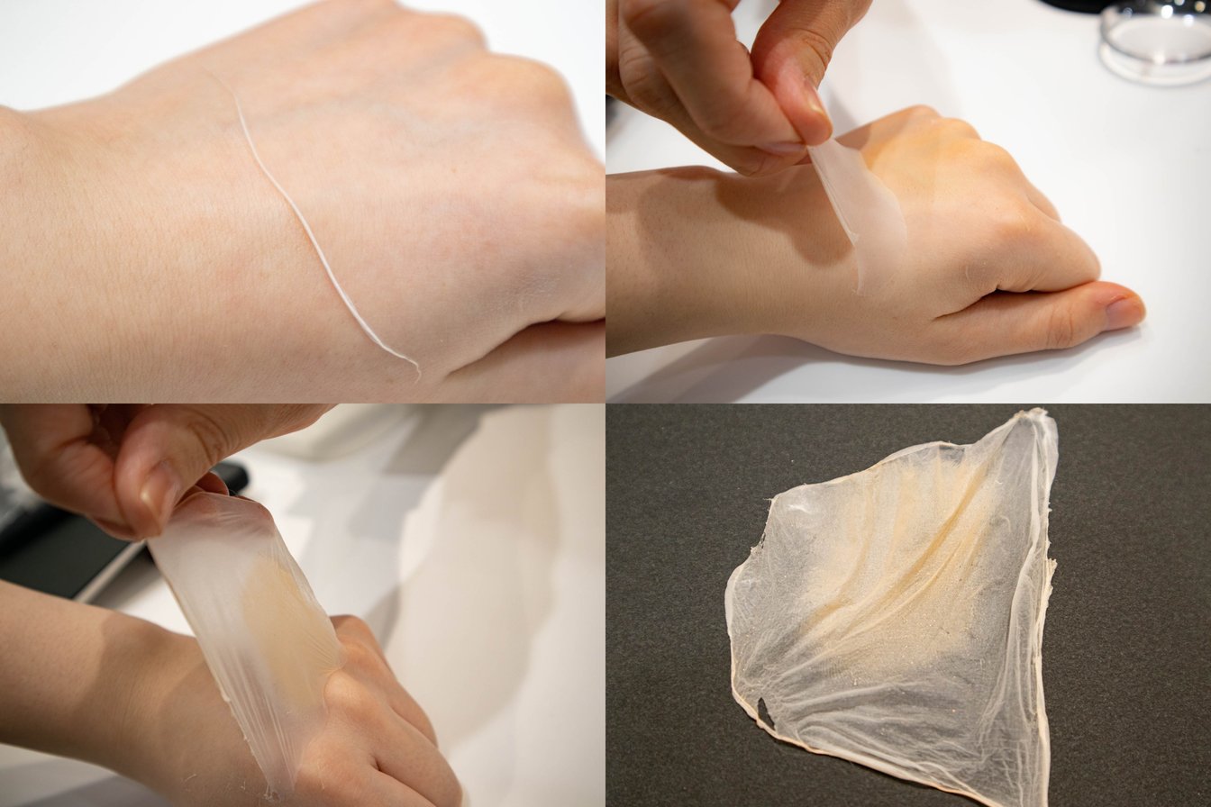 一度ファンデーションを塗った後にヴェールフィクサーで膜を密着させるとムレや閉塞感があるのでは?と心配していましたが、極薄膜は繊維の集まりで極小の隙間から水蒸気を逃すため、ムレは発生しにくいとのこと。実際使用した際もムレは感じず、膜を剥がした後もベタつきはありませんでした。