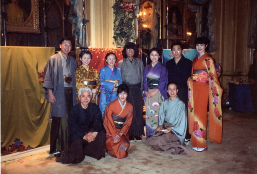 1993年、京都の着物「千吉」とライセンス契約。ホテル リッツ パリで初披露した。中央:高田賢三(筆者提供)