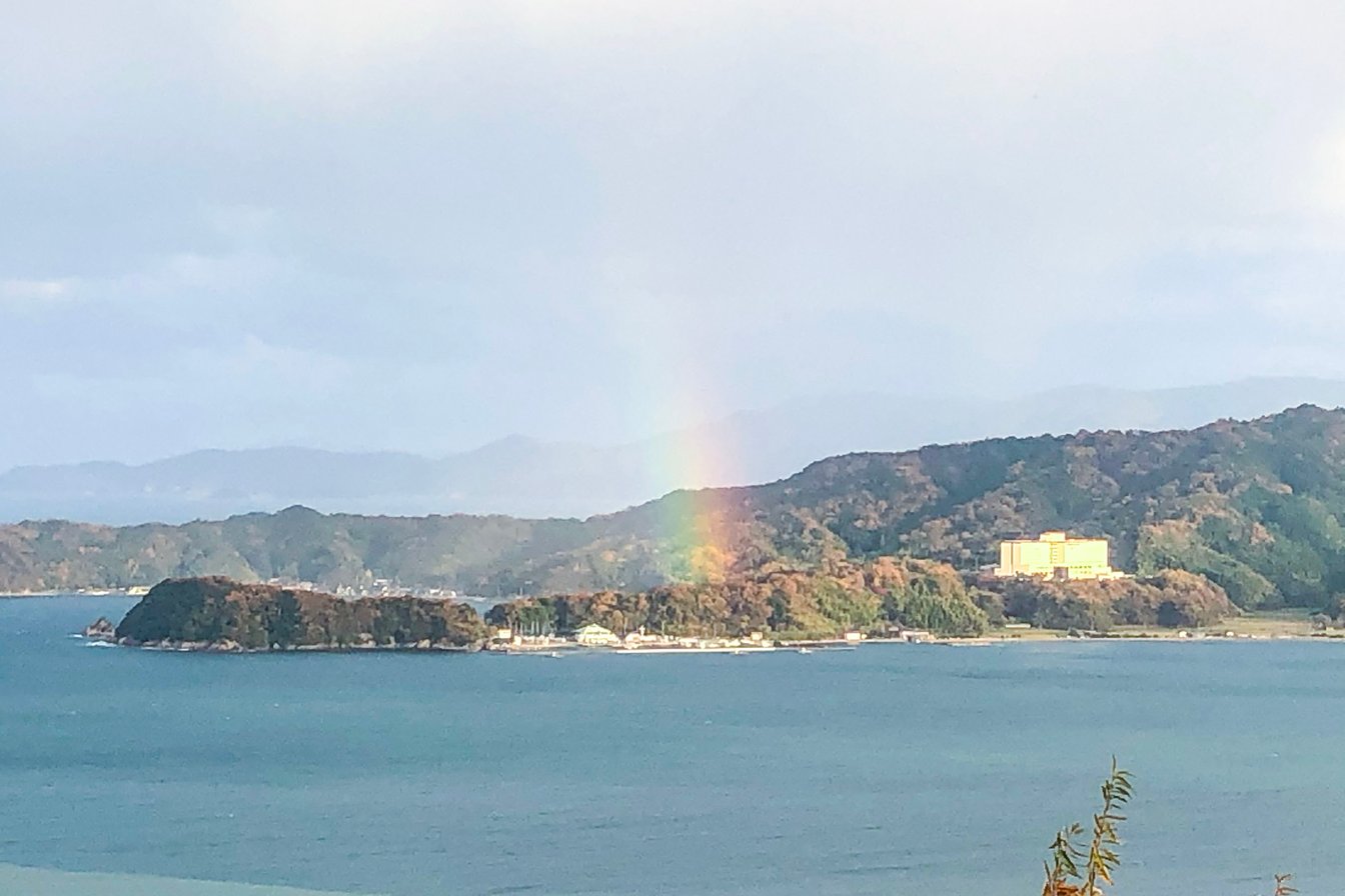 そんな話をしながら向かっていた道中、「僕が行くから、きっと虹が見れますよ」と話す賢三さん。同行していた皆が「まさか~っ」と笑っていた。現地に着いて神社にお参りし、天橋立が見下ろせる展望所に上がっていく時。ふいに、賢三さんの顔がパッと明るくなった。「ほらね、見て!」。振り返ると、本当に大きな虹が出ていたのだ。息を飲むような光景に、皆で歓声を上げた。