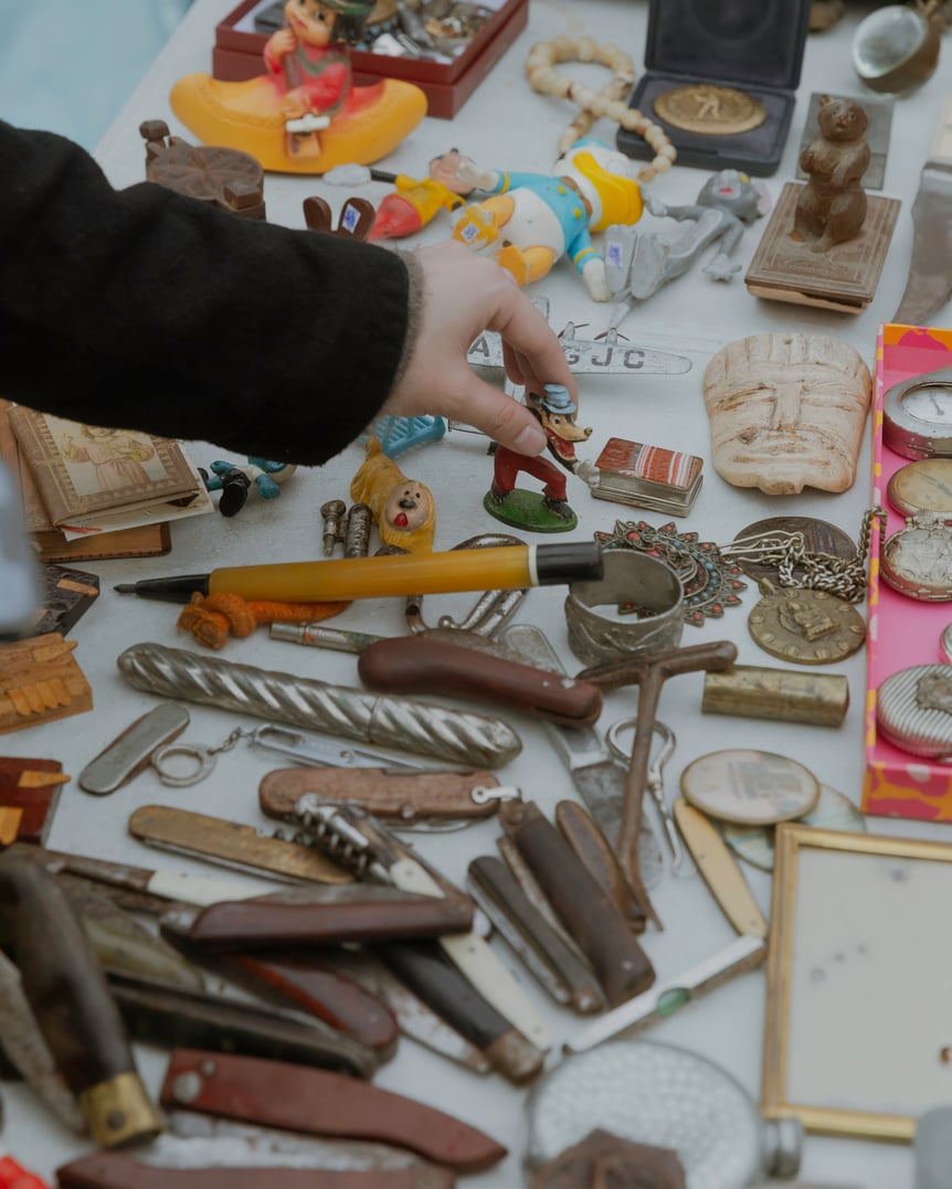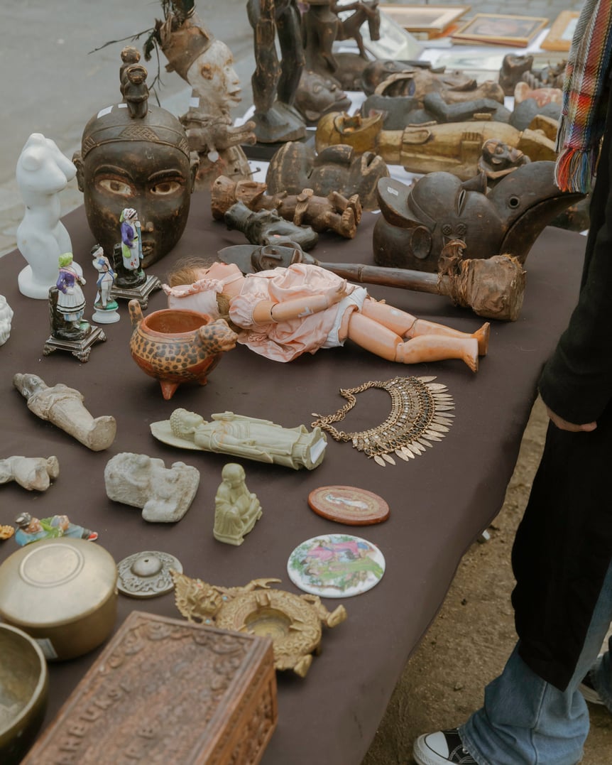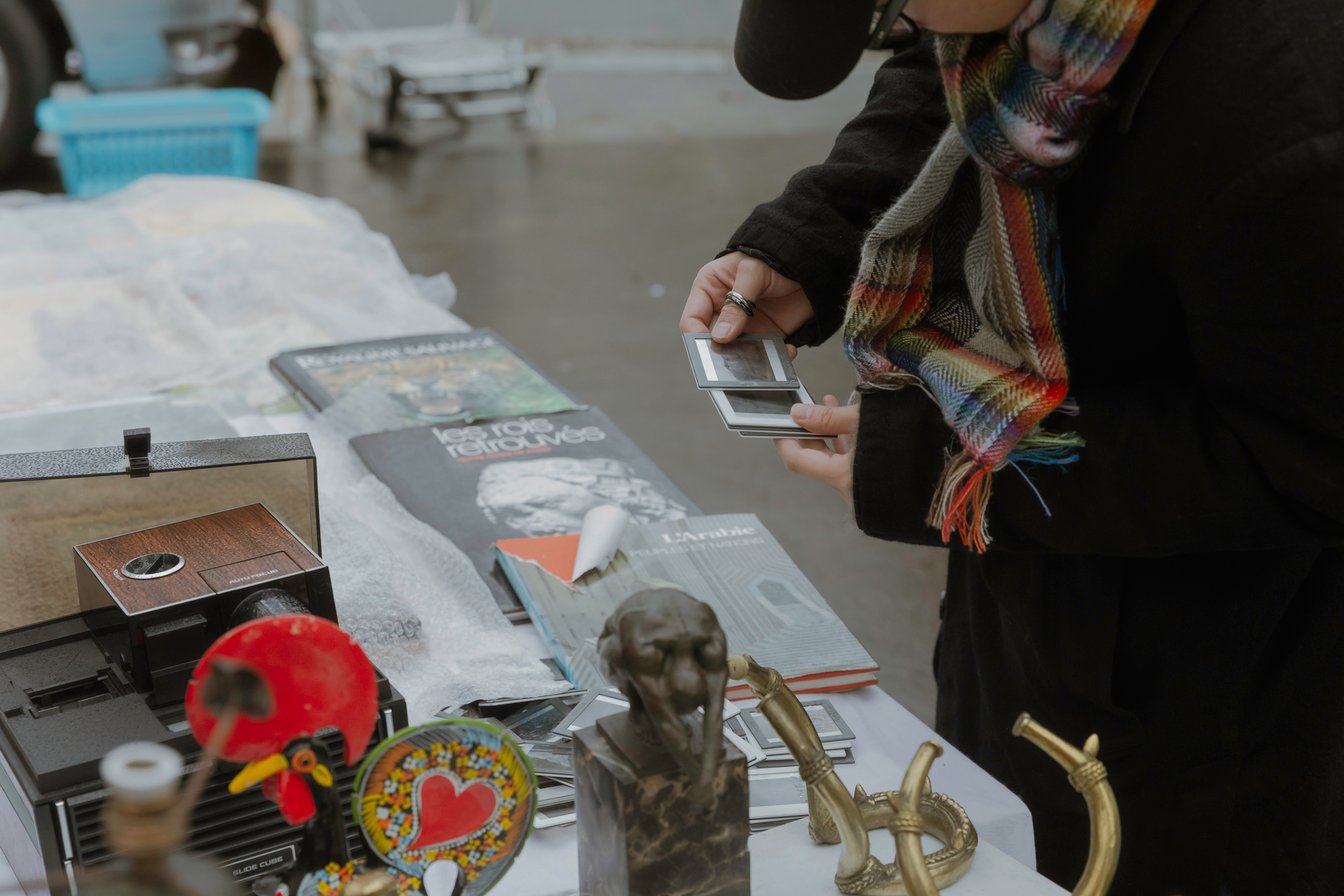 「用途不明な、自分の頭の中にないものがここにはある」。Kokiにとって今回で4回目となったヴァンヴ蚤の市は、あいにくの雨で古着の出品は少なかったが、カトラリーや絵画、人形、オブジェ、カセットテープ、仮面、カメラ、アクセサリーなど多種多様なものが販売されていた。「欧州だけでなく、アフリカやアジアのカルチャーが入り混じるこの空間に、温かみを感じ落ち着く感覚を覚えます」。そういうと、Kokiは見知らずの家族の姿がおさめられたネガフィルムを手に取り、「なんかいいですよね、この写真」と目を輝かせる。