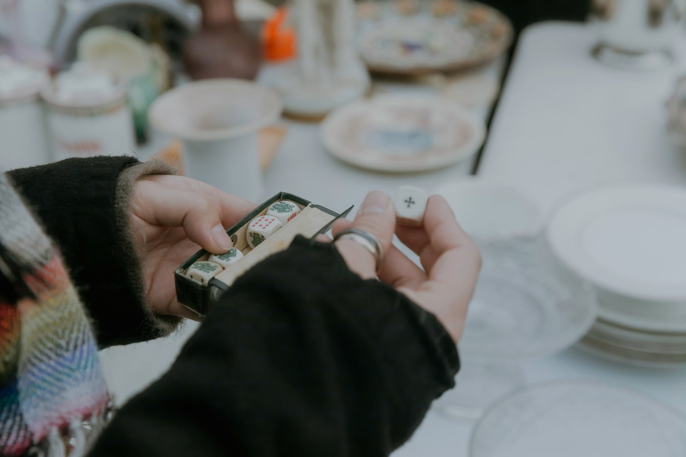 蚤の市には実用性はないが、魅力的に映る品々が多い。トランプの絵柄が入ったサイコロは、出品者に聞くと、どうやら振って役を作り、ポーカーとして遊ぶものらしい。ポーカーをしないKokiだが、そのデザインの面白さから購入を決めた。