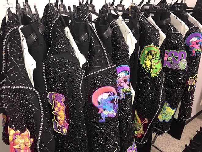 LDHのアパレル部門の総監修を務める小川哲史が昨年に引き続き、オリジナルで衣装を制作。黒地に細かな装飾があしらわれたデザインで、「JSB」の文字や風神?雷神のモチーフのビビッドカラーがアクセントになっています。靴はメンバーのNAOTOさんが手がける「セブン(SEVEN)」と「メゾン ミハラヤスヒロ( Maison MIHARA YASUHIRO)」のコラボレーションシューズを採用。
