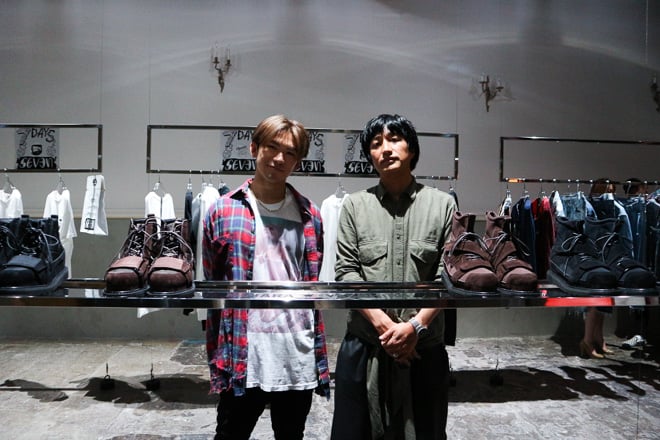 NAOTOさんと三原康裕。手前はコラボシューズ(2016年6月撮影)