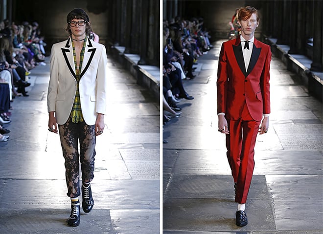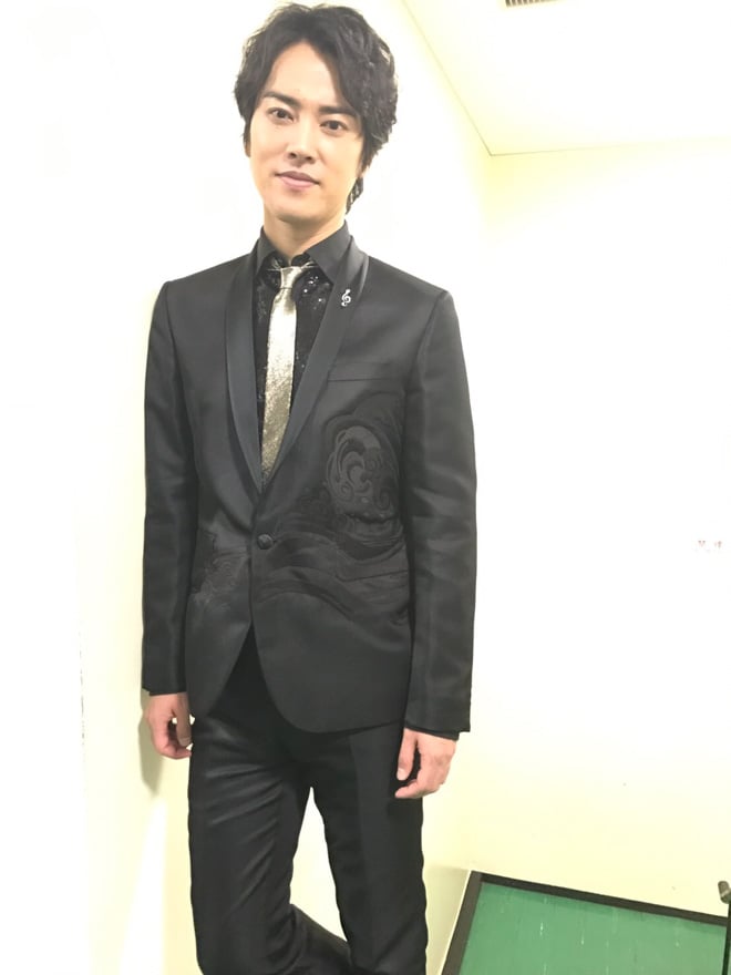 AIさんと同じく、「グッチ(Gucci)」2017年クルーズコレクションを2度着用。歌唱前は堂本剛さんが白のジャケット、堂本光一さんが赤をベースにしたスーツを着ていました。後半では、2017年クルーズコレクションのメンズテーラリングの広告の顔となった俳優のトム?ヒドルストンが着用したアイテムがそれぞれ選ばれました。(【アイテム写真】堂本剛さん|堂本光一さん)