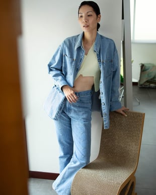 また夫の日高俊が手掛けるブランド「ヒダカ(HIDAKA)」のアイテムもコーディネートのアクセントに。ベスト風のボディーバッグやバックパックといったヒダカの小物は、横澤自身に欠かせないアイテムだ。また足元には「コンバース(CONVERSE)」との初のコラボレーションスニーカーがお目見え。アシンメトリーなスエードのベルクロが付いたブルーとホワイトのシューズが登場した(詳しい情報は6月に発表)。他にもリサイクルショップやフリマアプリで調達したというシューズを合わせた。