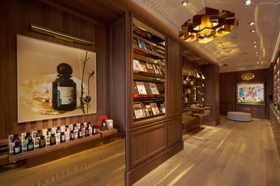 2025年4月、パリ?サントノレの本店と同じ空気感を再現した旗艦店が東京?表参道にオープンしました。自らを“調香師兼デコレーター”と称していたというラポルト。ブランド創業時のフランス建築様式を思わせるダークな木目調を基調にした重厚感と、モダンアートやアーティスティックな照明などによる軽やかな雰囲気が重なり合った空間が演出され、精緻な職人技とデザインによるアール?ド?ヴィーヴル(美しい暮らしの流儀)を象徴する空間が広がります。