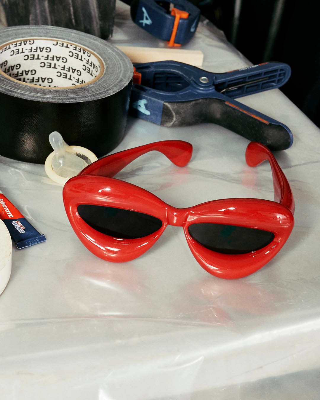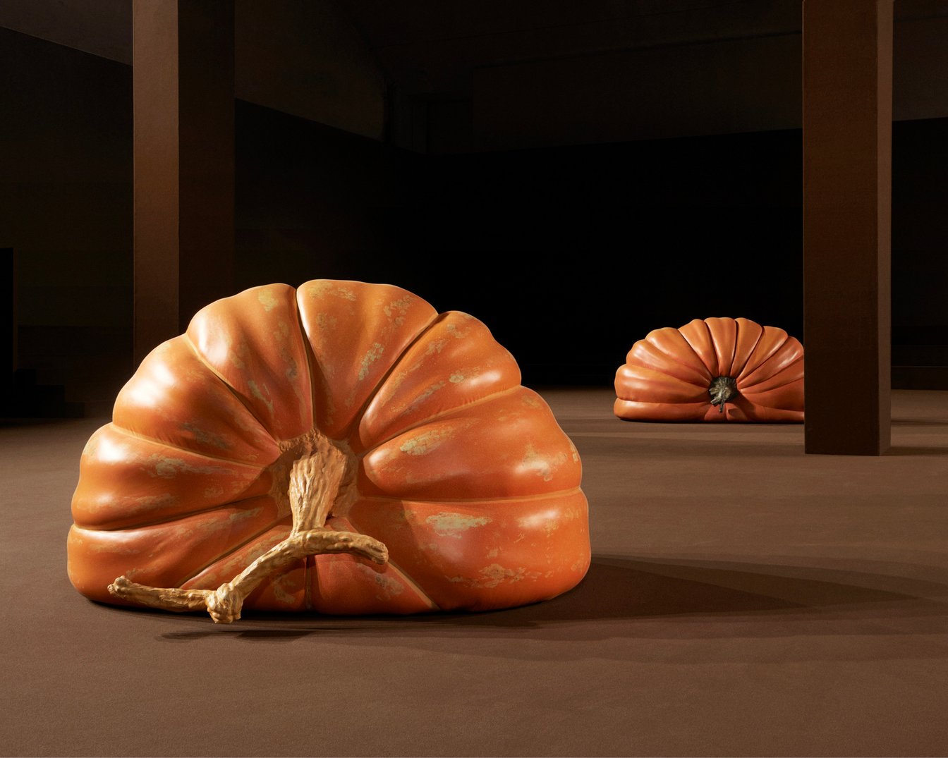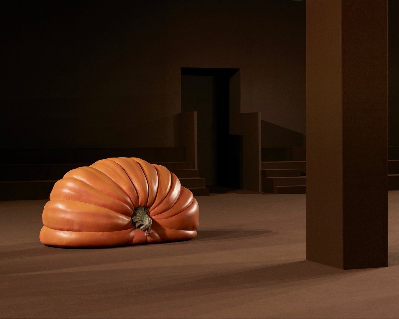 会場には、酒袋からインスパイアされた土色のカーペットが敷かれ、巨大なカボチャが床にめり込むような形で横たわっている。これはイギリス人アーティスト、アンセア?ハミルトン(Anthea Hamilton)による彫刻作品。ハミルトンは、2016年にターナー賞(英国の現代美術賞)にもノミネートされた注目株で、ロエベとはこれまでもコラボレーションを実現させてきた。今回の作品はレザー製で、ブランドと共同制作したものだという。