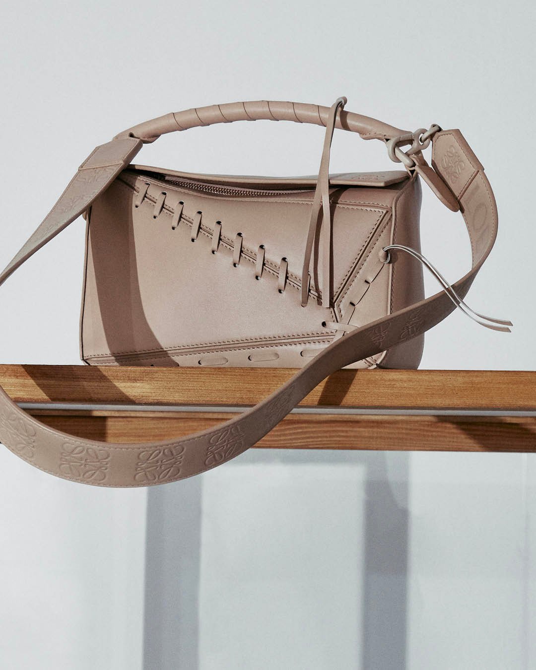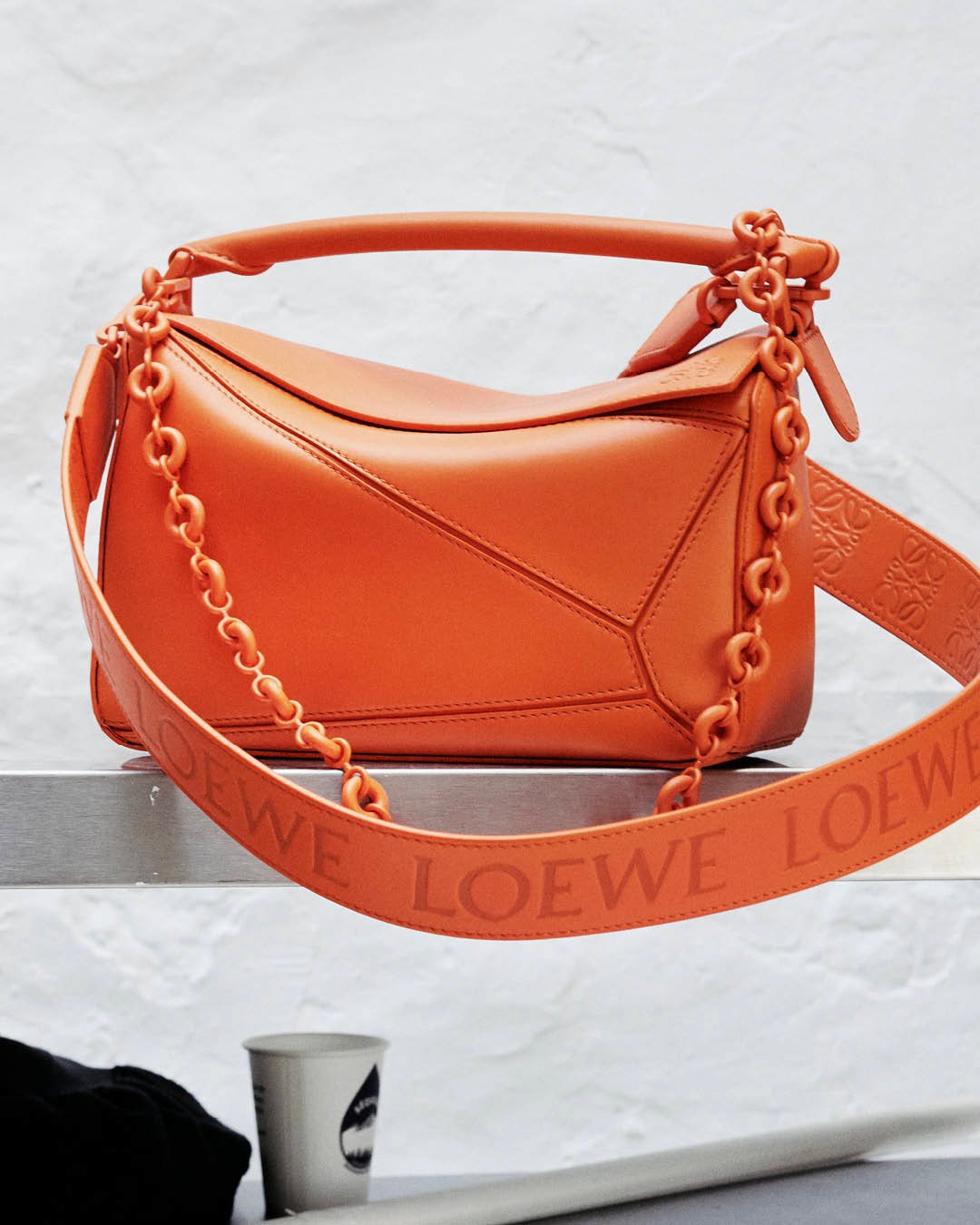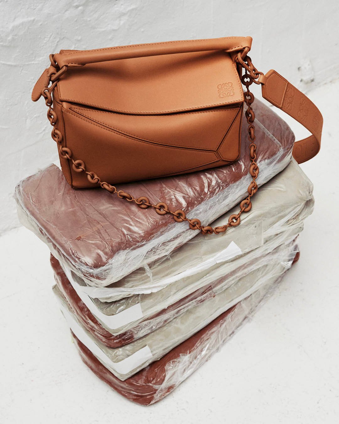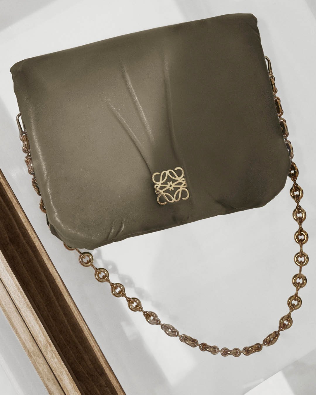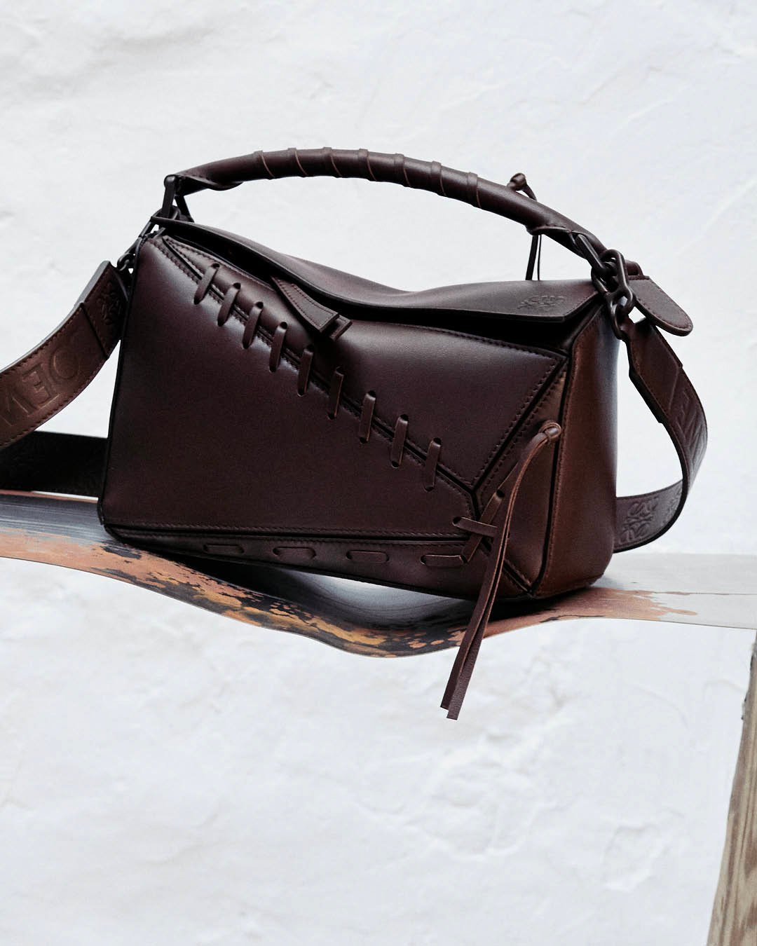 ロエベのアイコンバッグも変容を遂げている。「フラメンコ」「ゴヤ」といった人気のバッグが膨張したシルエットで登場。「パズル」はステッチやチェーンでアレンジが加わった。