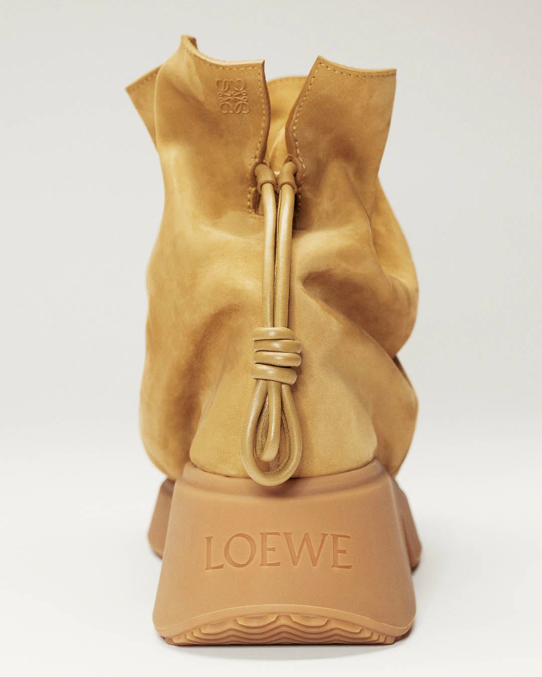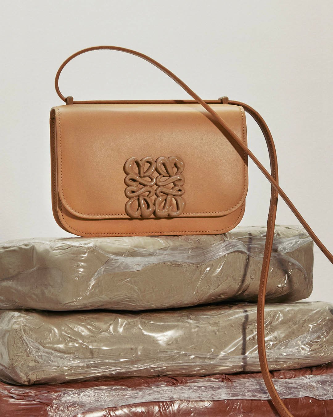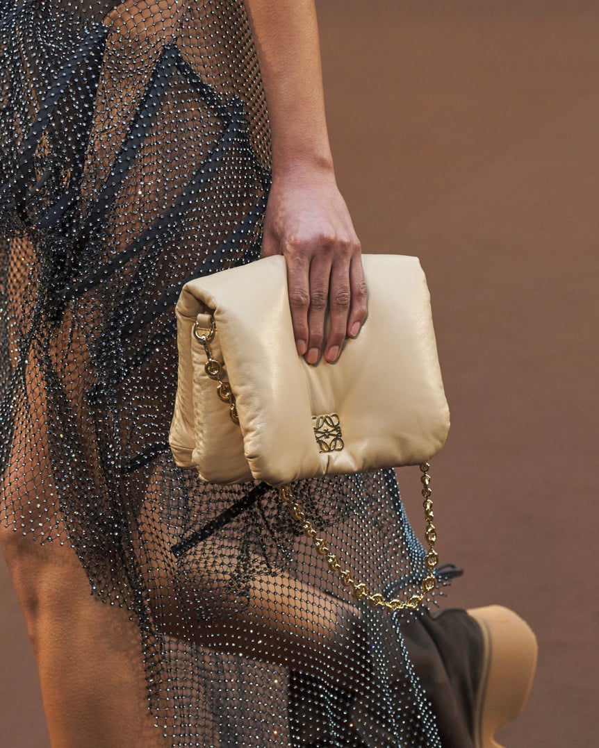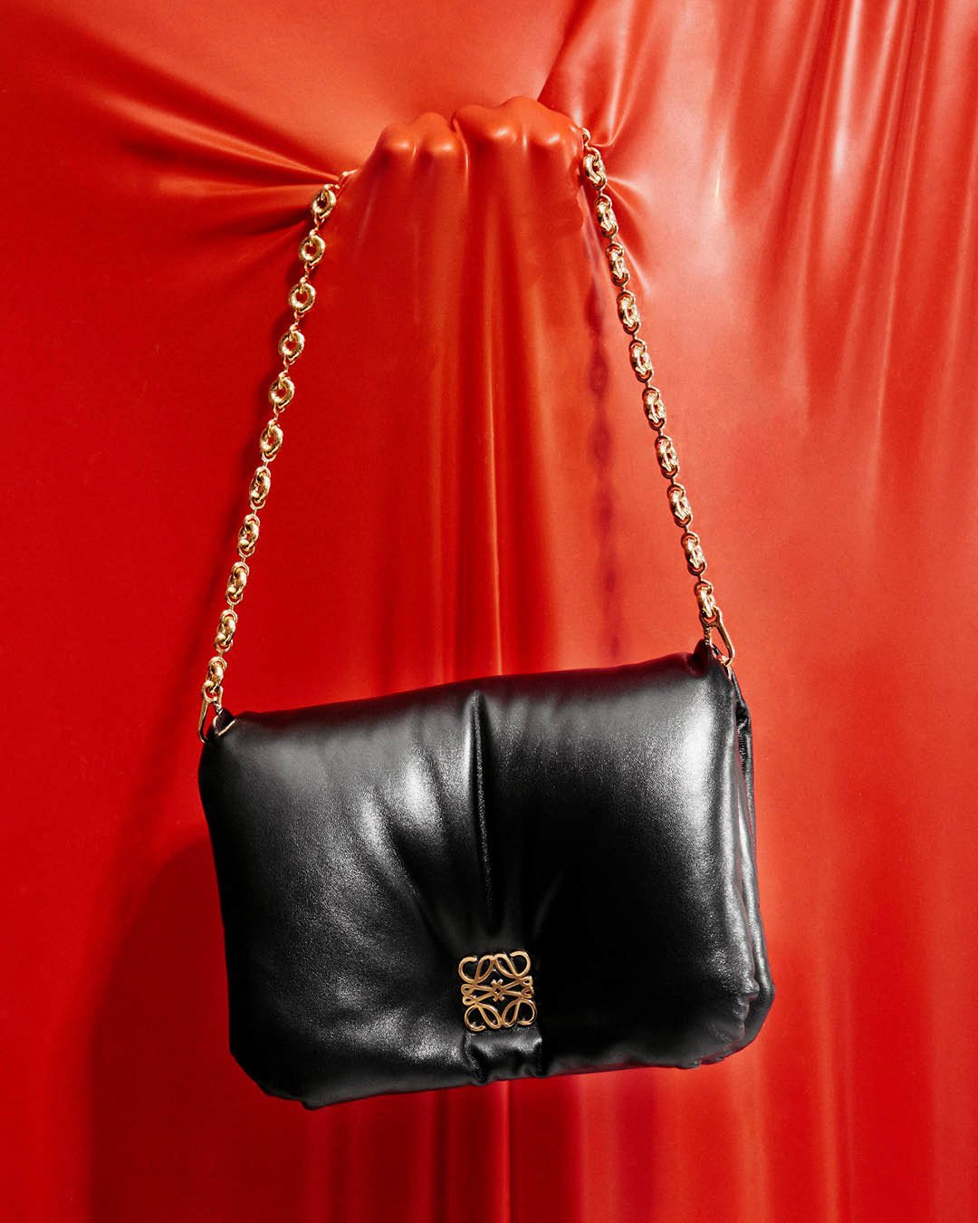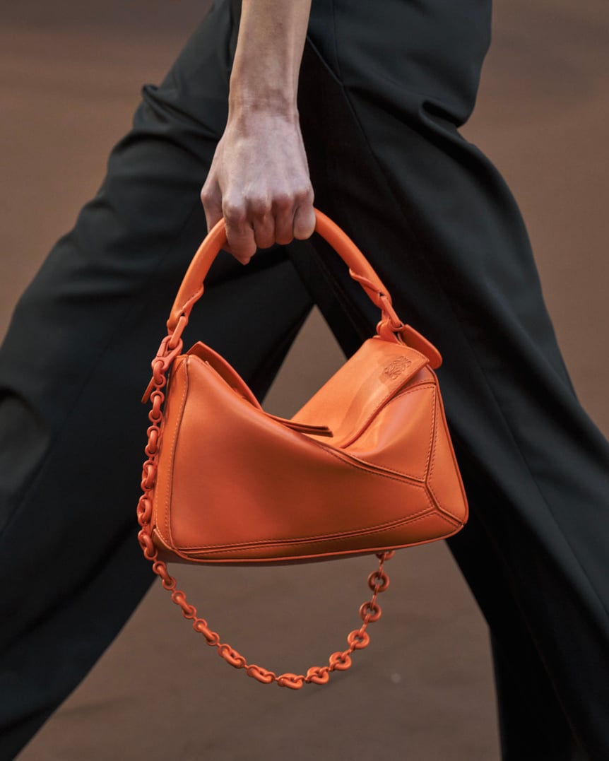 ロエベのアイコンバッグも変容を遂げている。「フラメンコ」「ゴヤ」といった人気のバッグが膨張したシルエットで登場。「パズル」はステッチやチェーンでアレンジが加わった。