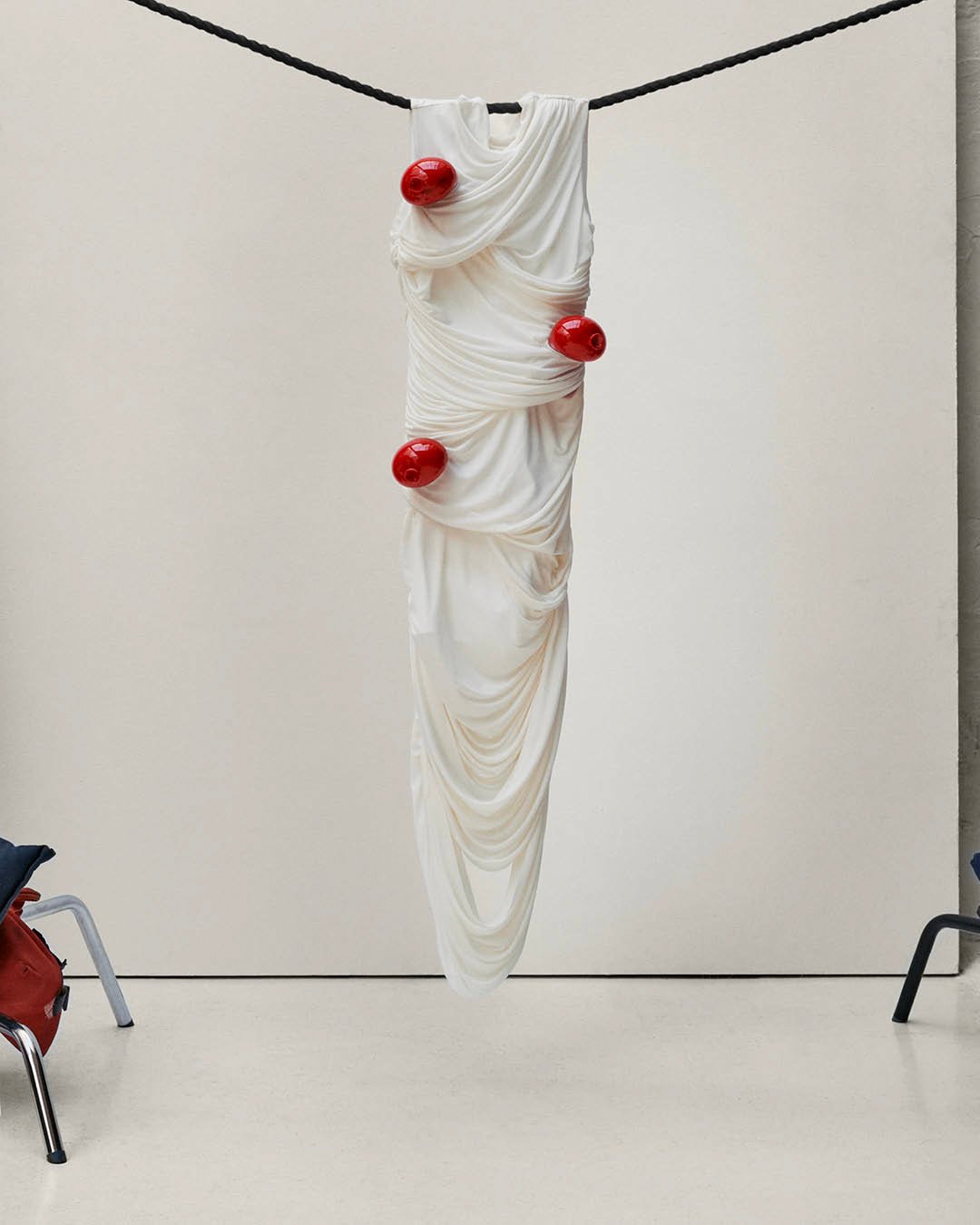 また、エルザ?スキャパレリ(Elsa Schiaparelli)風のトロンプルイユ(だまし絵)ドレスも、倒錯的ながらユーモアを感じさせる仕上がりに。今にも割れそうな風船のモチーフは、スリリングなアクセントとなっていた。