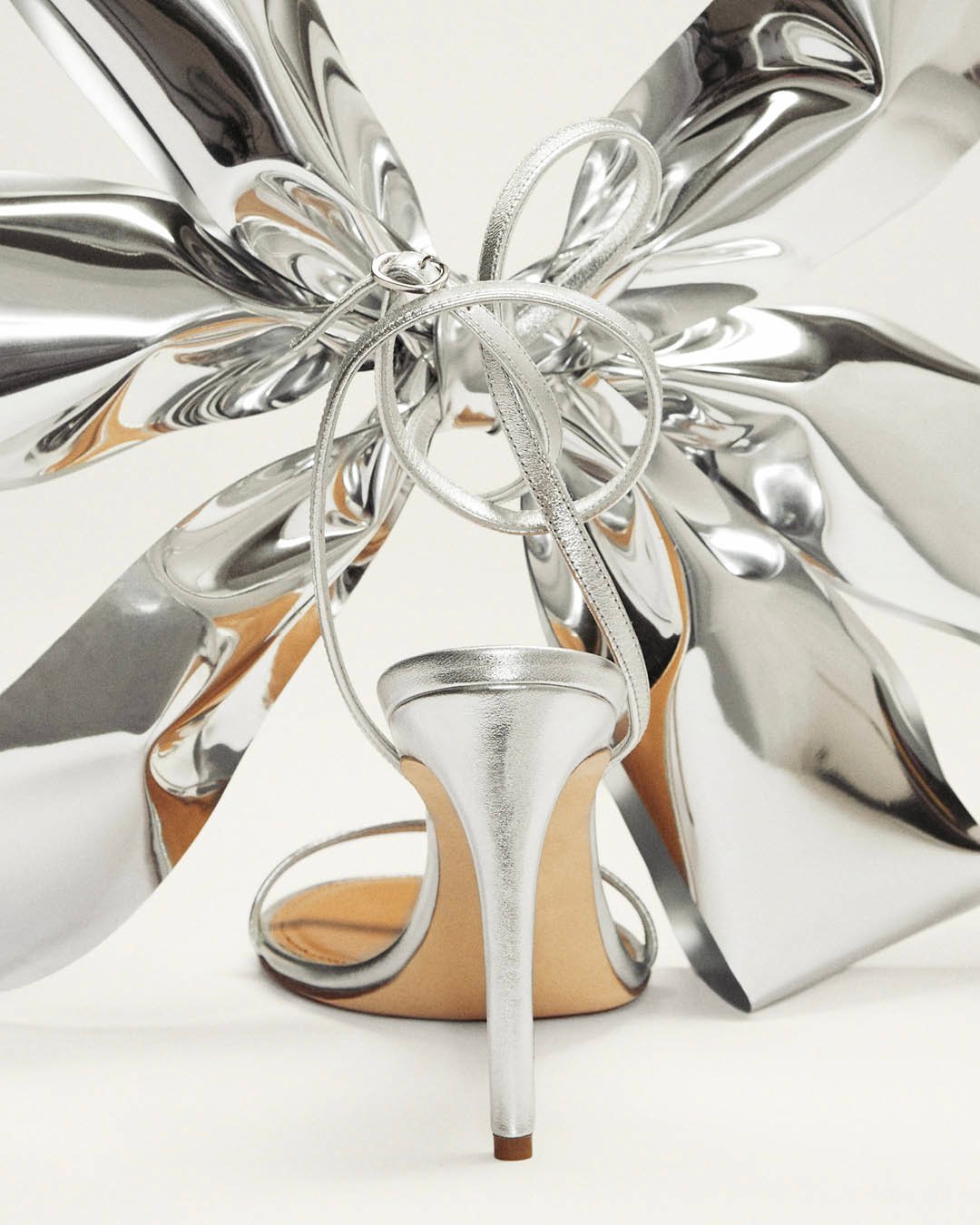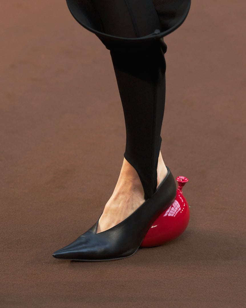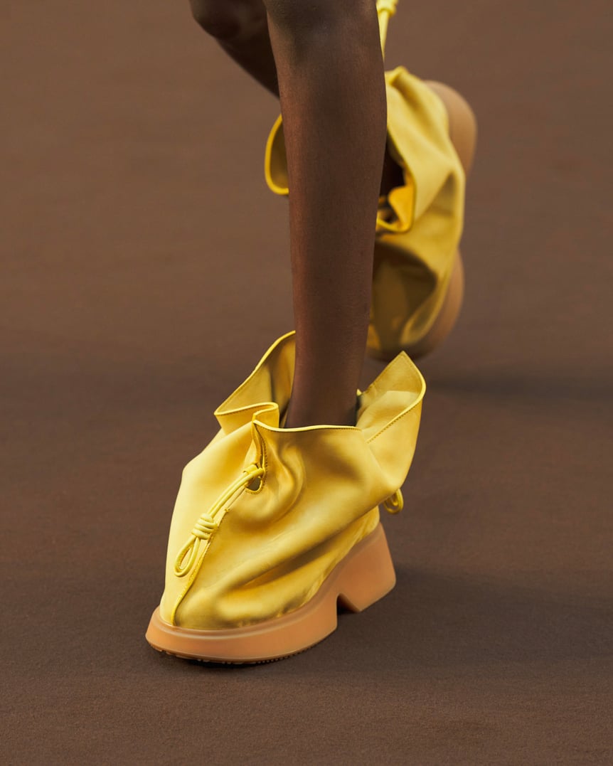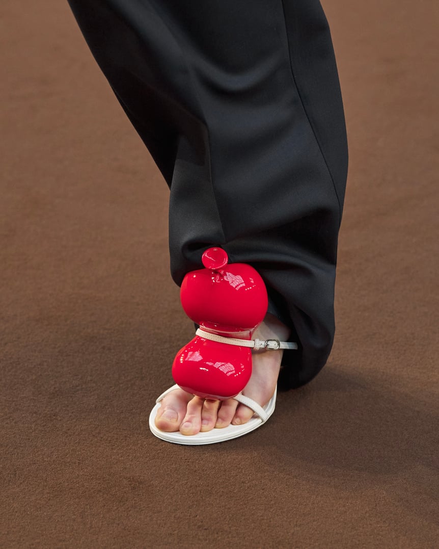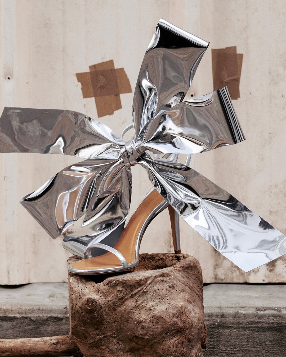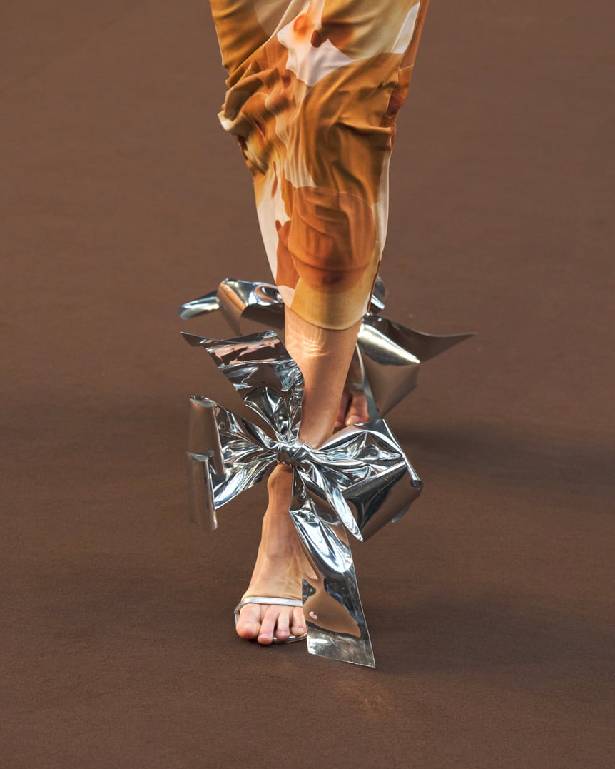 足元には、「フラメンコ」をそのまま履いたかのようなボリューミーなシューズをスタイリング。銀色の大きなリボンをあしらったサンダルも、違和感を与えながらも不思議なバランスを完成させていた。
