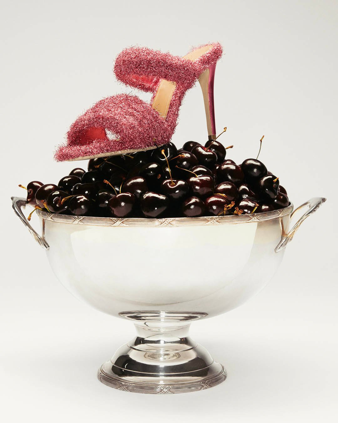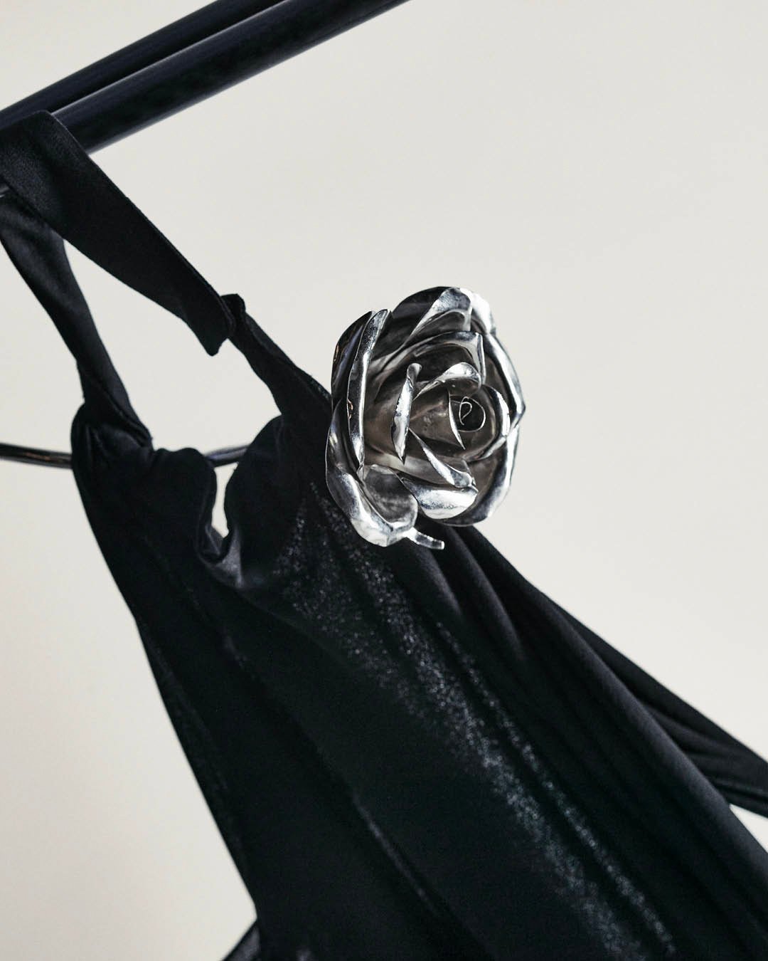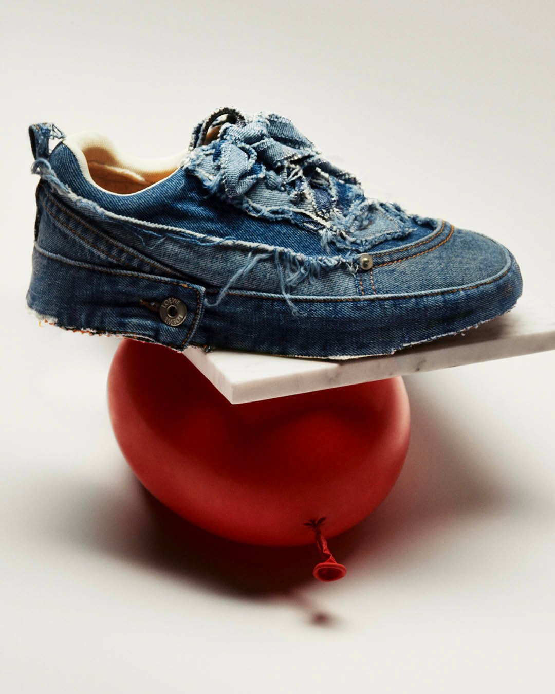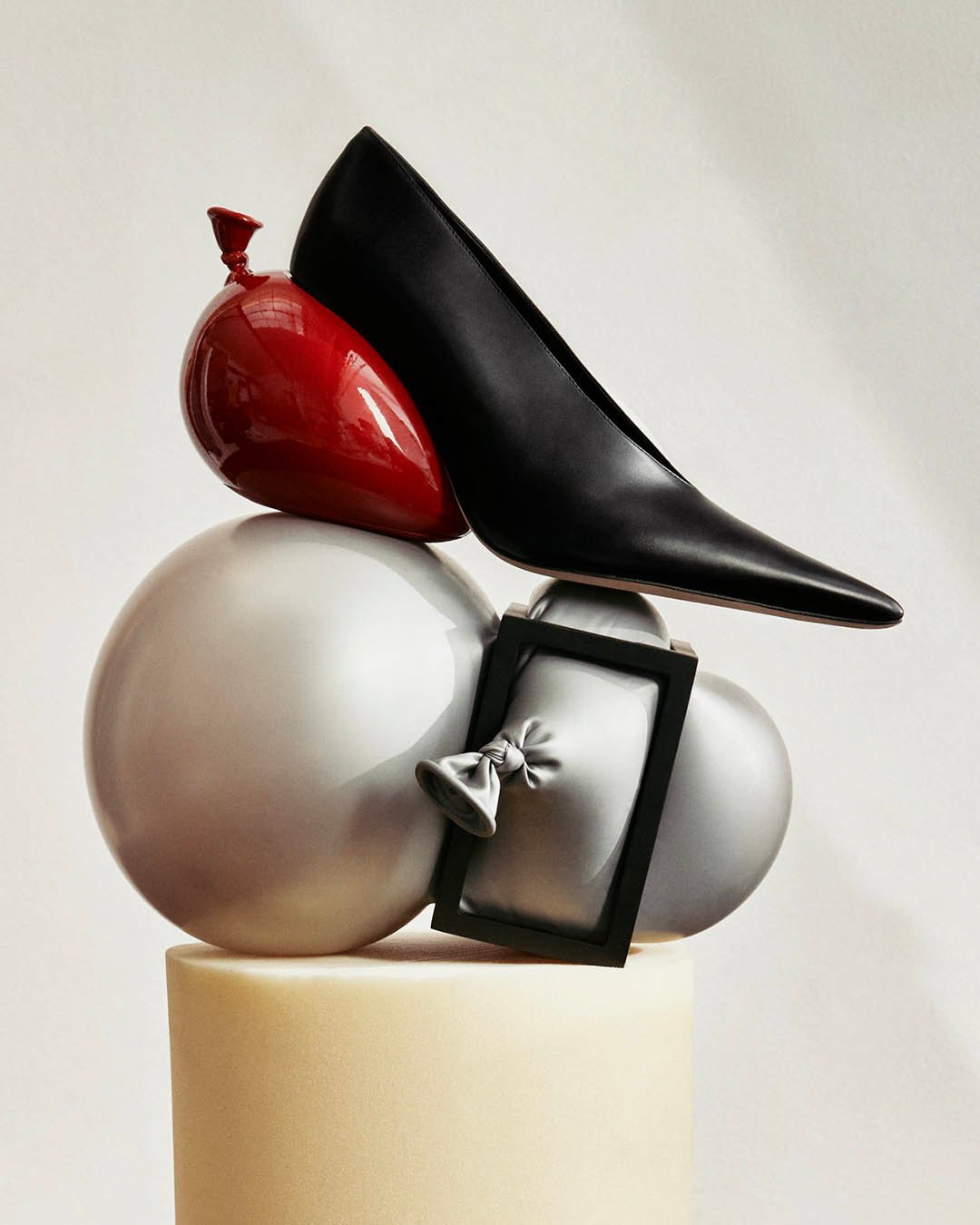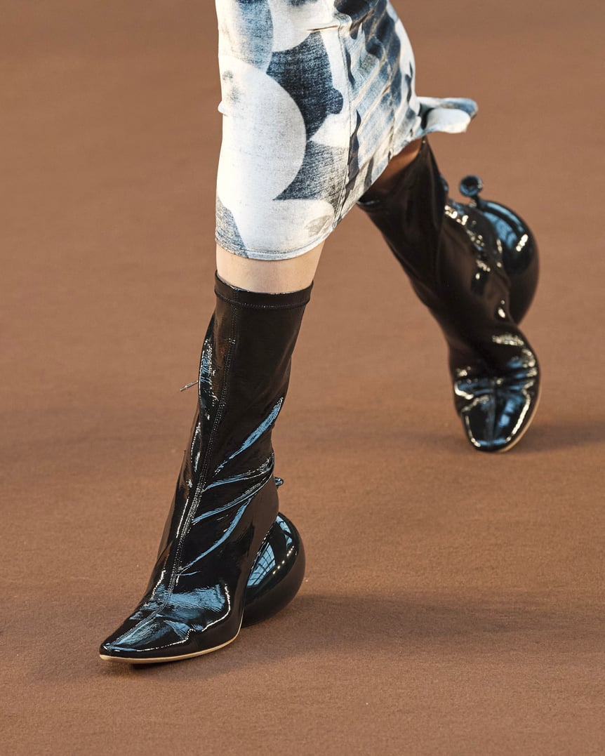 足元には、「フラメンコ」をそのまま履いたかのようなボリューミーなシューズをスタイリング。銀色の大きなリボンをあしらったサンダルも、違和感を与えながらも不思議なバランスを完成させていた。