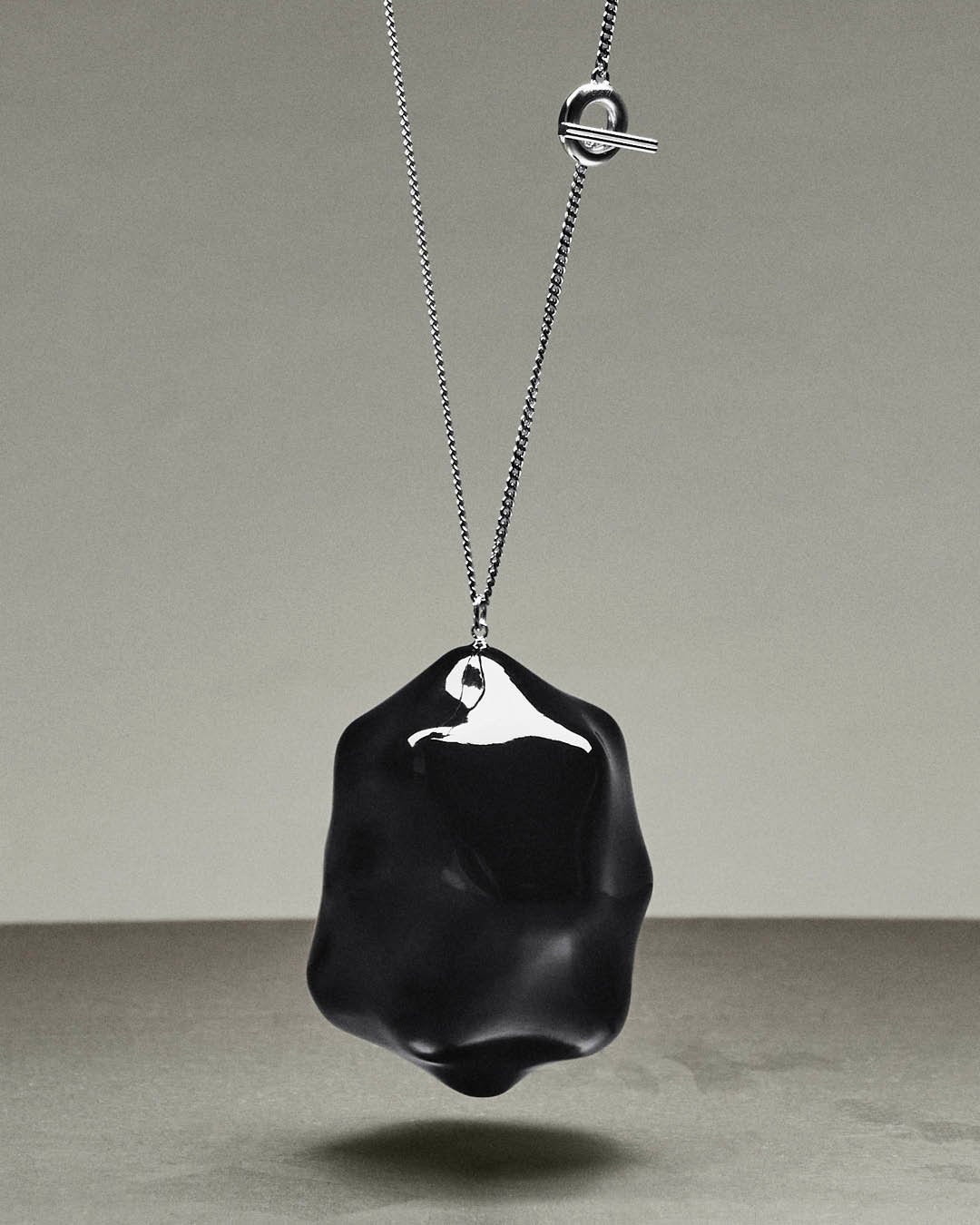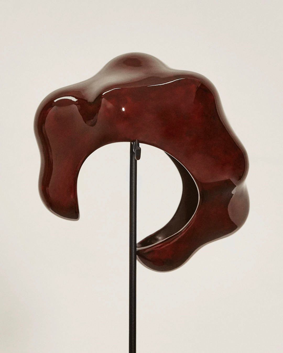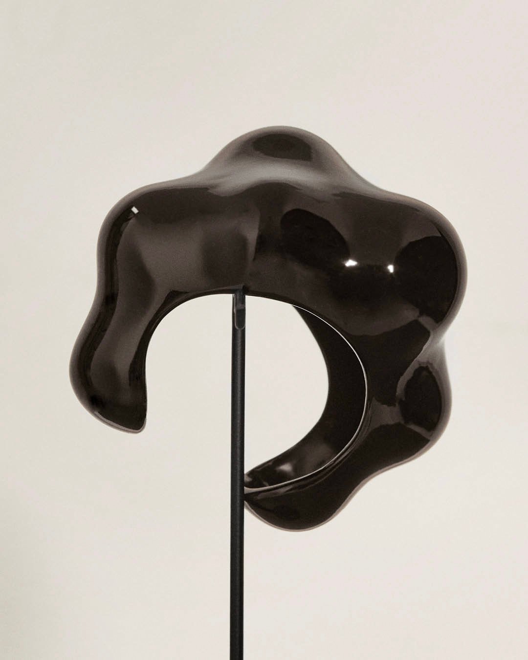 彫刻的なバッグやバングルなどを手がけたのは、京都在住の石塚源太。漆塗りの質感と触感を追求し、「薄膜の周辺にあるもの」をテーマに作品を制作している。ロエベ財団クラフトプライズにもノミネートされたアーティストだが、あらためてその才能に注目が集まりそうだ。