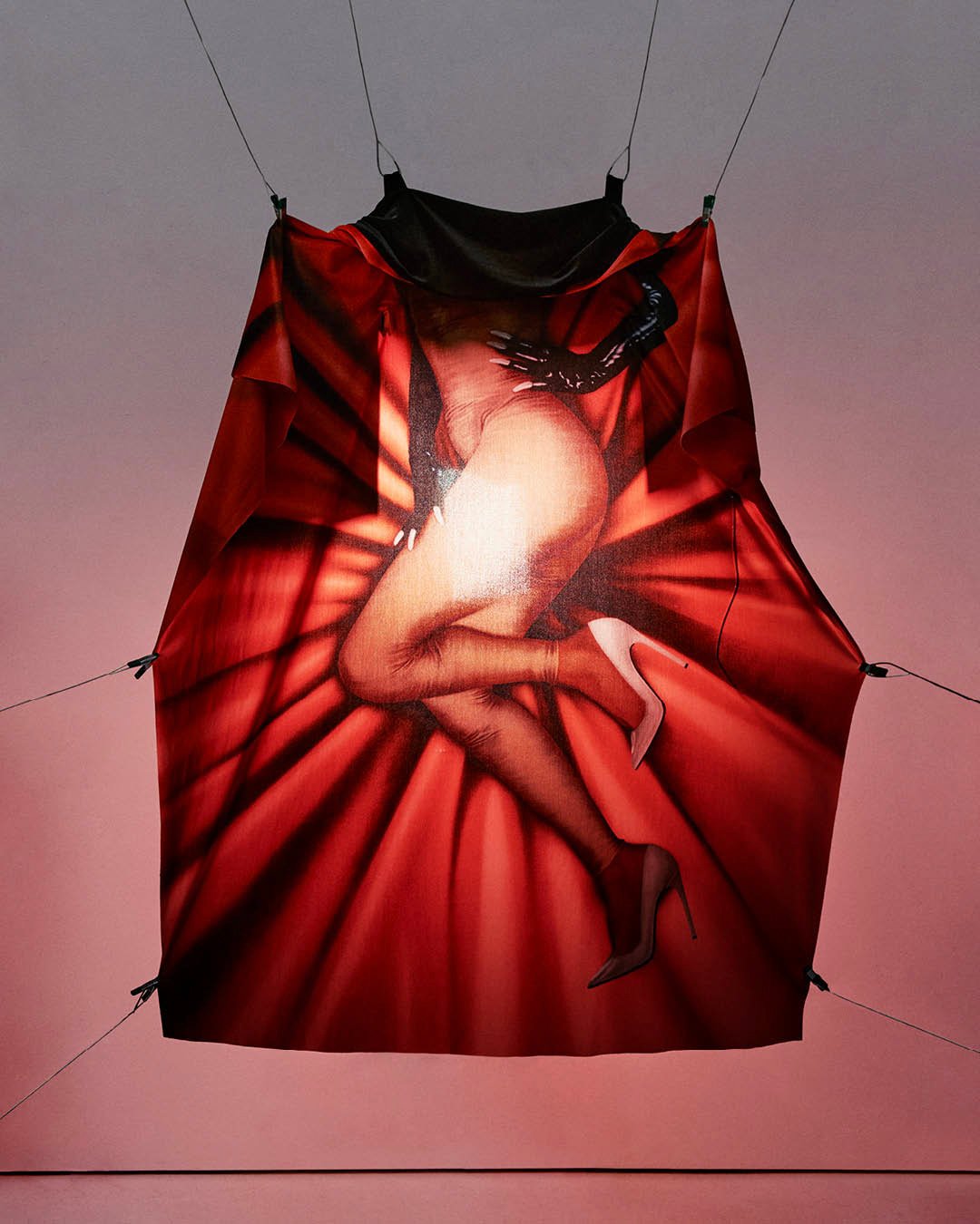 キーワードとなったのはシュールレアリスム(超現実主義。20世紀を代表する文学?芸術運動の一つ)。大きな唇の胸当てやハイヒールを布地の間に挟んだドレスは、マン?レイ(Man Ray)の世界観を彷彿とさせる。
