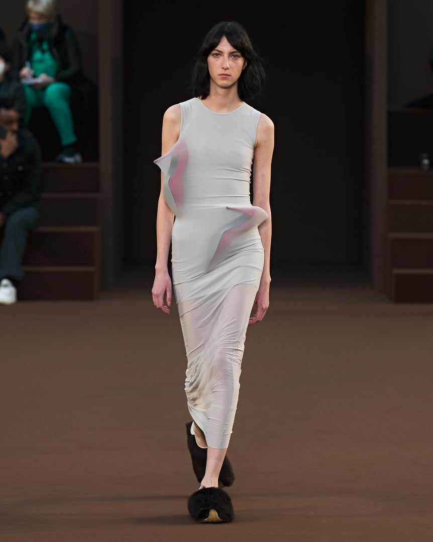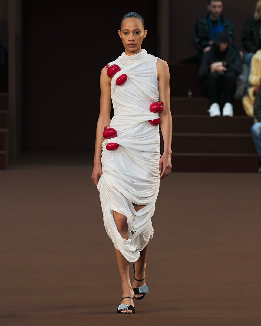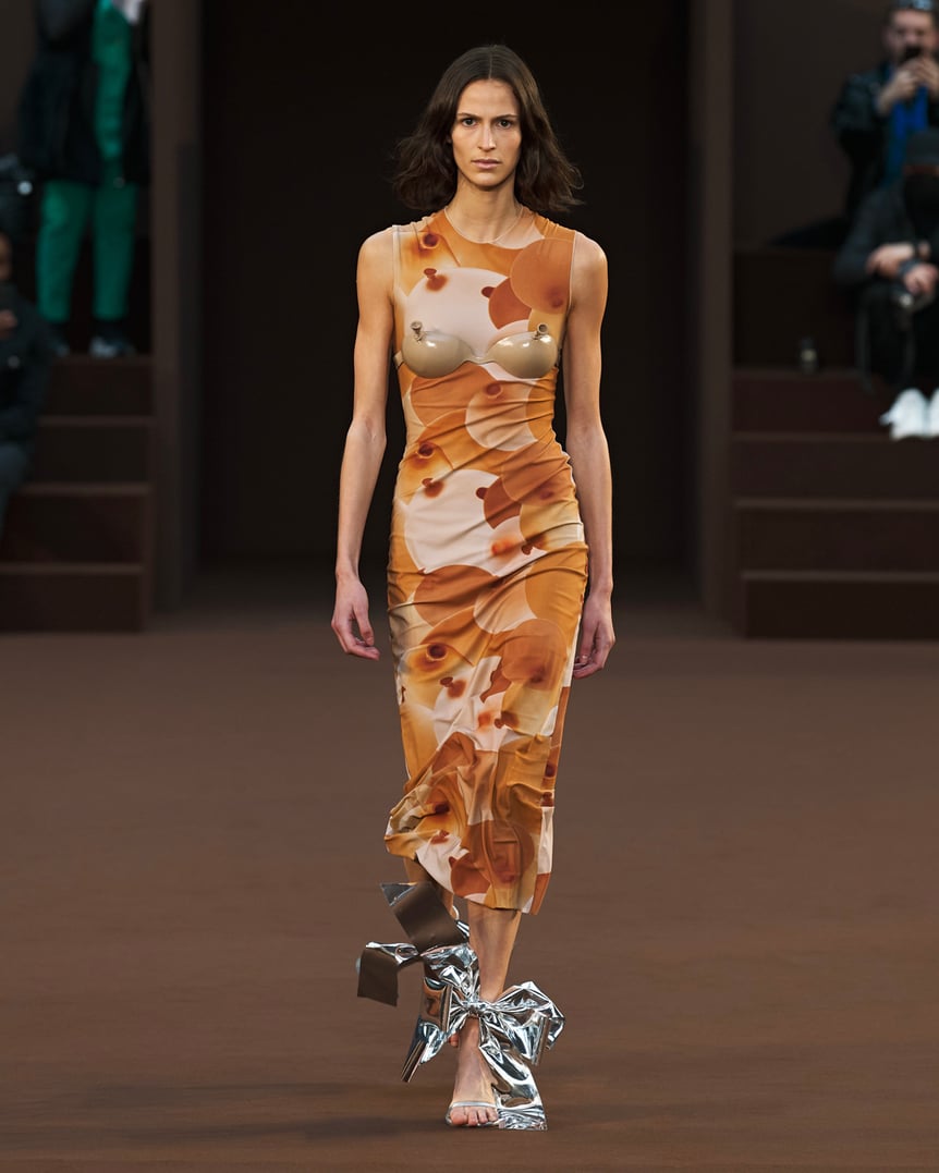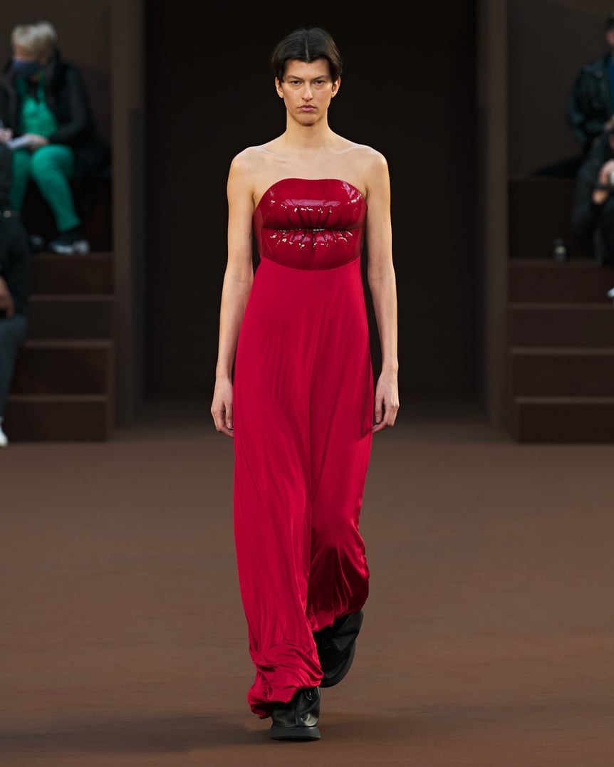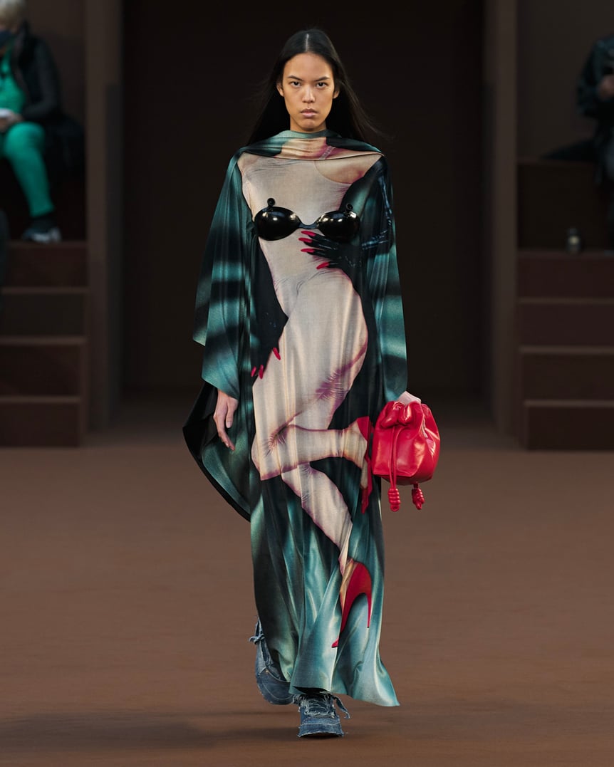 コレクションもカボチャのオブジェと同様に、思わず触りたくなるようなフォルムや素材使いが目を引いた。「リアクションを呼ぶファッション」とブランドが説明したとおり、ドレープをモールド成形したレザードレスや車をかたどったドレスなど、観衆をあっと驚かせる作品が続く。どれほどウェアラブルなのかは不明だが、ロエベが得意とする「芸術的なクラフト」のさらなる進化を印象付けた。