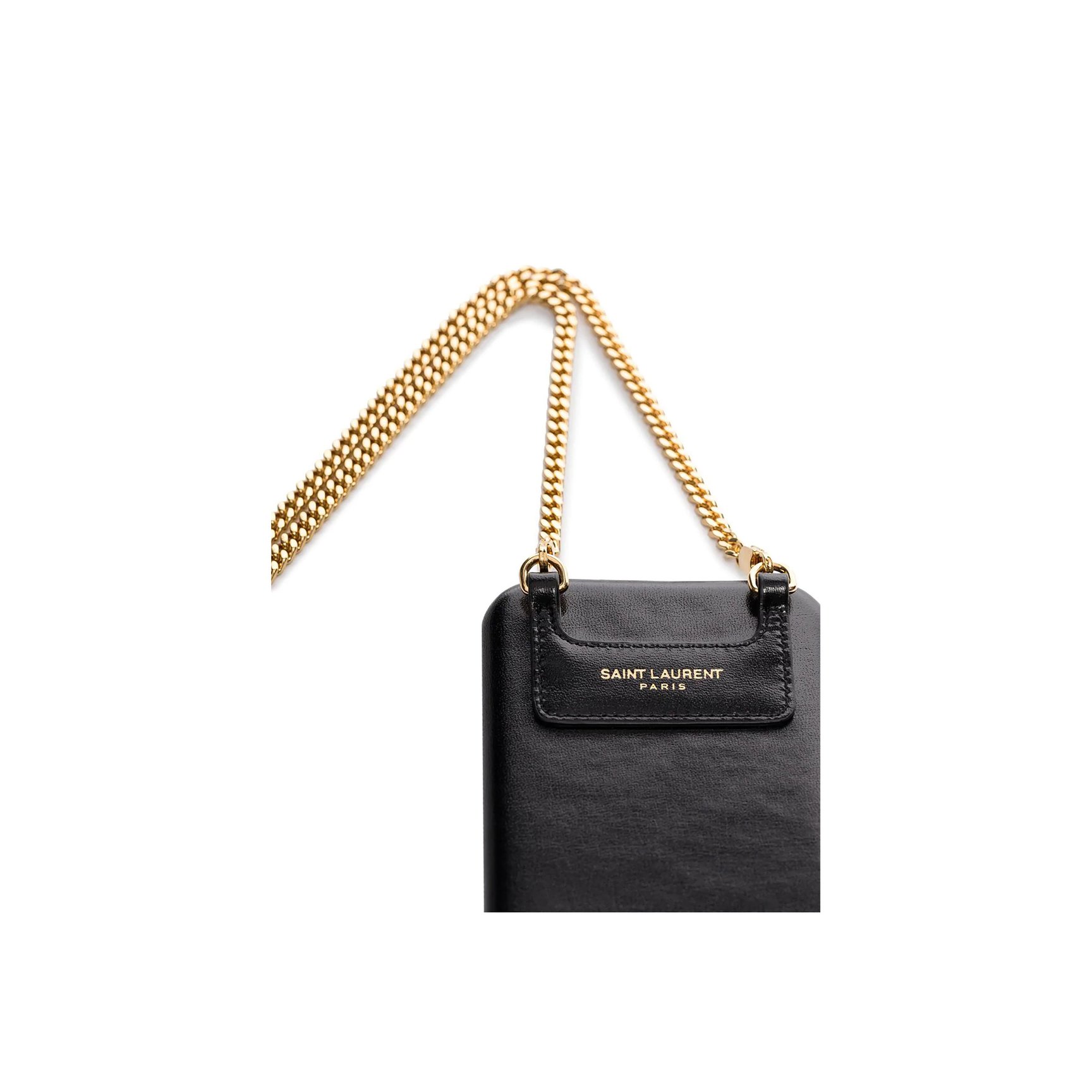 「サンローラン(SAINT LAURENT)」から紹介するのは、同ブランドらしいカフレザー&ゴールドチェーンのアイフォンケース。艶めくブラックのスムースレザーに配されるのはゴールドに輝くブランドロゴ。取り外し可能な長めのストラップチェーンをお気に入りのウエアにアクセ感覚でクロスして、スタイリングにエッジを効かせて。