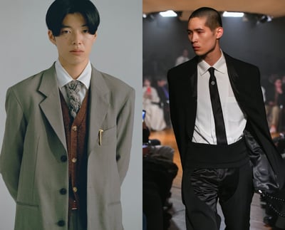 西洋における服づくりは、身体をいかに立体的に見せるかという点に主軸が置かれてきた。しかし日本では、身体そのものではなく、人間の動きや仕草を引き立てるように布に量感を与え、動作に呼応して布の表情を変化させる発想が根づいている。「ソウシオオツキ」のスーツは、まさにその日本的な美意識を、西洋のフォーマルウェアというフォーマットに重ねることで成立している。