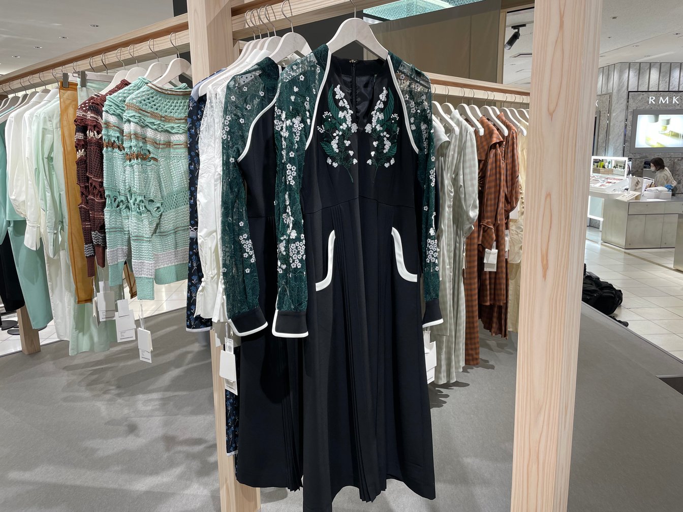 特別なイベントに対する同ブランドの想いは、ポップアップストアのアイテムラインナップにも反映されている。今回のポップアップに合わせて三越伊勢丹限定で展開されるエクスクルーシブアイテムは、過去のコレクションの中から7点のアイテムを黒河内自身がセレクト。素材やカラー、パターンをアップデートして特別に製作された。中でも、スズラン柄の刺繍が胸元にあしらわれたドレス(23万1000円)は、顧客からの再販のリクエストが多いアイテムで、今回のポップアップに合わせて、刺繍の色と裾丈を再構築するなどして展開されている。また、2023年春夏コレクションのランウェイショーで登場した「履物 関づか」とのコラボレーションによる履物(4万2900円)を、独占先?販売。「服をラインナップするだけではなく、服以外のものも何かお客様に持ち帰っていただきたい」という想いから、2023年春夏コレクションテーマ「Bamboo Groove」をイメージした琥珀糖の和菓?(4320円/すべて税込)を数量限定で販売している。