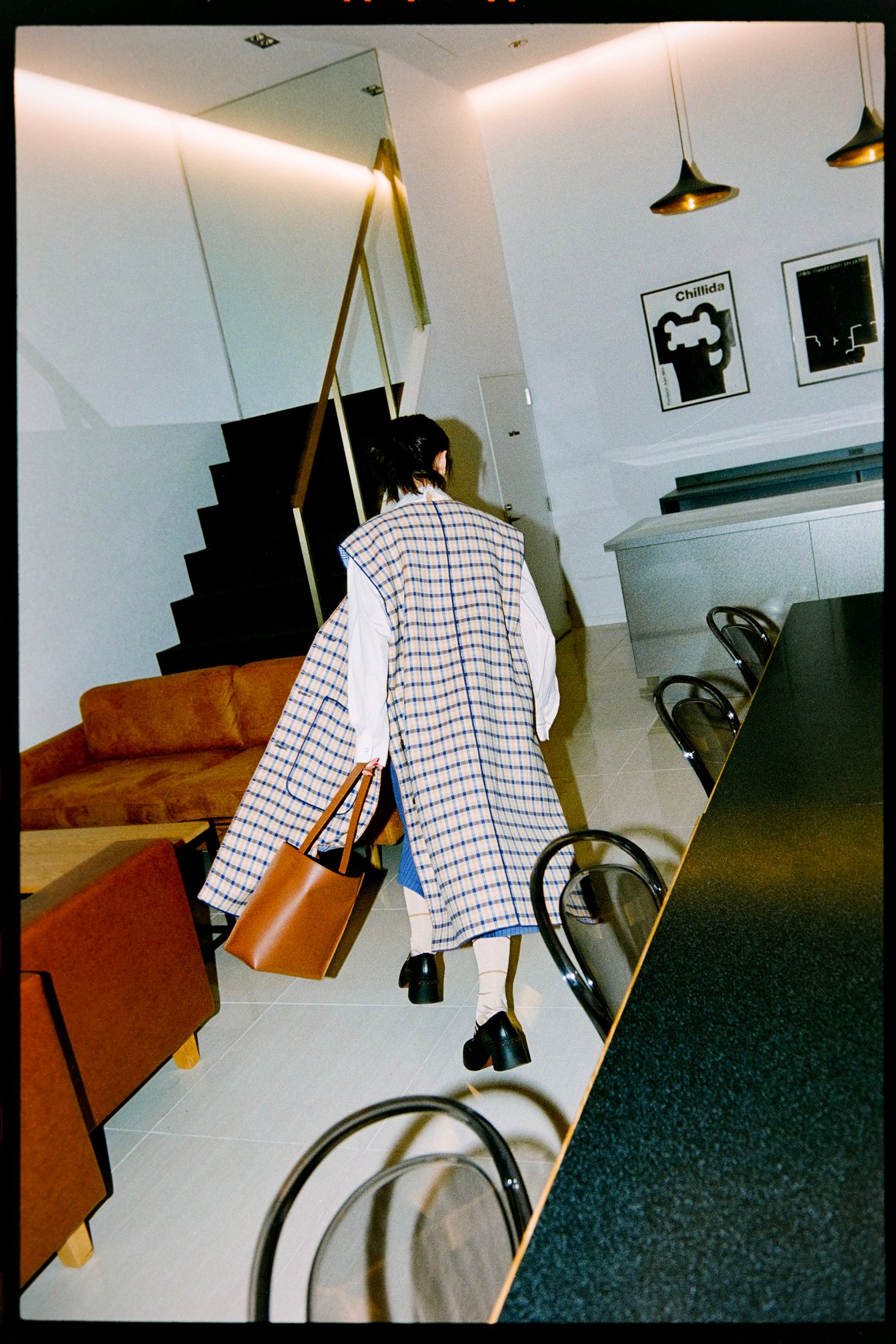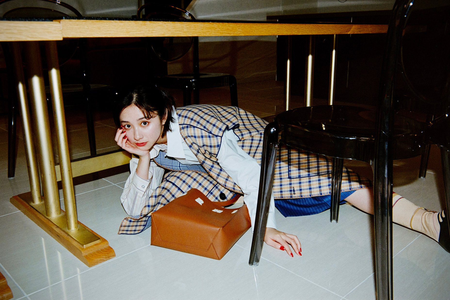 堀田さん着用:チェックリバーシブルジレ 34万9800円、シャツ 11万9900円、ブルーストライプキュロットパンツ 13万8600円、ソックス 1万5400円、「PABLO」トリプルバックル メリージェーン シューズ 12万8700円、「MUSEO」ホーボーバッグ(H28×W26×D11cm)モカ/アイボリー 22万9900円