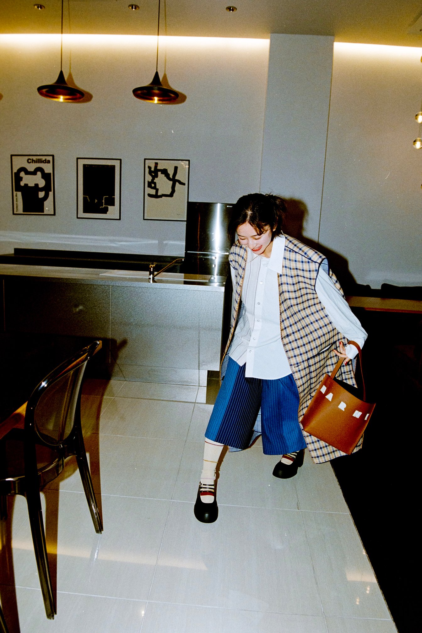 チェックウールを使用したリバーシブルジレにカラーブロックのキュロットパンツをまとって、軽快な春のスタイルが完成。「MUSEO」ホーボーバッグの中に忍ばせるのは、人気のウォレット。マルニのアイコンデザインである「メンディング」シリーズと、シンプルで洗練されたデザインの「プリズマ」シリーズには日本限定カラーが登場。爽やかなシーグリーンとオパールはこれからのシーズンにぴったりな心踊るカラー。