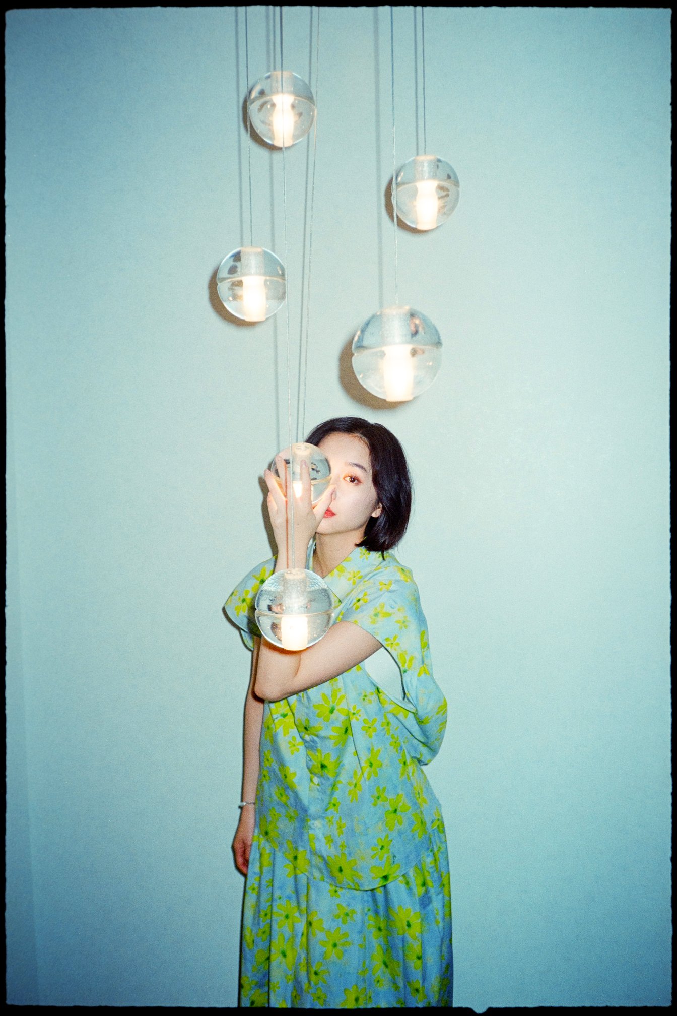 堀田さん着用:「PARADE」プリント コクーンシャツ 10万7800円、「PARADE」プリントハイウエストスカート 12万8700円、「BUBBLE」サンダル 12万4300円、リングモチーフブレスレット 6万2700円、「JANUS」バッグスモール(H31×W48×D17cm)ライム 14万7400円(※先行発売)