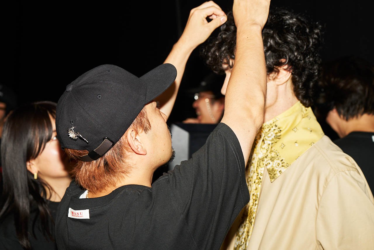 「今回のイベントはランウェイショーではないですが、それ以上にランウェイを感じられるかもしれません」。後藤は本イベントの告知時にそう発信した。その答えはコレクションノートにある「ファッションの魅力は非常に立体的で、体験的で、アナログで、偶然で、出会いであり、対話であること」という言葉に詰まっている。モダンであるからこそ、突き放さずに親密であり続けることができる。時間を定めずにあらゆる時間軸の作品群を掻い摘み、進化を加えてく。ただし、時は現在に設定する。モダンであることの意味が問われる昨今、後藤は確実に、そして自由に自らの創作を前に推し進めている。プレゼンテーションを終えると、後藤自ら大木に乗り、平日に遥々来場してくれた人たちに向けてプレゼントを用意。来場時にスタッフパスを配布し、そこに書かれている数字からランダムに当選者が発表され、壇上に上がって、後藤から受け取る粋な計らい。この時間に多くの時間を割き、時々質問に答えながら、ひとりひとりと対話を重ねる。イベント終了後には、後藤と写真を撮りたいMASU BOYSが長蛇の列を作った。前々から記してきたが、彼が描出するランド的な景観は、ファッションにおける新たな付加価値になり得るだろうし、体験を共にしながら、「僕」ではなく「僕たち」であることに執着する後藤のデザイナーとしての性質が最後まで滲み出ていた。