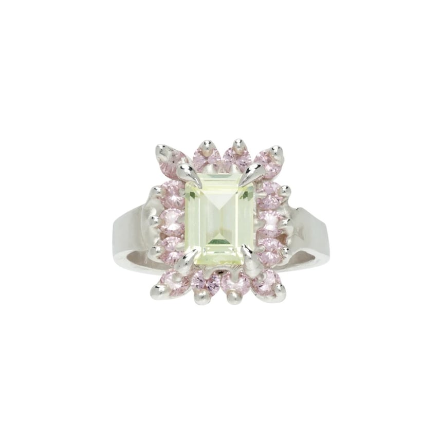 淡いグリーンの大きなクリスタルの周りにピンクのジルコニアが連なる、華やかなデザインのリング。フレッシュなカラーパレットなので、カジュアルなスタイルともマッチします。