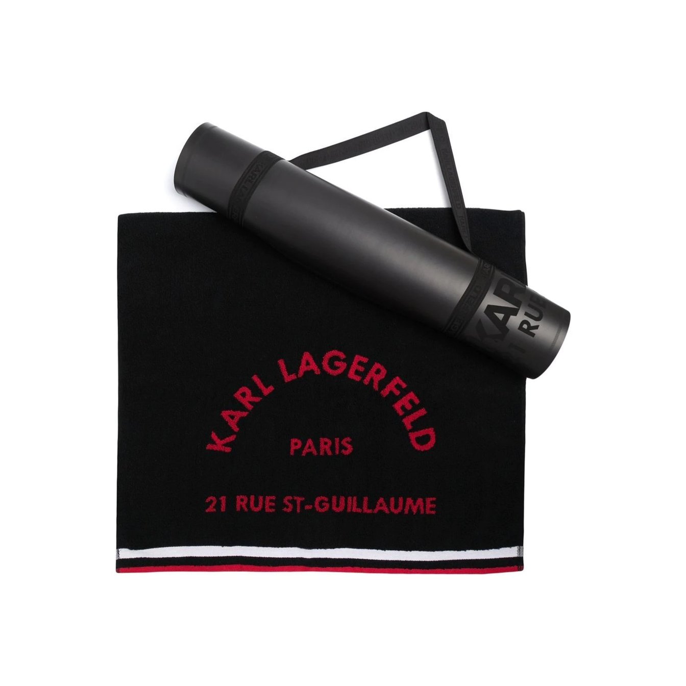赤字のロゴがアクセントになった「カール?ラガーフェルド(Karl Lagerfeld)」のヨガセット。丸めた状態のマットもスタイリッシュなので、インテリアの雰囲気を損ないません。便利なロールマットとタオルのセットで、ヨガ以外のストレッチやワークアウトにも。