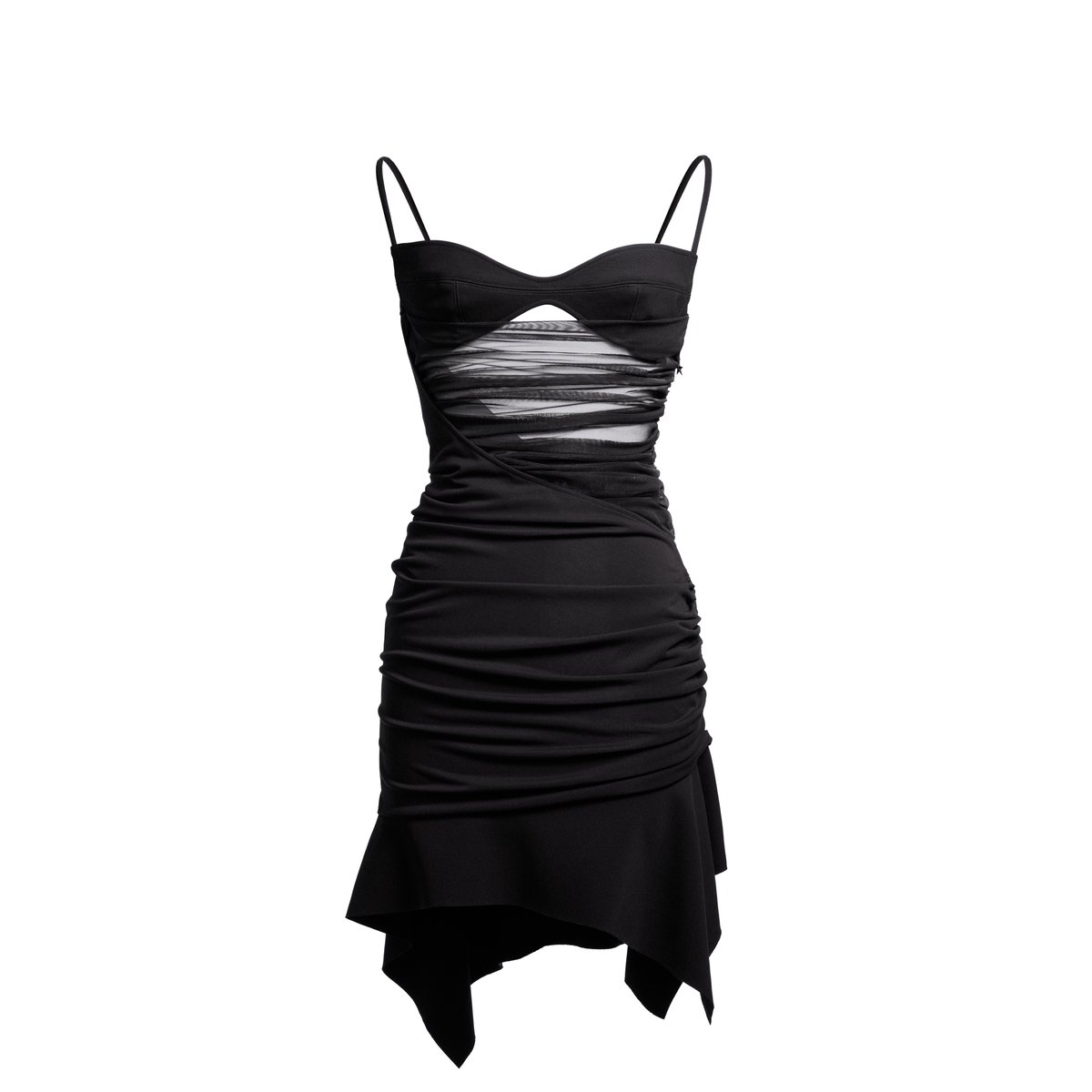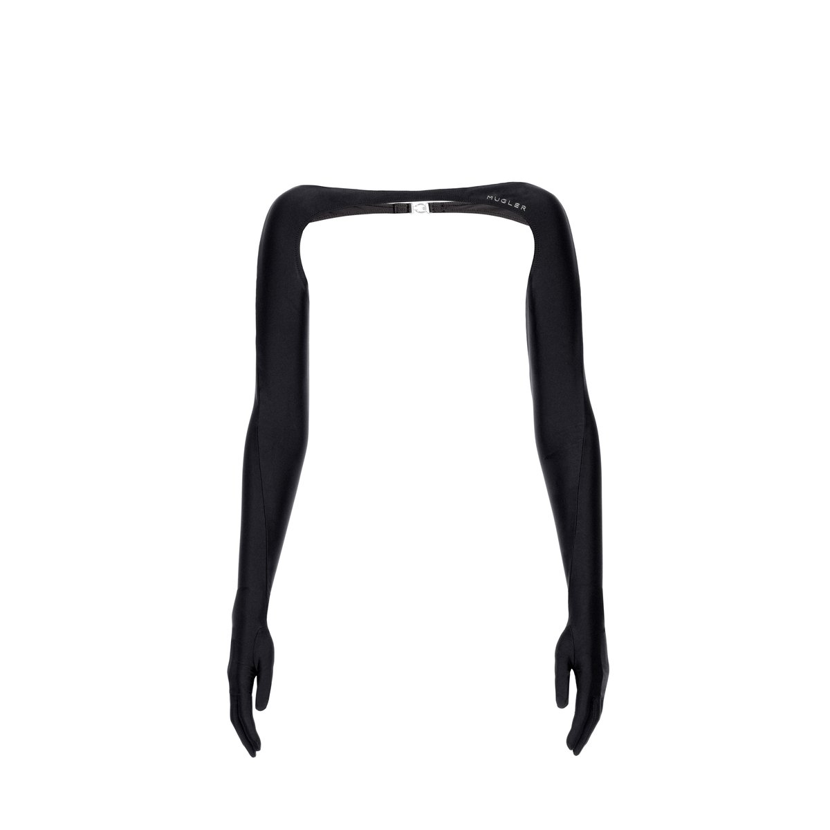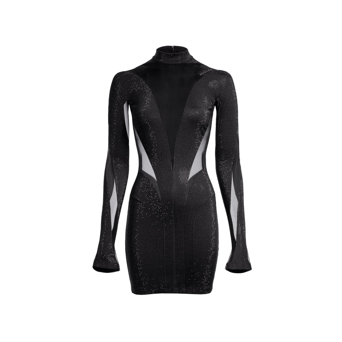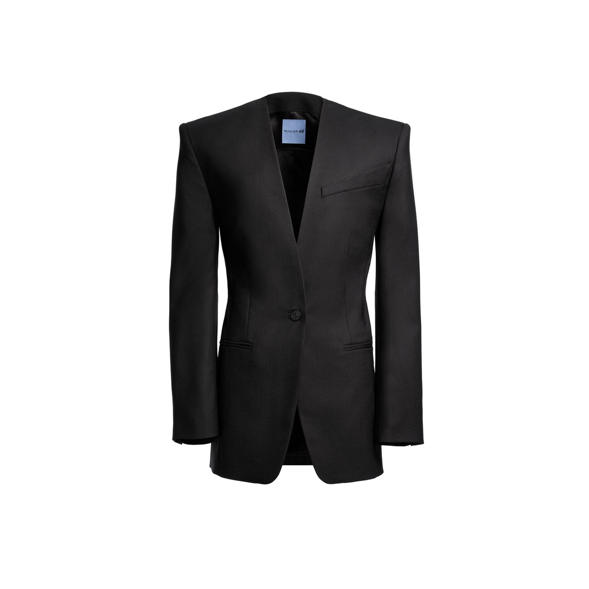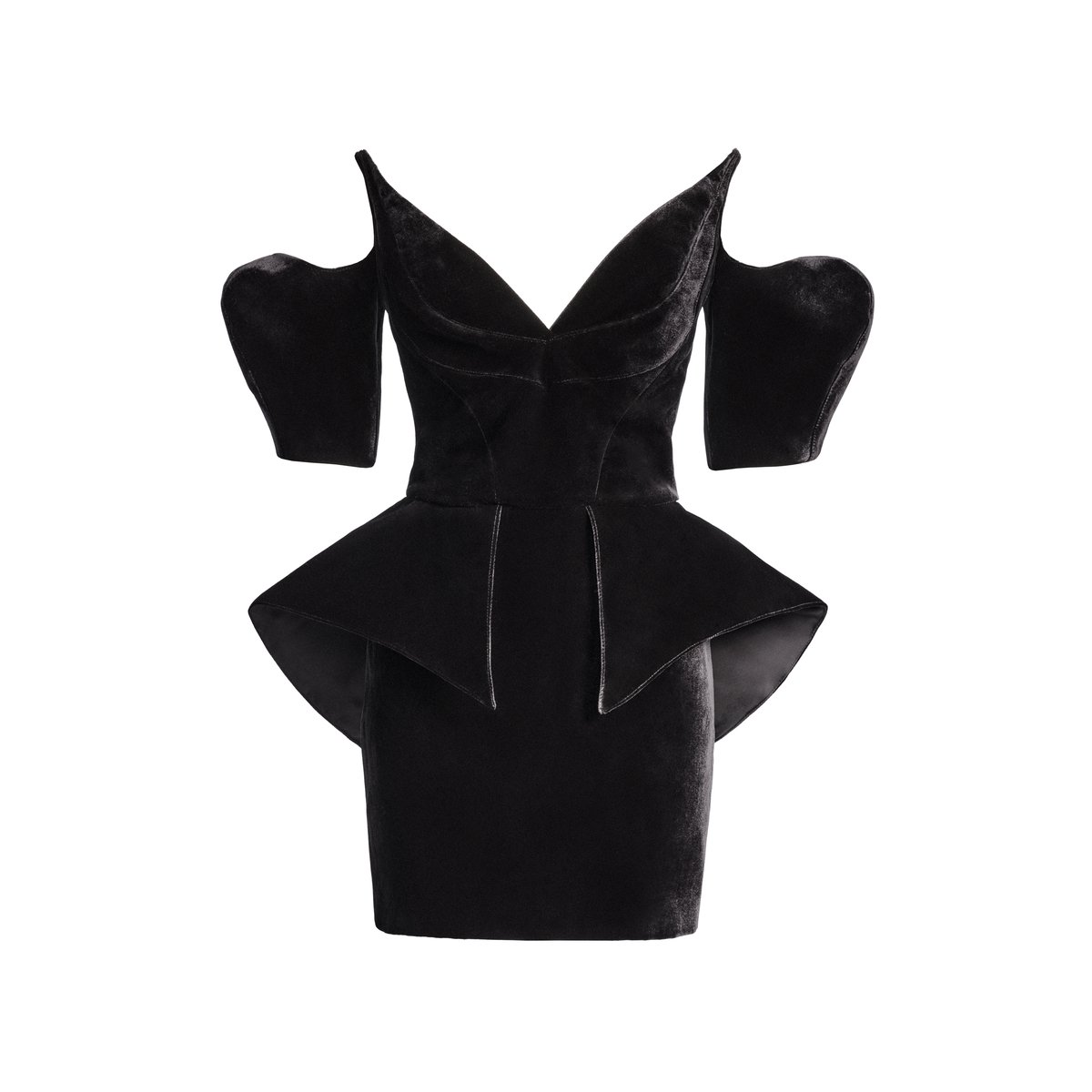 ドレスでは、ミュグレーの代表的なスタイルとも言えるグローブ付きのドレスをはじめ、ウエスト部分のシースルーパネルが特徴的なブラトップ付きのブラックドレスや、硬質なウール素材で引き締まったウエストとパッドが施されたヒップで美しいフォルムを形作っているブラックミニドレス、ライムとブラックのハイネックミニドレス、ブラックとクラインブルーのコルセットドレスなど10型を展開。中でも注目は、アーカイヴコレクションである、1990年代に流行し、現在ヴィンテージアイコンとして注目を集めているブラックベルベットドレスと、1990年代後半に発表され、透け感のあるメッシュパネルが付いたレースアップロングブラックコルセットドレスの2型です。