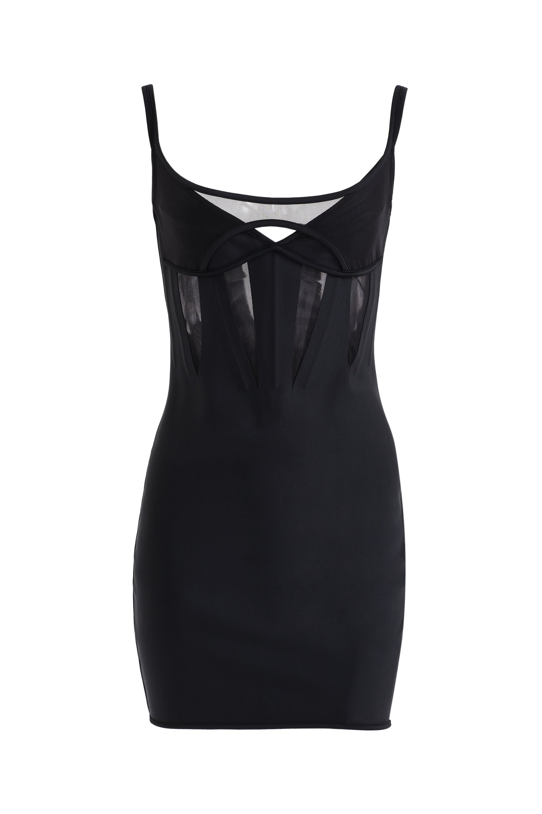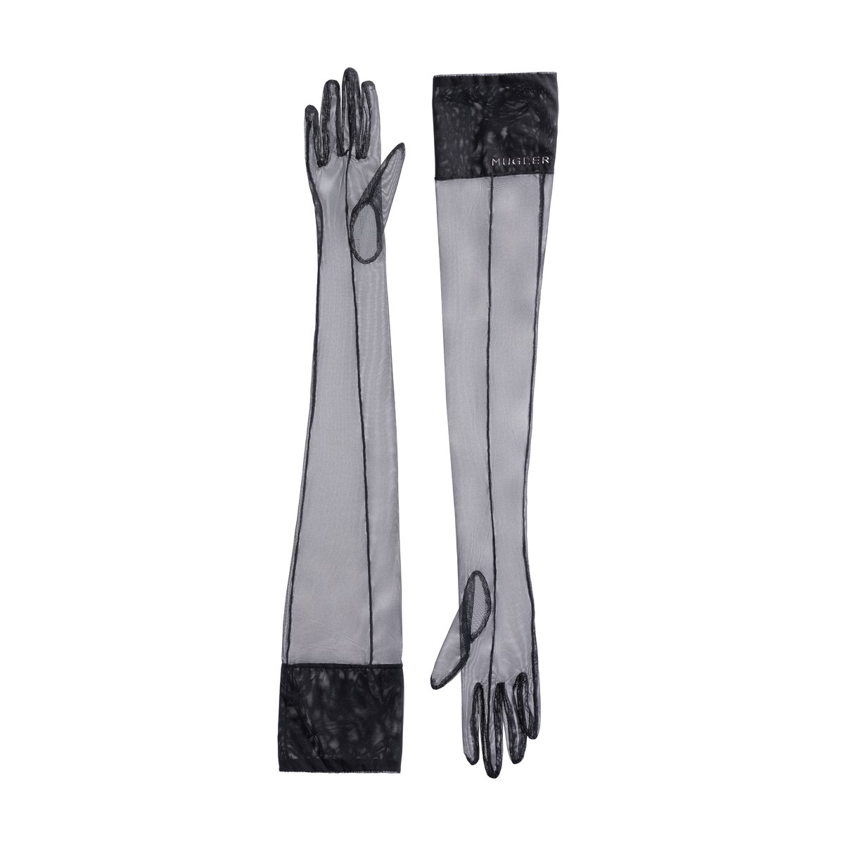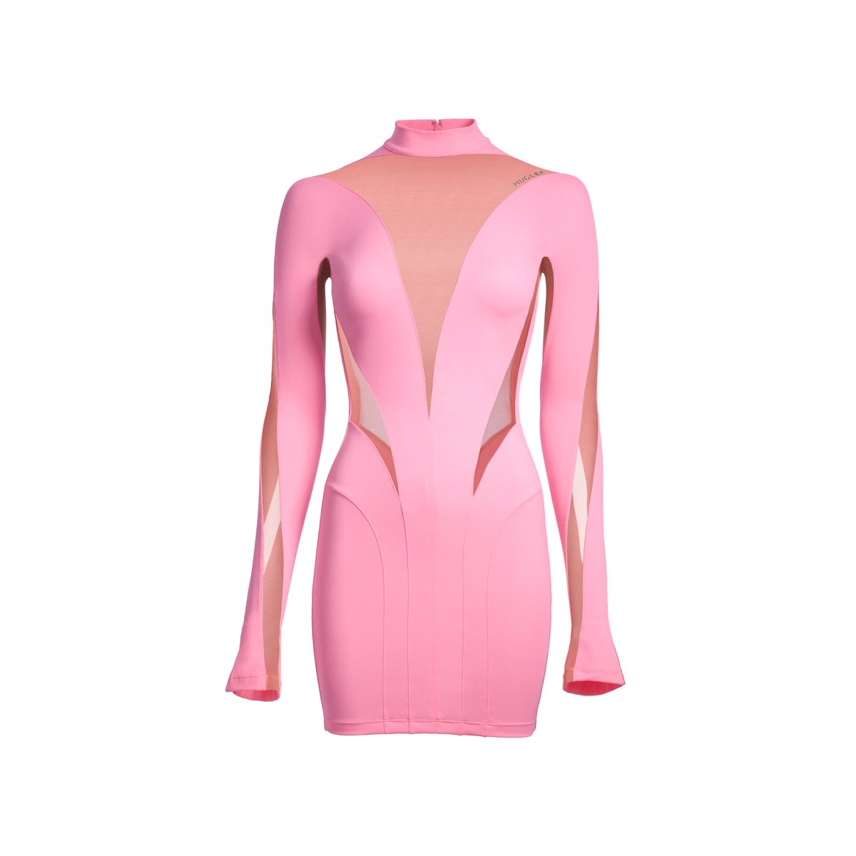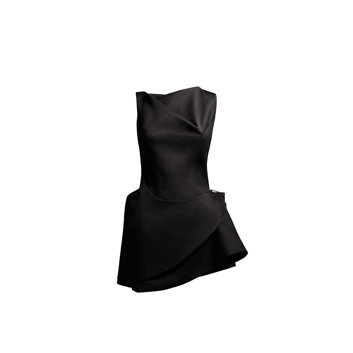 ドレスでは、ミュグレーの代表的なスタイルとも言えるグローブ付きのドレスをはじめ、ウエスト部分のシースルーパネルが特徴的なブラトップ付きのブラックドレスや、硬質なウール素材で引き締まったウエストとパッドが施されたヒップで美しいフォルムを形作っているブラックミニドレス、ライムとブラックのハイネックミニドレス、ブラックとクラインブルーのコルセットドレスなど10型を展開。中でも注目は、アーカイヴコレクションである、1990年代に流行し、現在ヴィンテージアイコンとして注目を集めているブラックベルベットドレスと、1990年代後半に発表され、透け感のあるメッシュパネルが付いたレースアップロングブラックコルセットドレスの2型です。