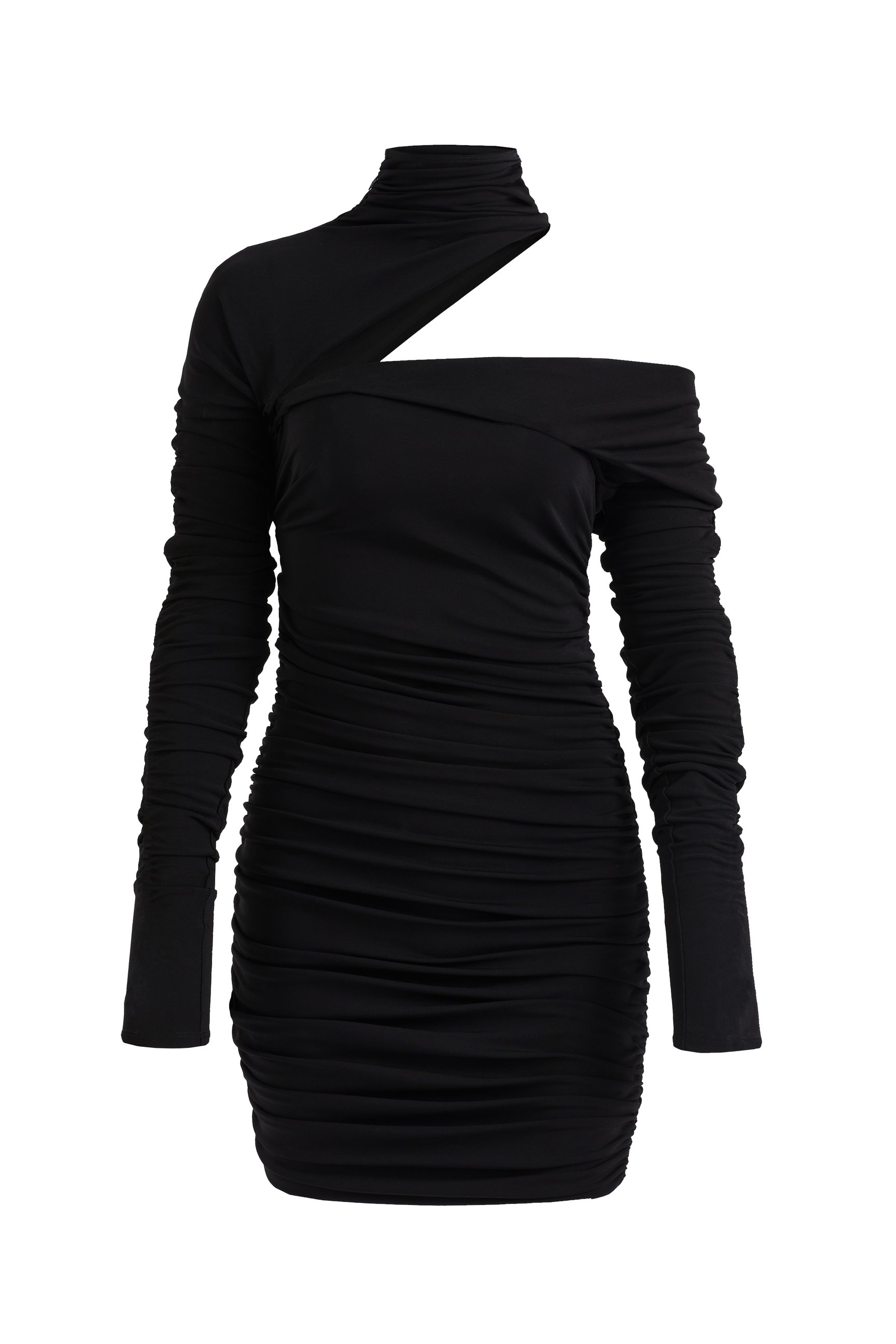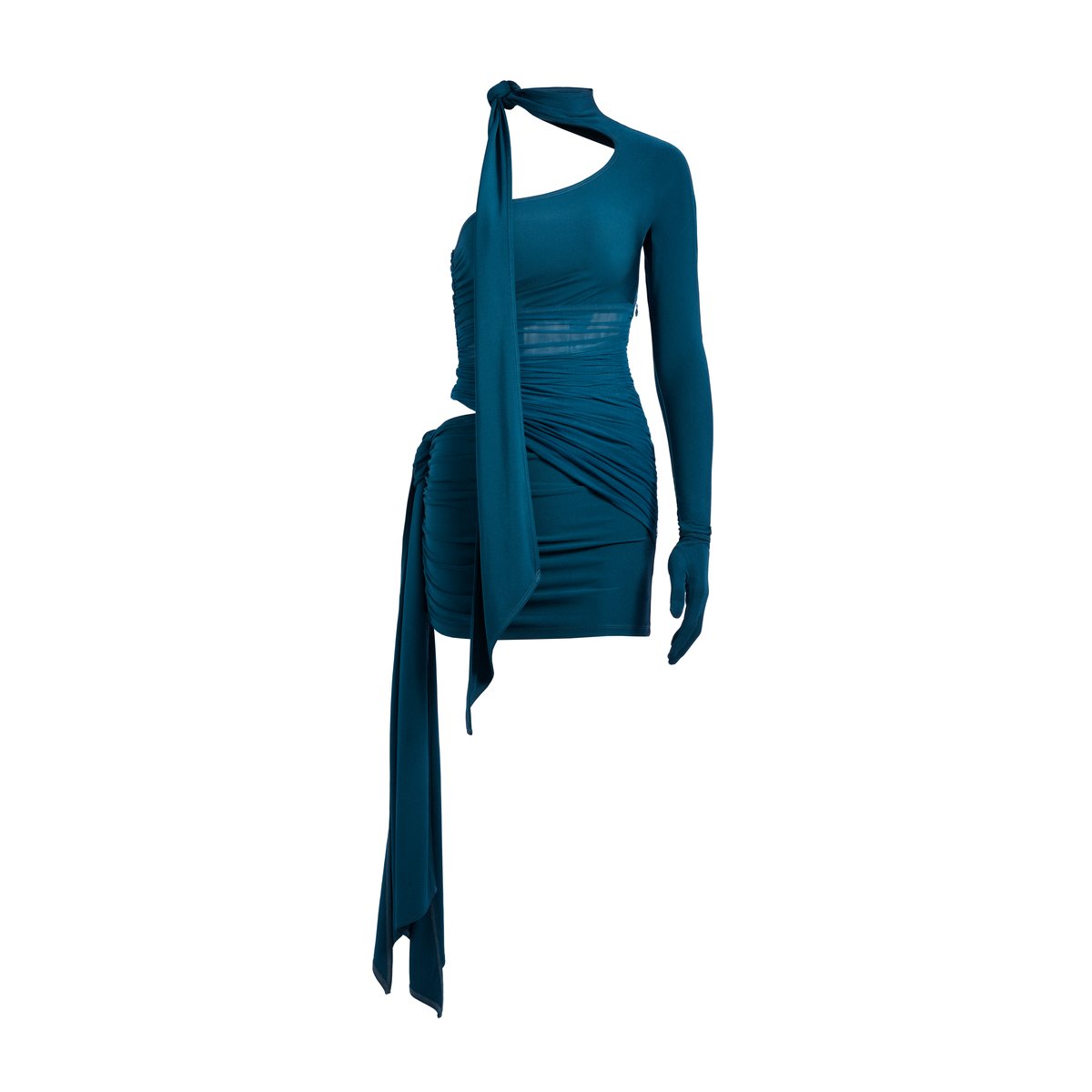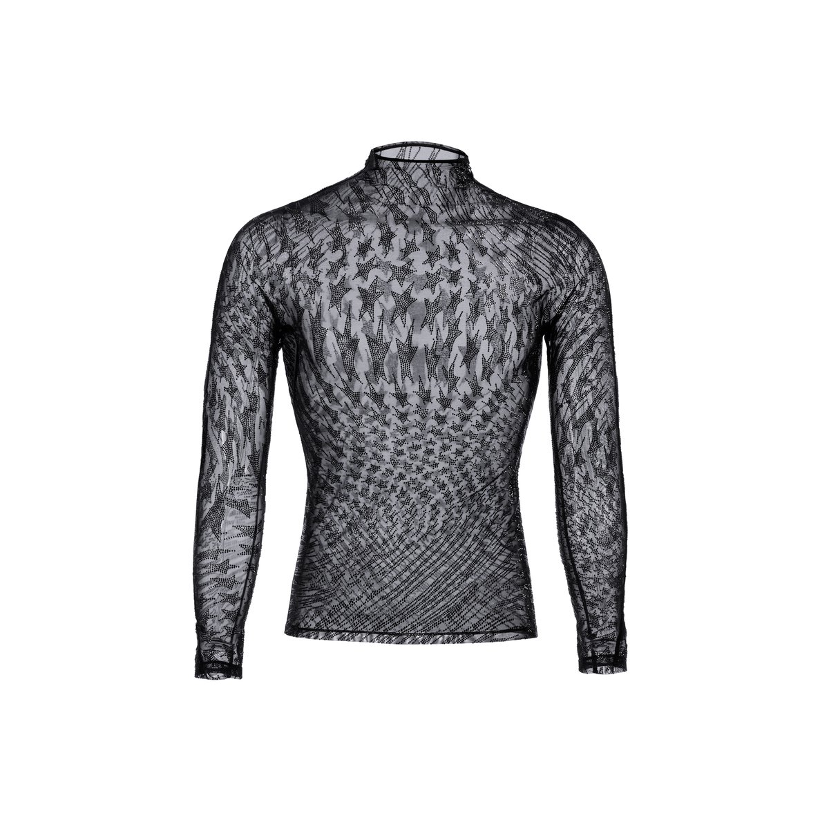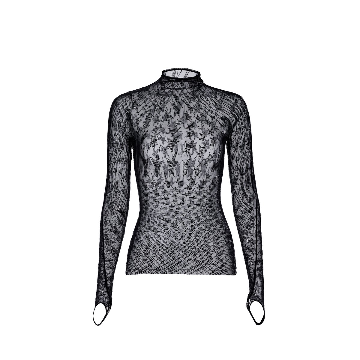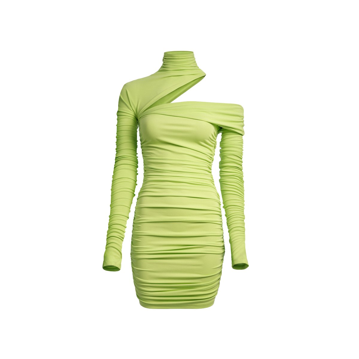 ドレスでは、ミュグレーの代表的なスタイルとも言えるグローブ付きのドレスをはじめ、ウエスト部分のシースルーパネルが特徴的なブラトップ付きのブラックドレスや、硬質なウール素材で引き締まったウエストとパッドが施されたヒップで美しいフォルムを形作っているブラックミニドレス、ライムとブラックのハイネックミニドレス、ブラックとクラインブルーのコルセットドレスなど10型を展開。中でも注目は、アーカイヴコレクションである、1990年代に流行し、現在ヴィンテージアイコンとして注目を集めているブラックベルベットドレスと、1990年代後半に発表され、透け感のあるメッシュパネルが付いたレースアップロングブラックコルセットドレスの2型です。
