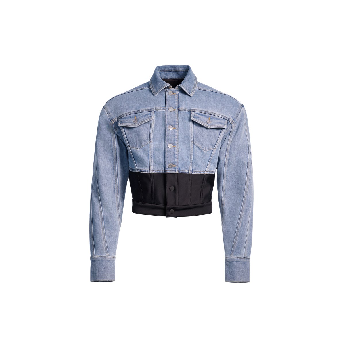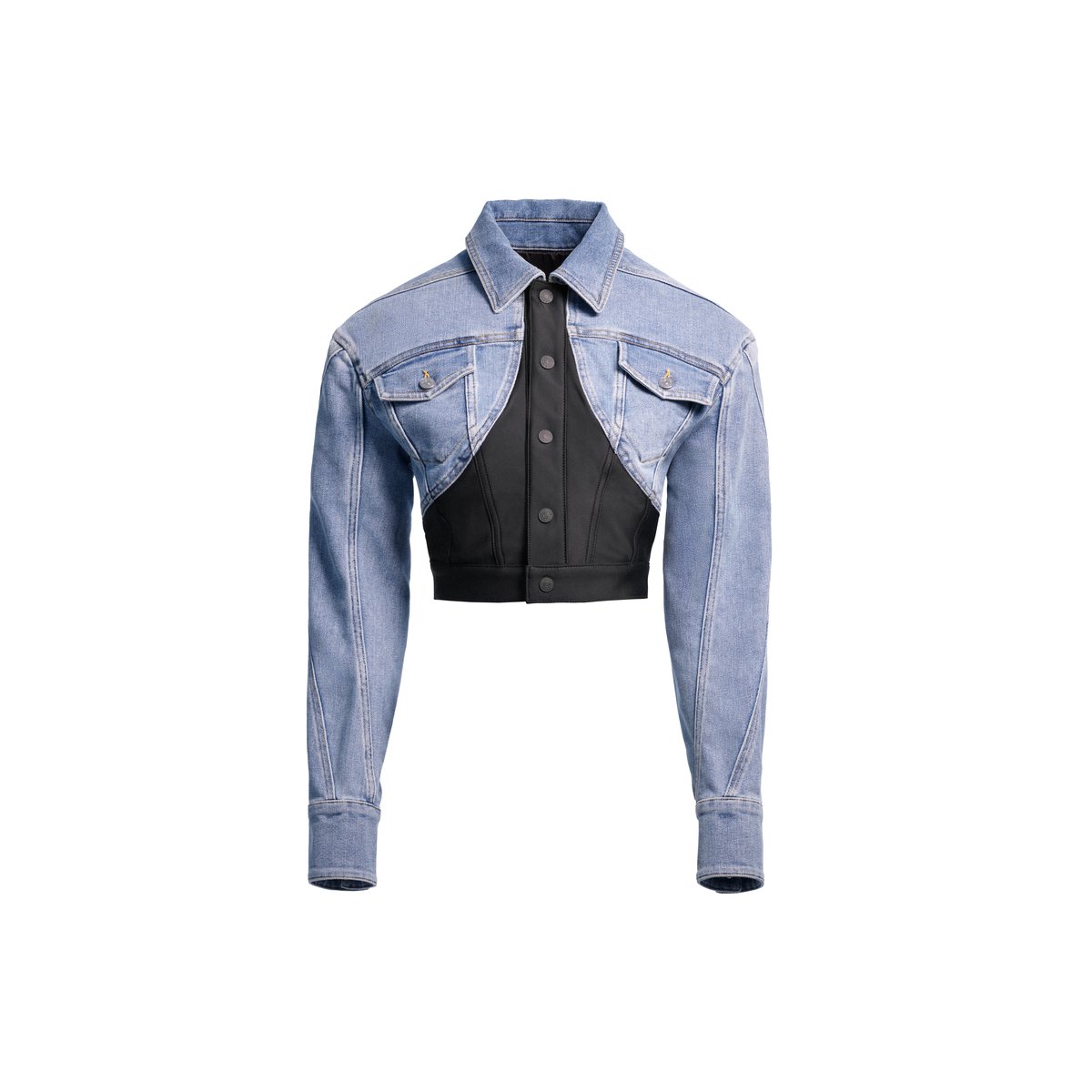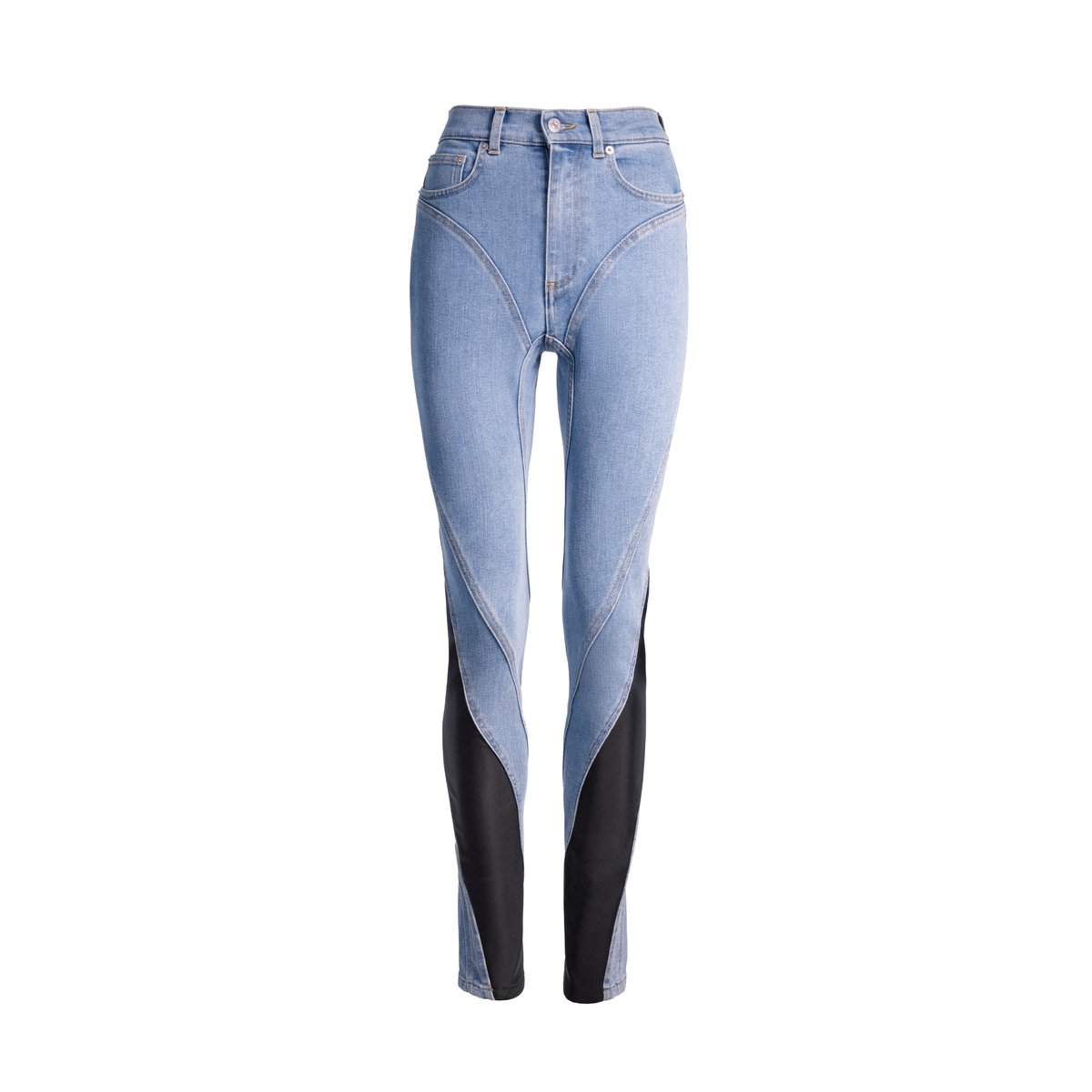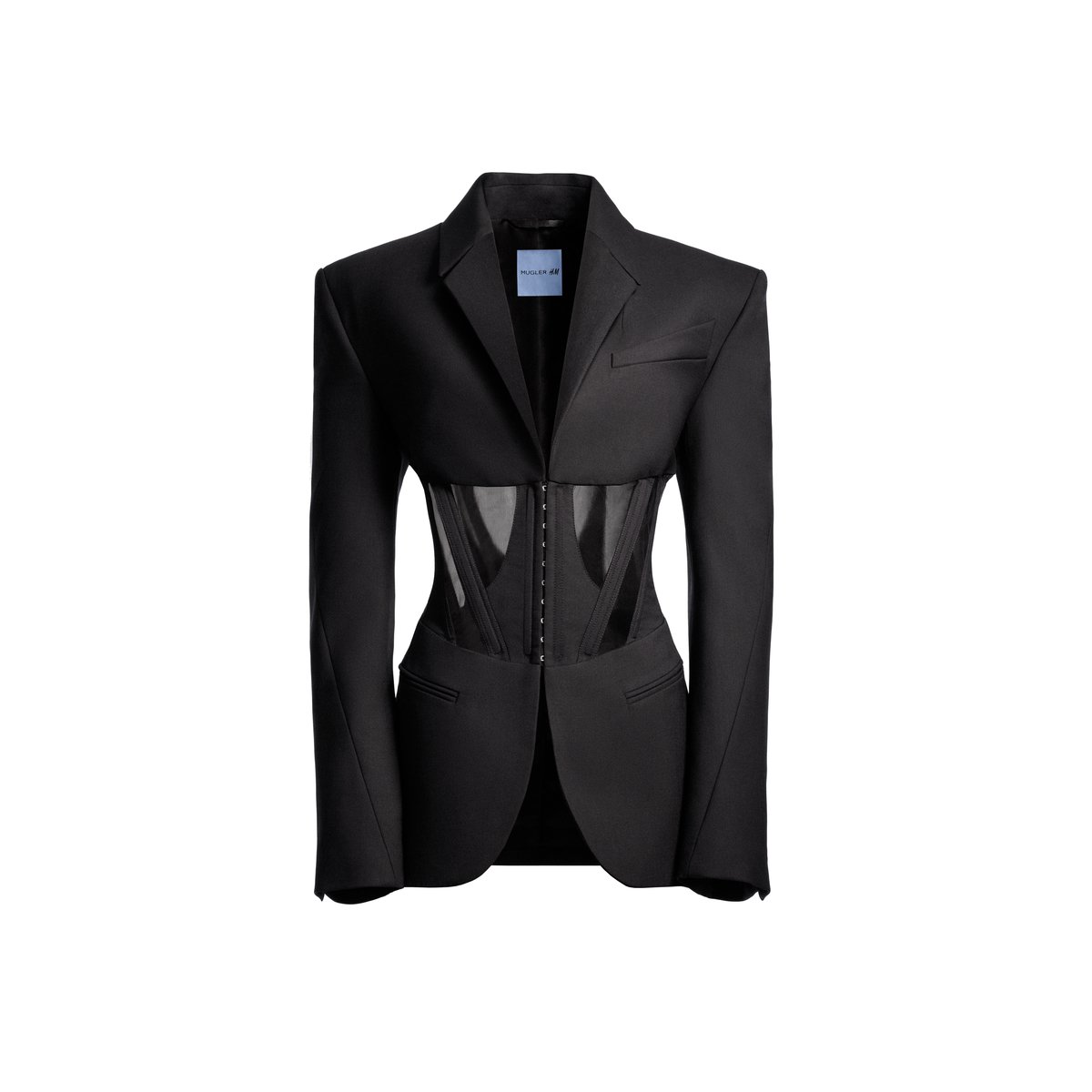 コレクションの中でも注目なのは、ミュグレーのアイコンであるデニムパンツ。ブラックナイロンが重ねられており、バックに施されたTバックのディテールは、リフトアップ効果をもたらします。ミニスカートは、長く伸びたウエストバンドをベルトのように使用することができ、ジャケットとのセットアップを楽しむことができます。