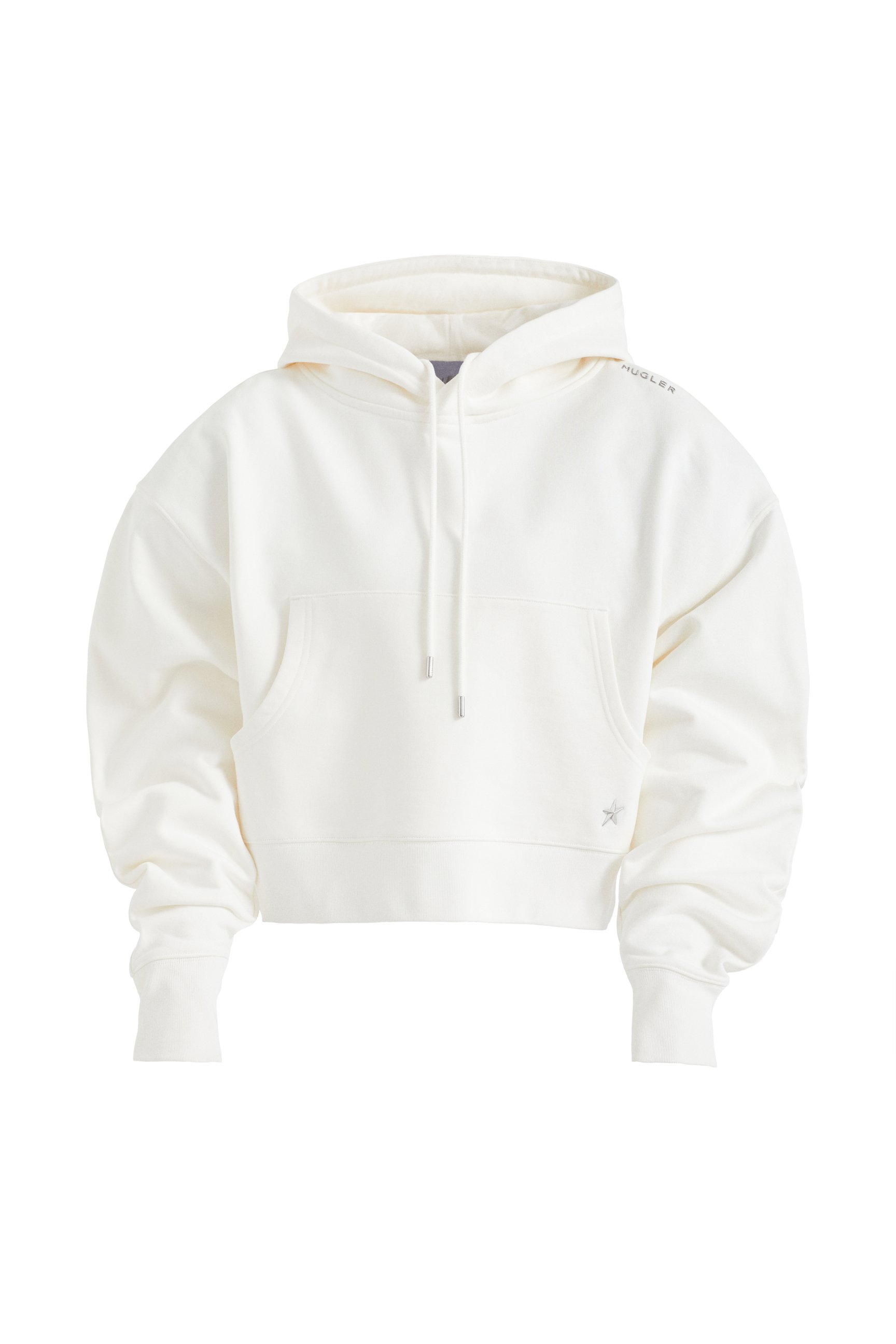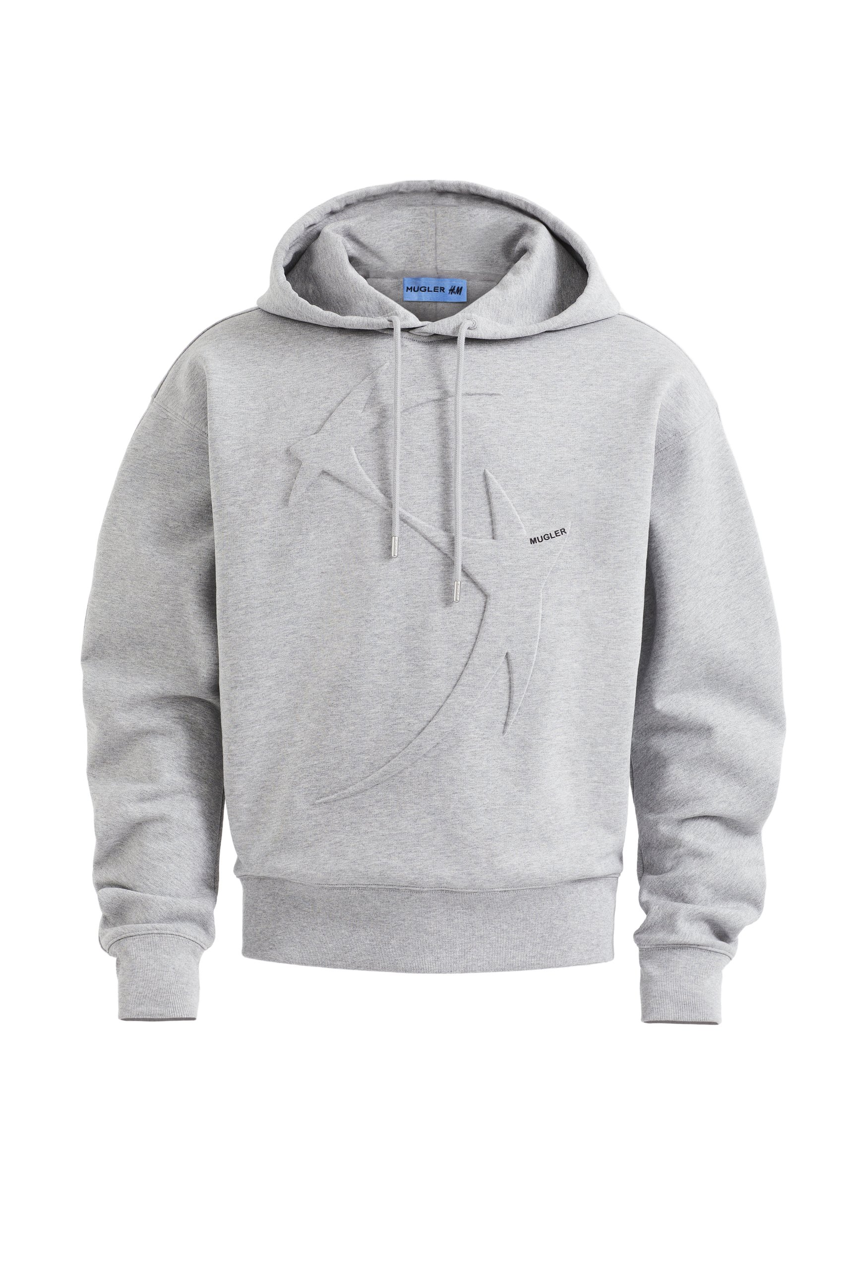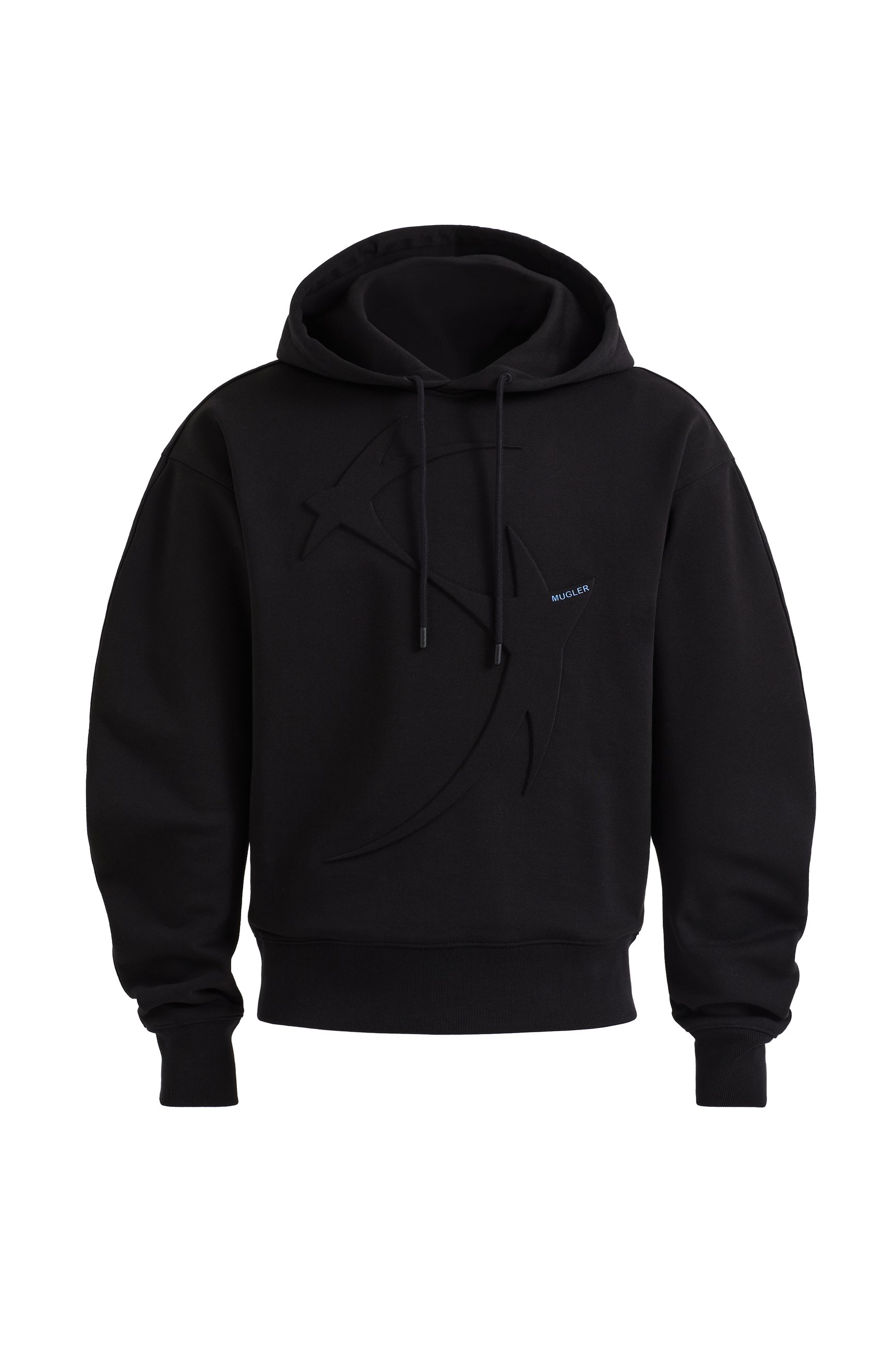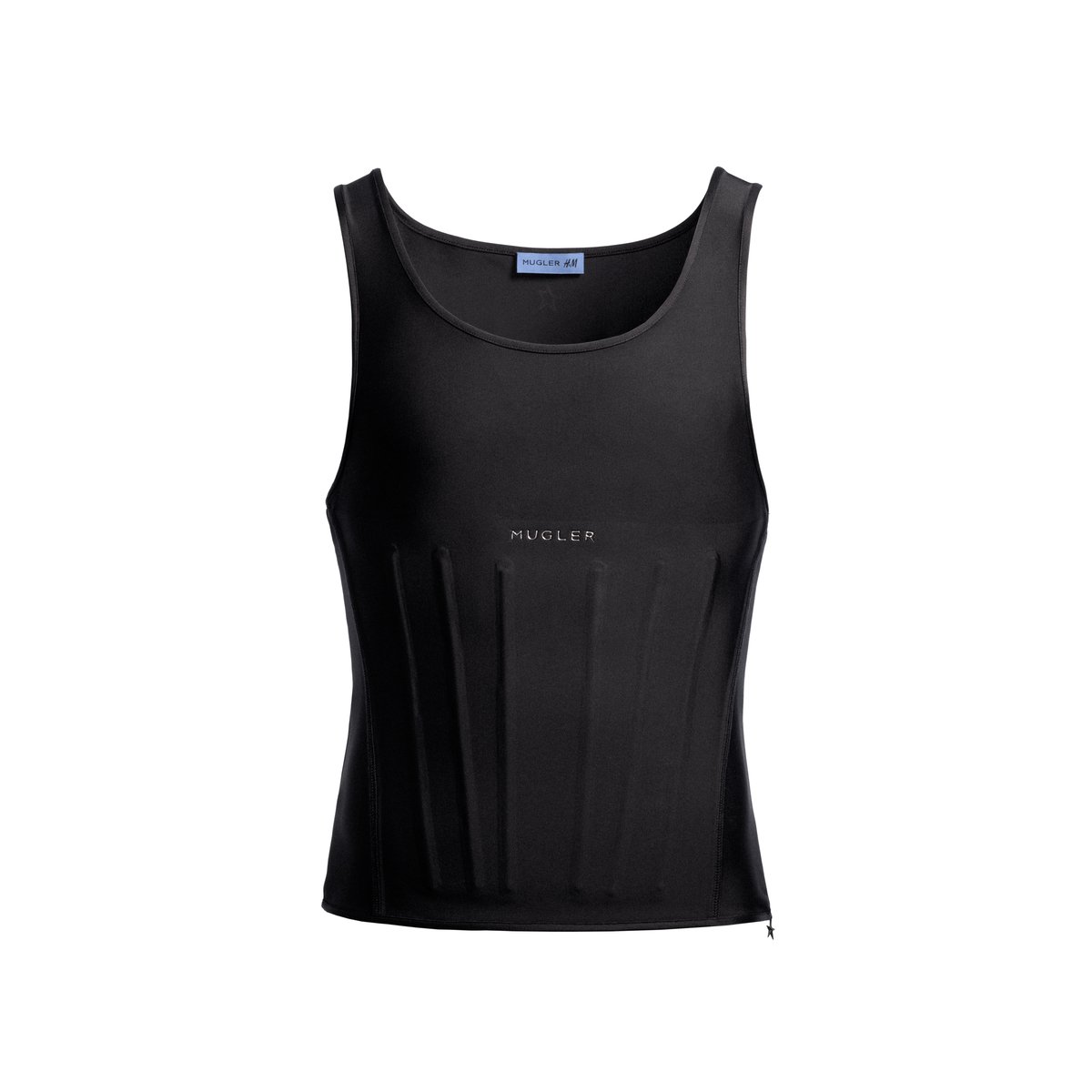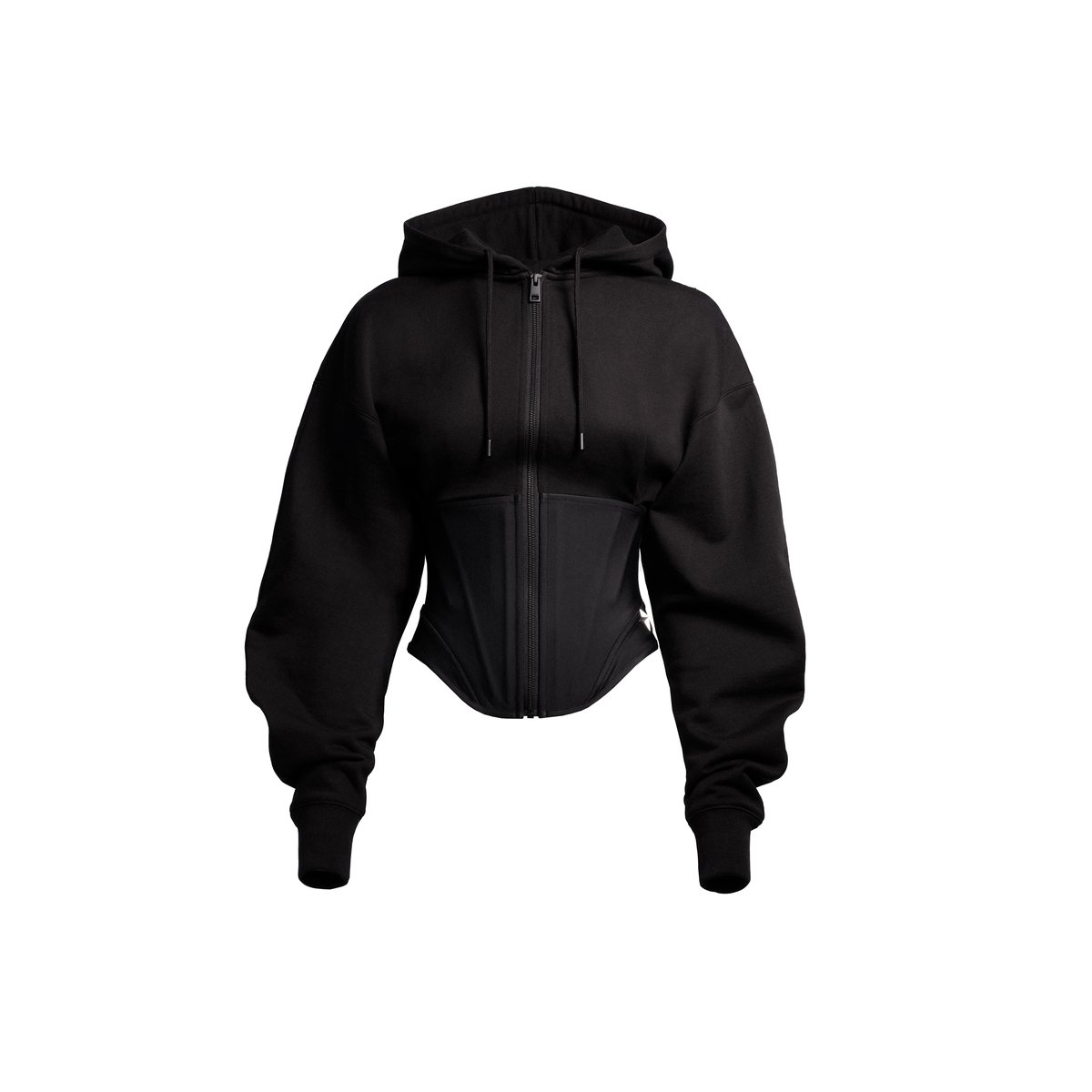 ミュグレーらしい、力強いショルダーやタイトウエストはそのままに、よりカジュアルダウンしたアイテムも数多く用意。中でも、ボンディング加工を施したピタッとフィットするボンデッドコルセットと、丸みを帯びたショルダーが特徴的なフーディは、マストバイアイテム。