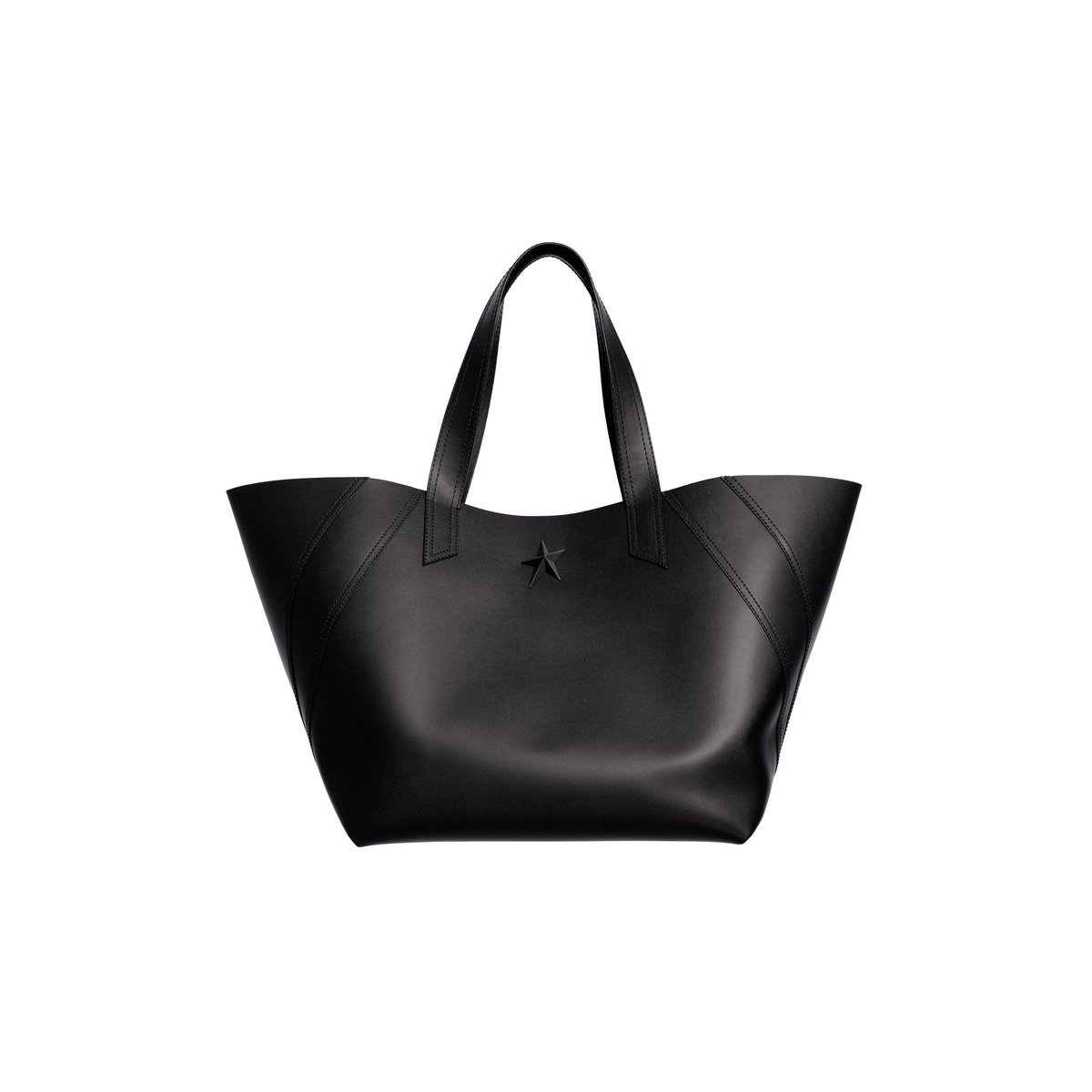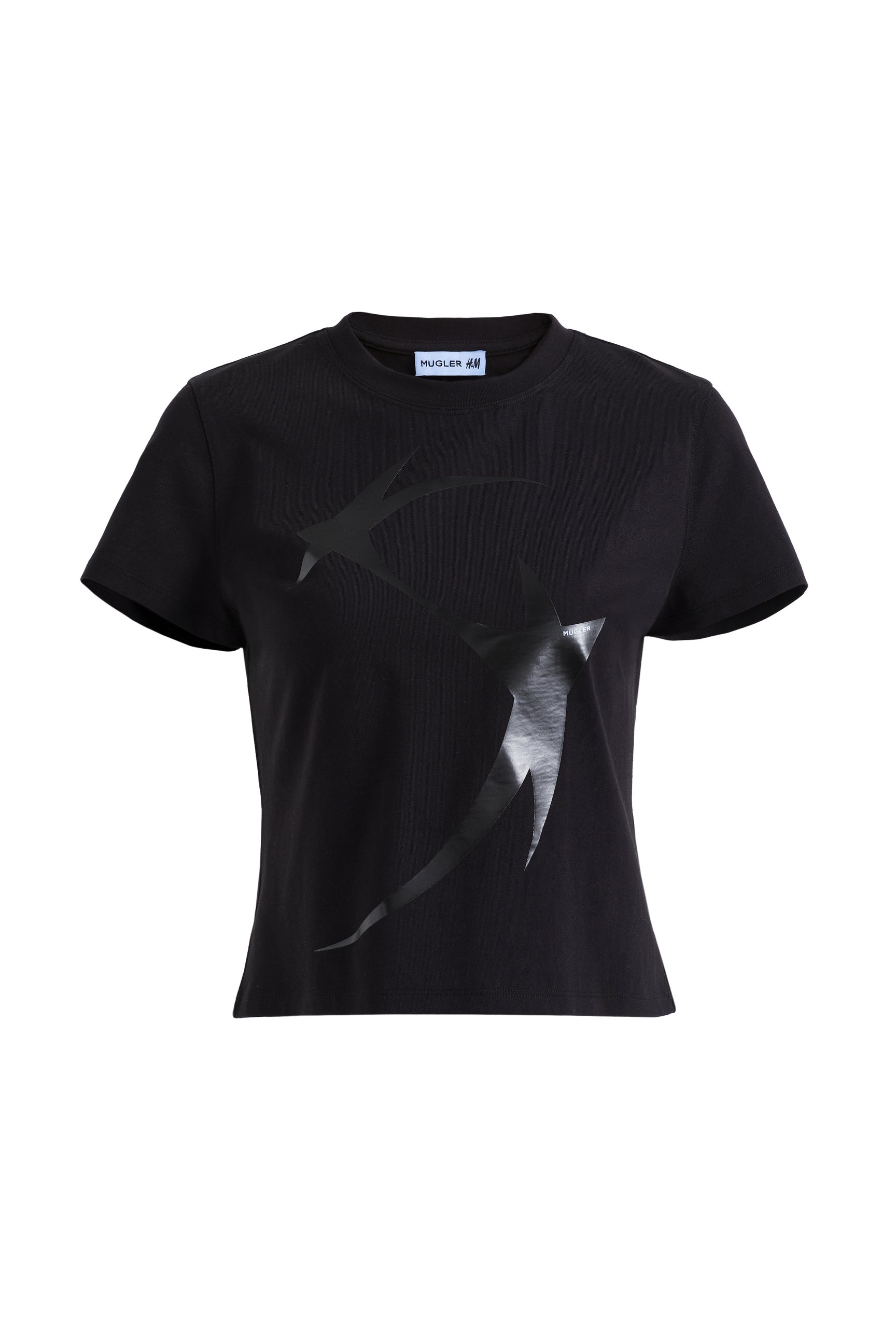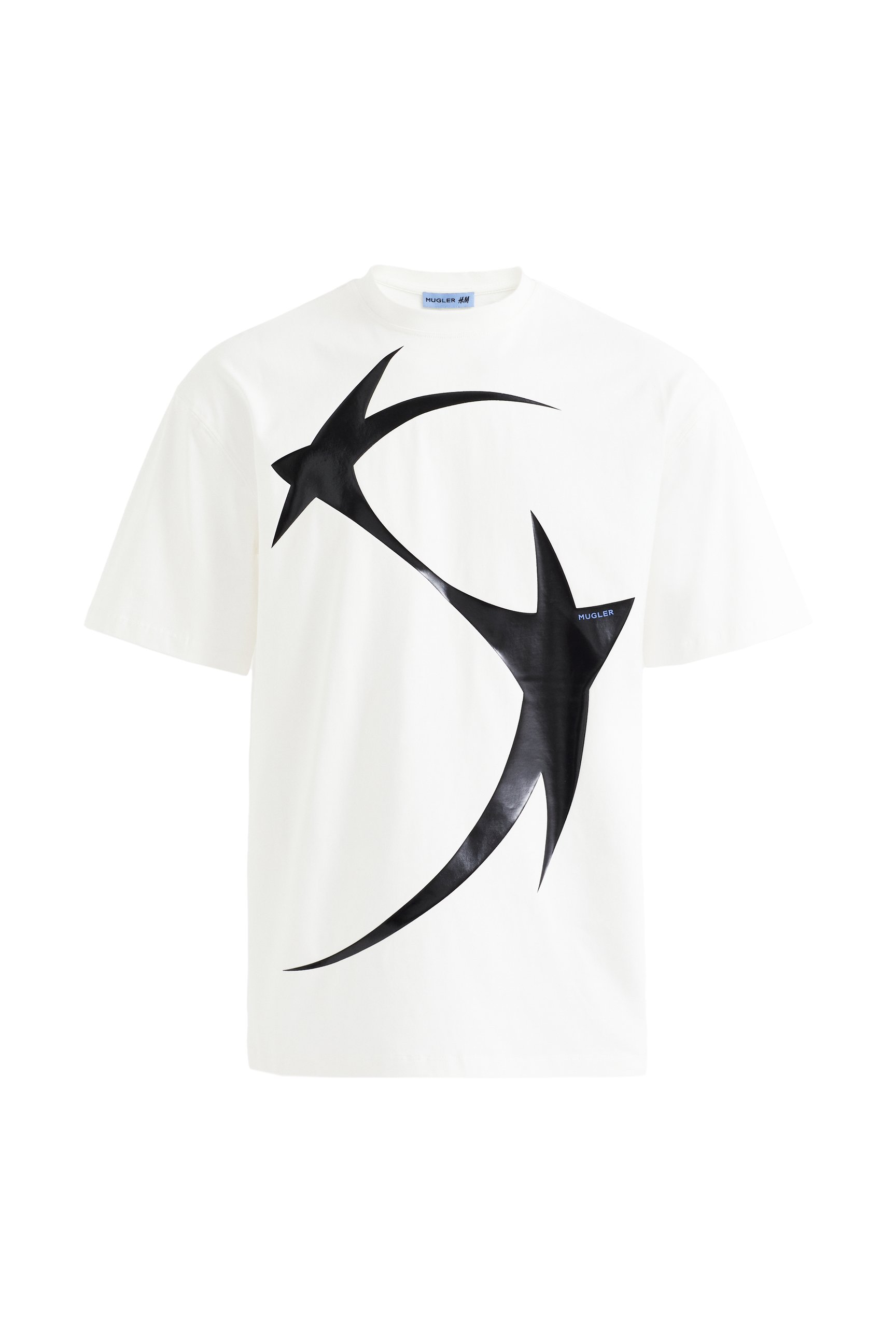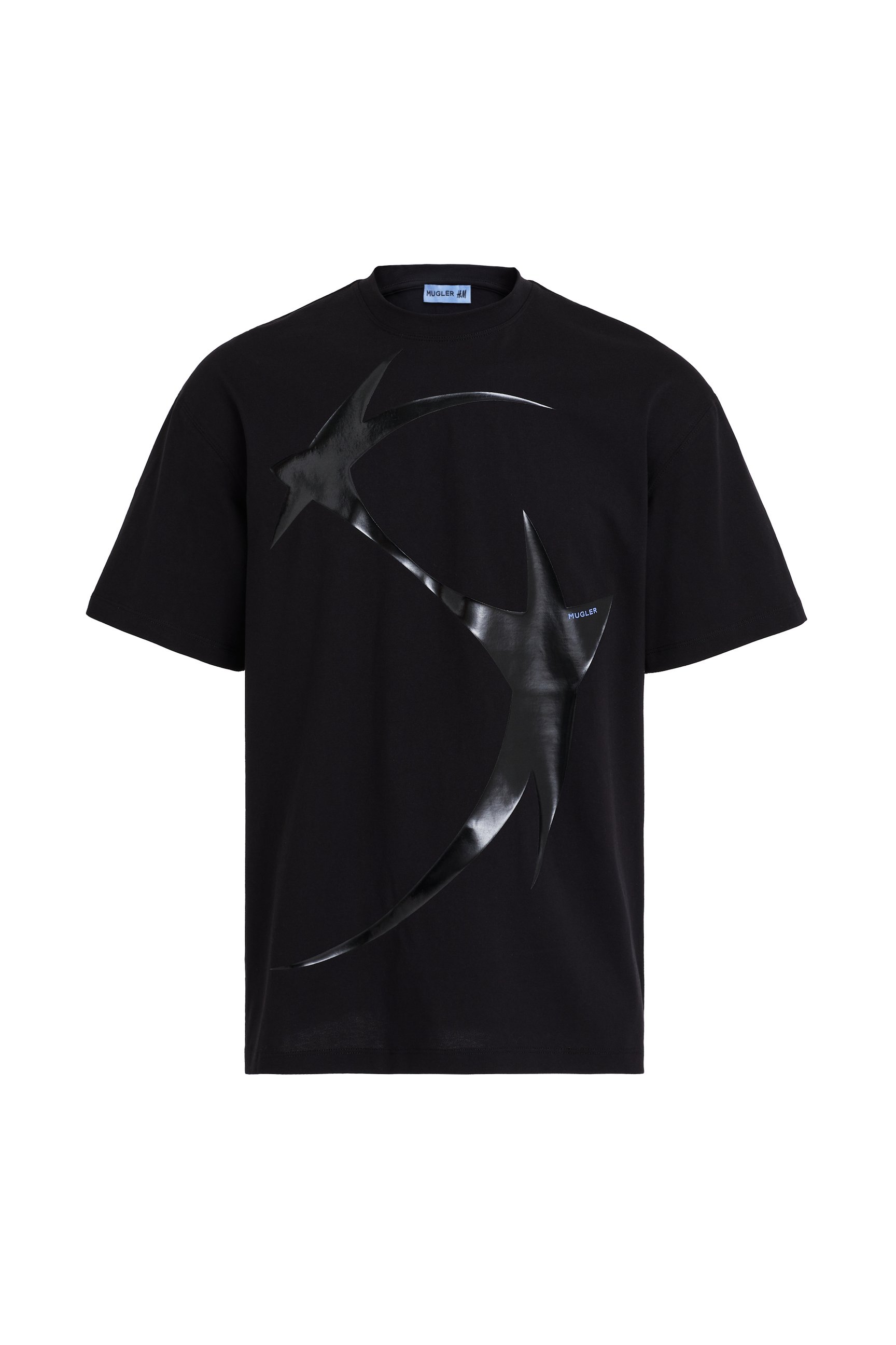 アクセサリーは、性別に関係なく身につけられるようにデザイン。キーカラーであるブラックとメタリックは、クラシックなブラックと大胆な輝きを併せ持つコレクションの全体的なムードを引き立ててます。ブーメラン型のイヤリングや、大ぶりなティアドロップ型のイヤリング、カクテルリングなど、アーカイヴにちなんだものも数多く登場。キャップはレザーとコットンの2種類を展開し、ミュグレーの特徴的な星柄が渦巻いたスカーフは、オーガニックシルクを使用しています。大きな「M」の文字が入ったベルトは、ミュグレーのアイコニックなブランドロゴを思わせ、オーバーサイズのレザートートには、 ほかのアイテムにも使われている星型の金具があしらわれています。