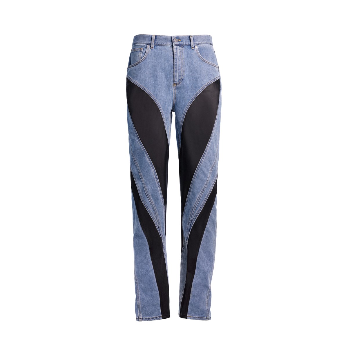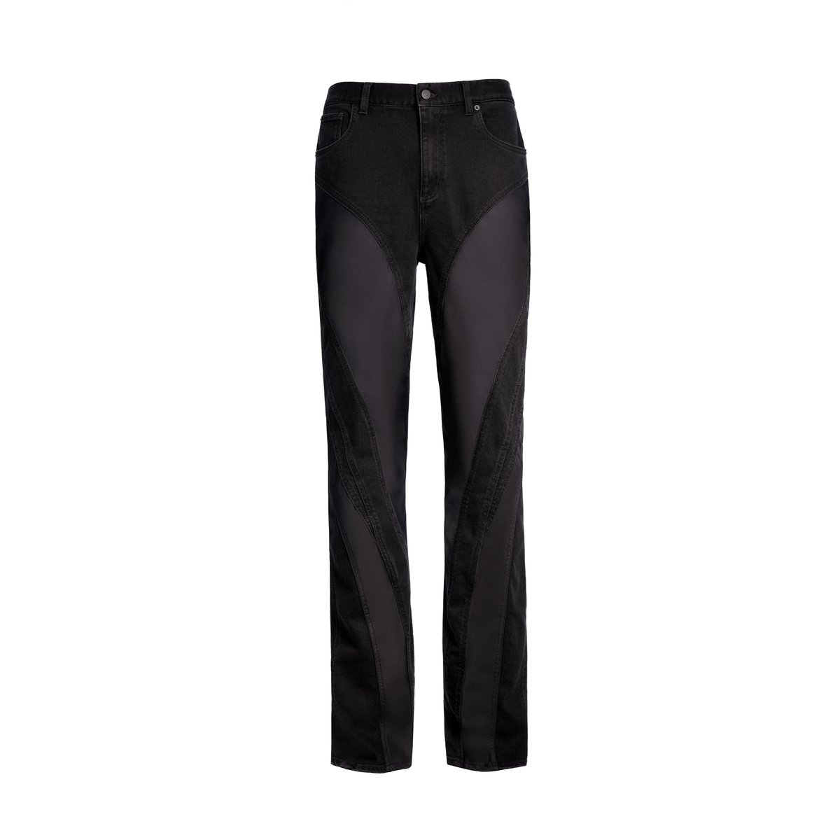 パンツは、ジッパーフライが見える官能的なレザーパンツや、ウエストにカットアウトディテールを施したワイドパンツなどのほか、ミュグレーのシグネチャーであるツイストジーンズからは、ブラックのナイロン生地とクラシックデニムを組み合わせた2スタイルをラインナップします。