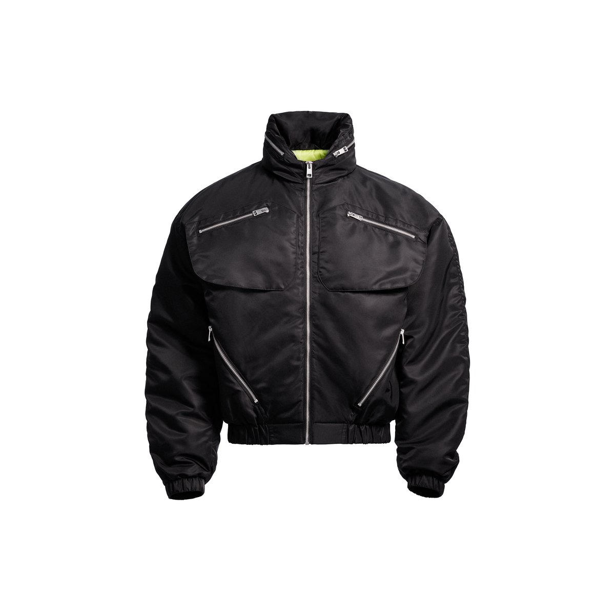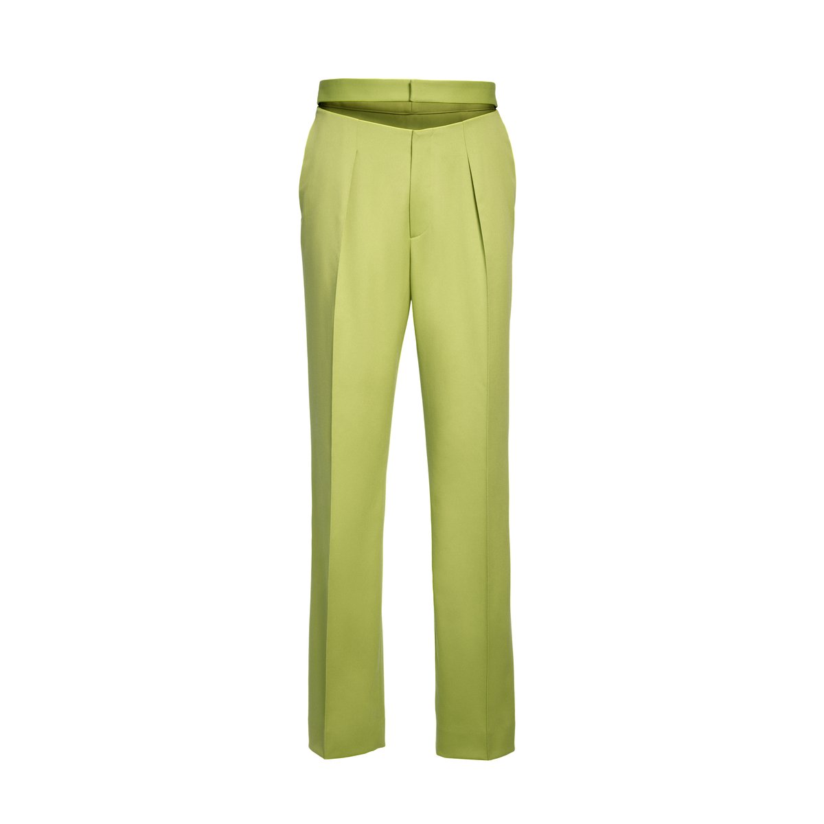 ブランドのシグネチャーでもあるスターのロゴボタンが付いたブラックレザーのロングトレンチをはじめ、襟のないレザーブレザーやパラシュートジャケット、ショルダーに入ったパッドと袖のツイストシームでシルエット形を強調させた彫刻のようなデニムジャケットなどを用意。アシッドグリーンのテーラードジャケットは1990年代にデヴィッド?ボウイが着用したことでも知られているアイコニックなアイテムです。