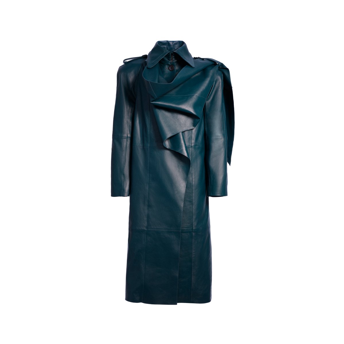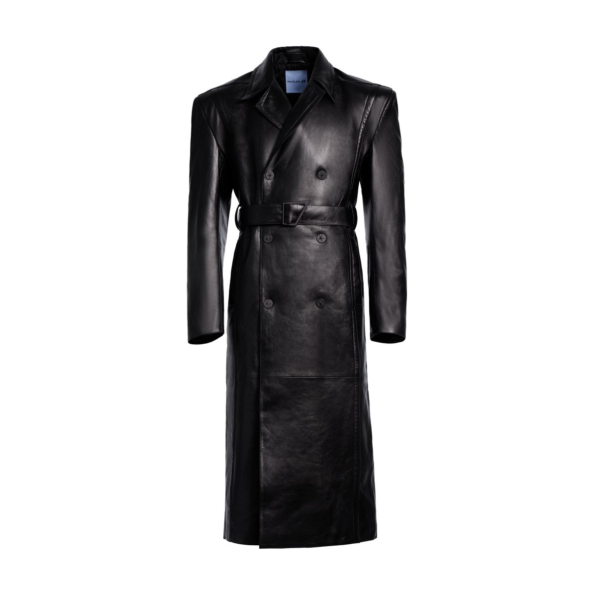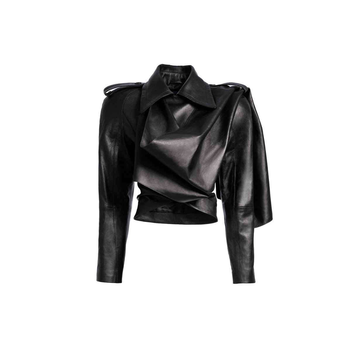 主役級のクロムフリーレザーのロングトレンチは、リッチなグリーンカラーで、体に巻きつけることができる長いスカーフのディテールが特徴。このスカーフのディテールは、ウエストを絞ったブラックのクロップドレザージャケットにも同じく施されています。ミュグレーのシグネチャーであるコルセットがついたジャケットは、肩パッド付きで、ヒップもパッドで丸みを帯びたシルエットになっています。襟が無いルーズカットジャケットは普段使いにも◎。一際目を引く、アンティークピンクジャケットは1990年代半ばに製作されたアイテムを着想源にしたもの。胸元には、印象的なメタルボンデージのディテールが付いています。