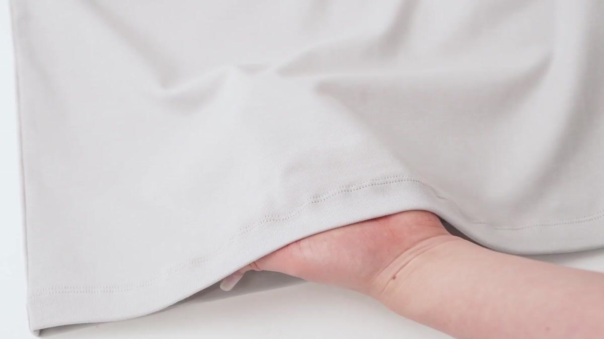 綿95%、ポリウレタン5%の混紡素材を使用しており、伸縮性が非常に良いのが特徴です。着たときにひんやりと感じる涼感素材も相まって着心地は◎。暑い季節でも快適に過ごせそうです。生地にもしっかりと厚みがあり、透け感も気になりませんでした。