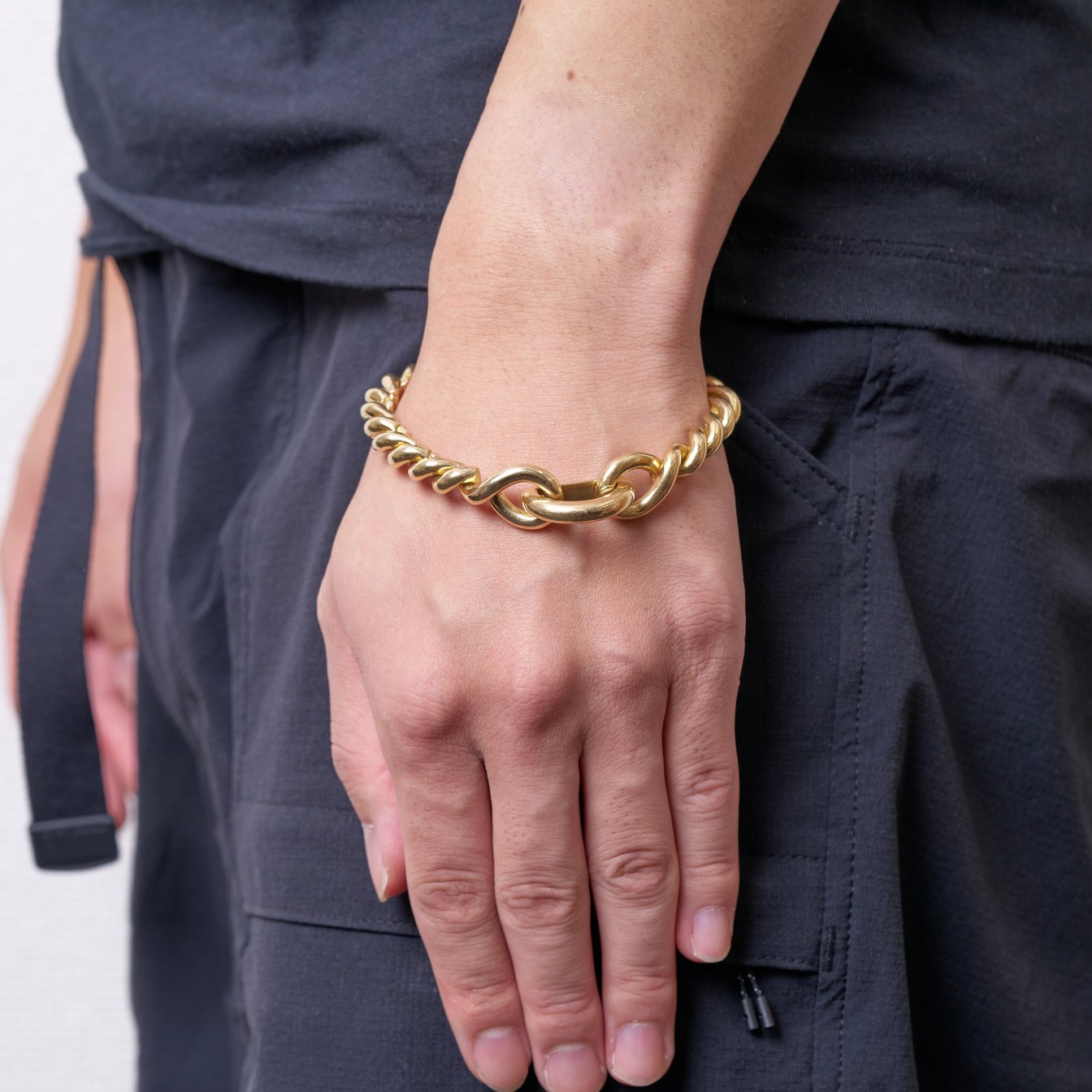 今回ピックアップしたアイテムのホールマークを見てみると、エルメス3代目社長の名を冠したエミール?エルメス(Emile Hermès)工房で製造されたことが分かります。この個体は、留め具部分のピースが両側から完全に外れるようになっているのが特徴。この仕様、紛失のリスクが高くなるだけで、メリットなんてないように思えますよね(笑)。あくまでも僕の推測ですが、これはエミール?エルメス工房をはじめとした、ごく一部の工房でしか採用していなかったディテールではないかと考えています。通常、アクセサリーの留め具は目立つことがご法度とされる黒子のような存在ですが、トルサードはかなり凝ったつくりになっていているので、留め具をあえて手首の上に来るように付ける方が多い印象ですね。