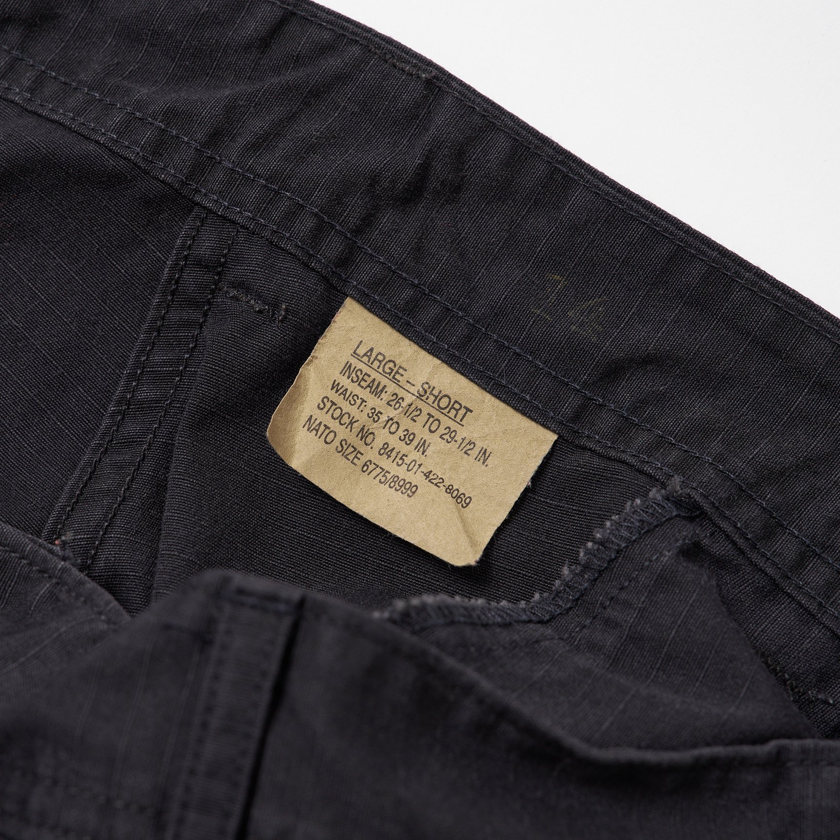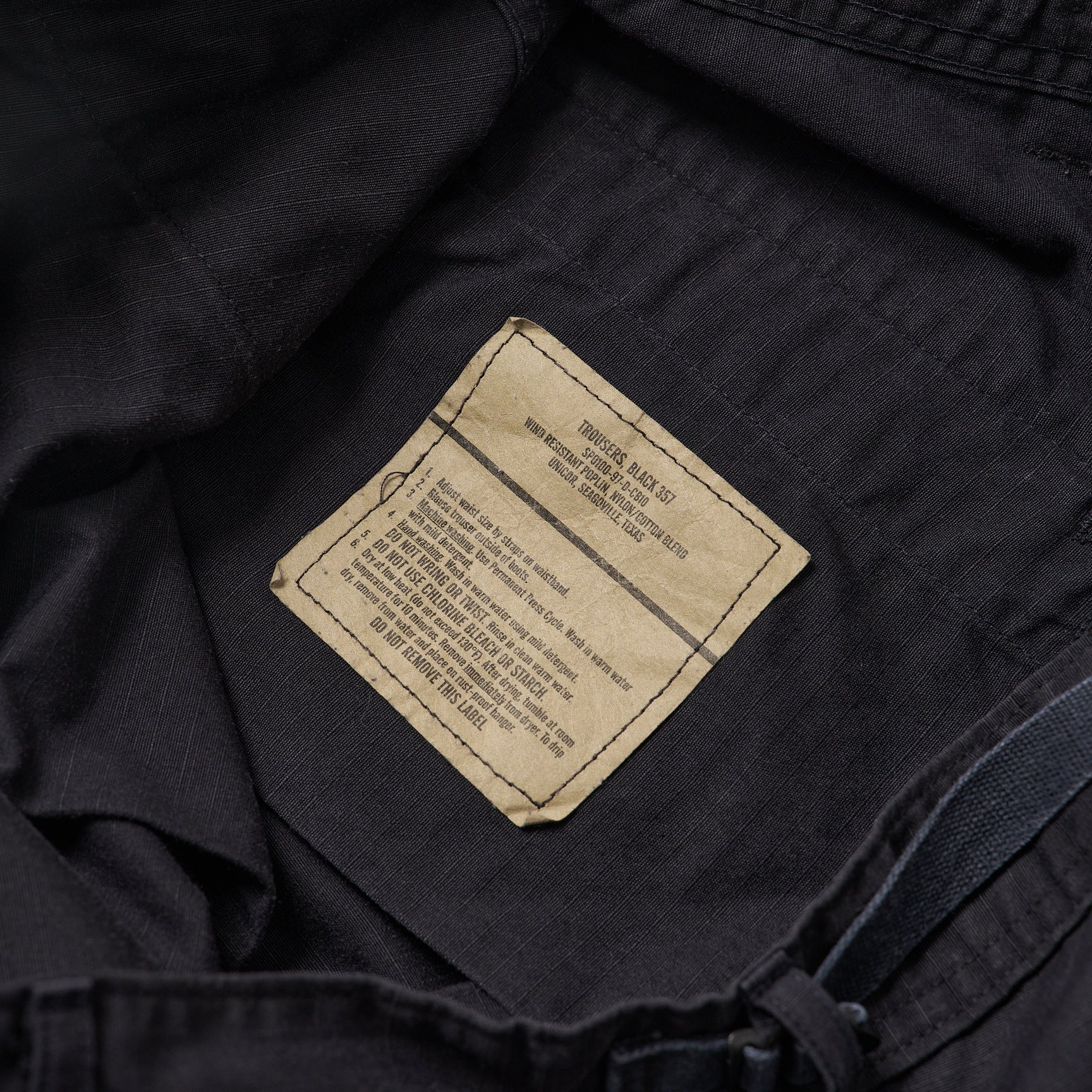 一般的に流通しているBDUジャケット、BDUパンツは迷彩柄やオリーブ色のものが中心ですが、ブラック357はその通称が物語るように、アメリカ軍のミリタリーウェアで初めて採用されたブラックカラーが特徴です。特殊部隊やSWATが着用したもので、1997年の1年間しか製造されなかったと言われています。とはいえ、ブラック357自体はそれほど高価ではありません。相場はジャケットで2万円前後、パンツで1万円前後と、これまで紹介してきたヴィンテージに比べると手を出しやすい価格です。ただ、一部のサイズはやや高価になっています。ジャケットは着丈をロング、ミディアム、ショートから選べるのですが、僕が好きな「ラージショート」という身幅が大きくて丈が短い個体は4?5万円ほどが相場です。