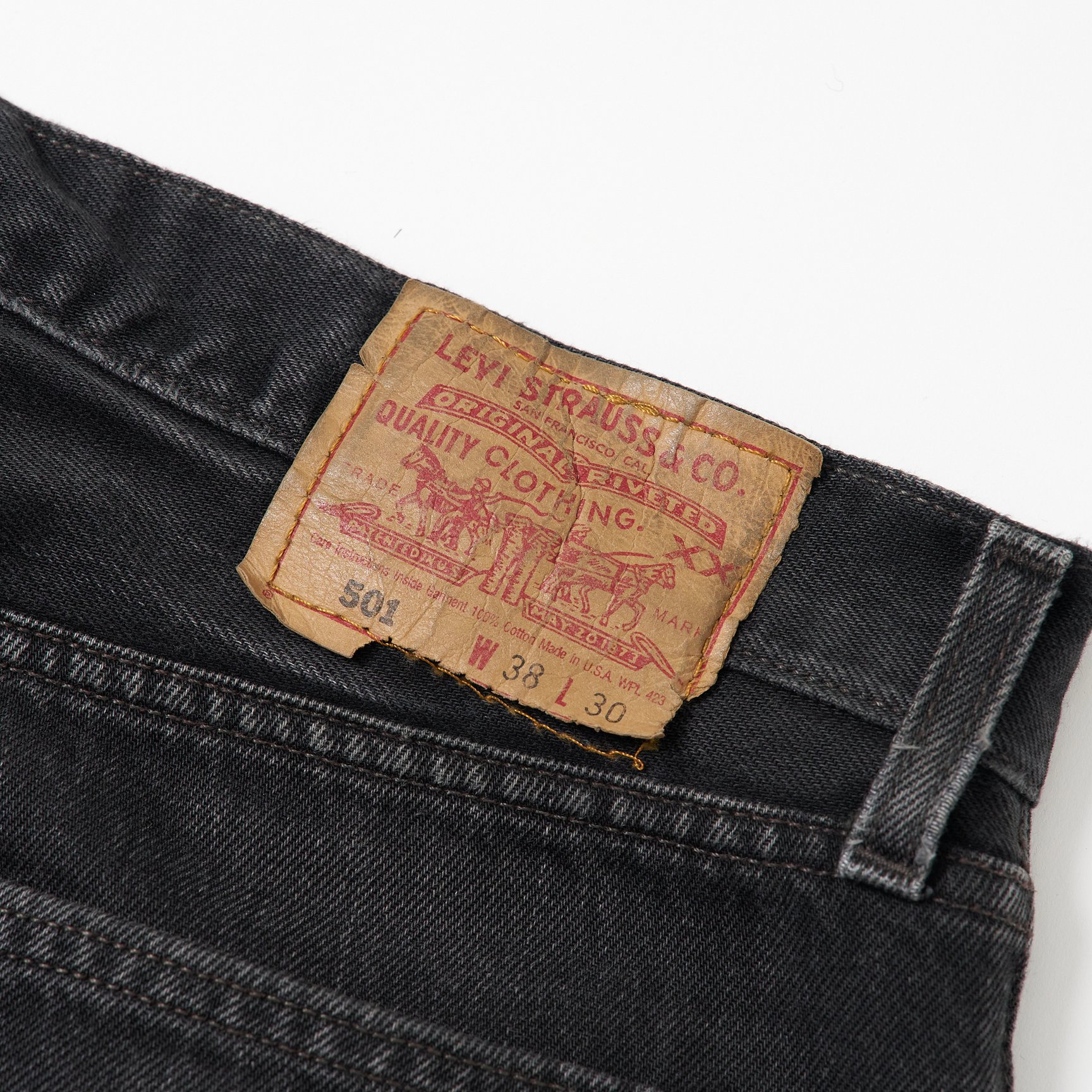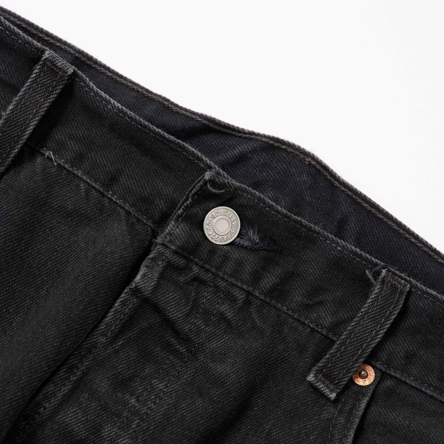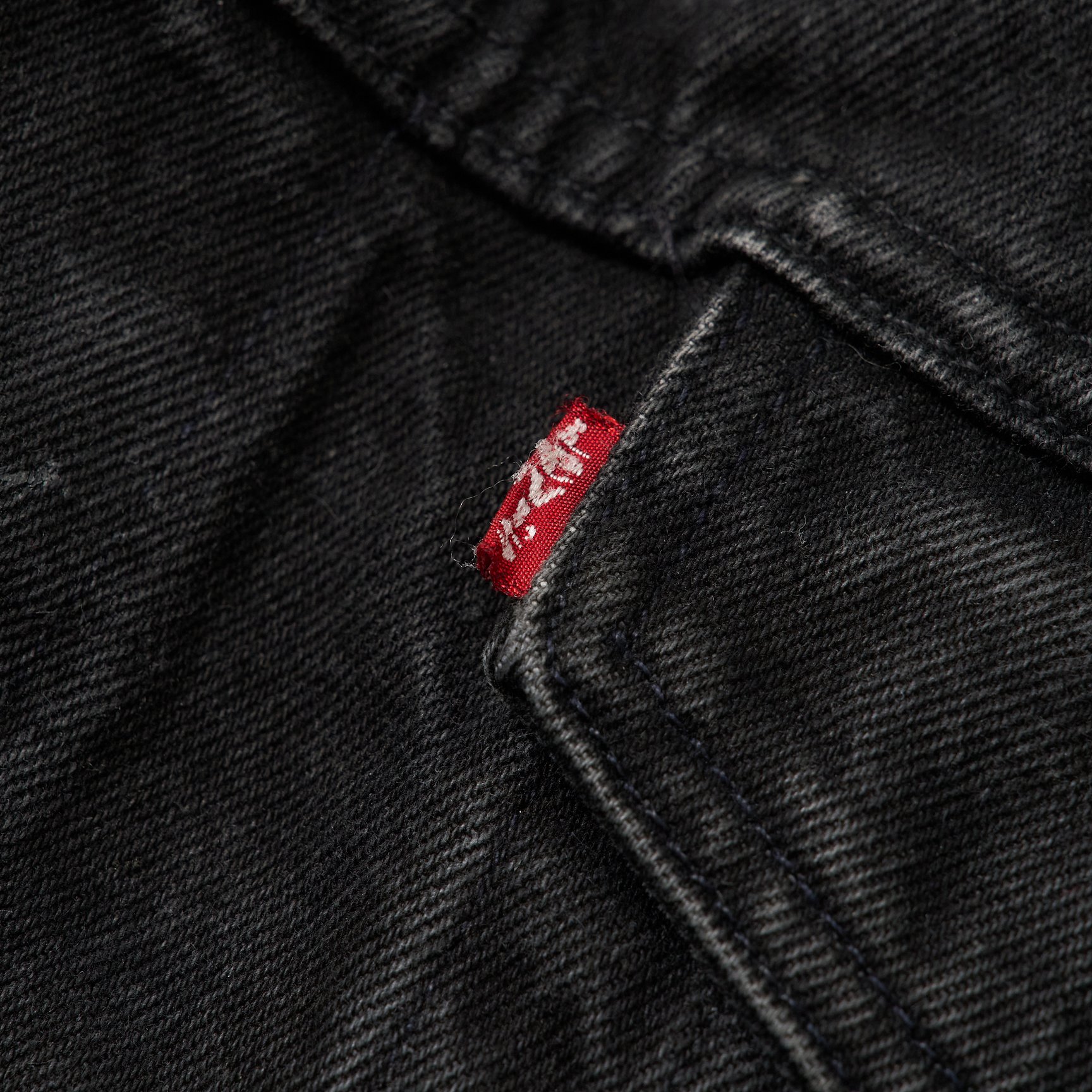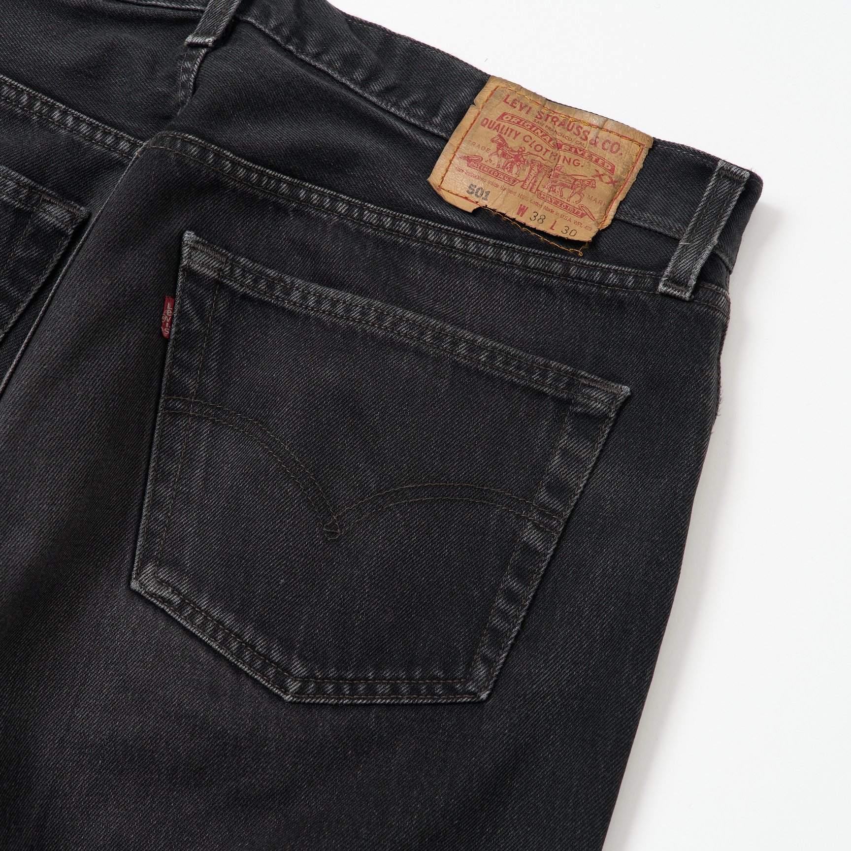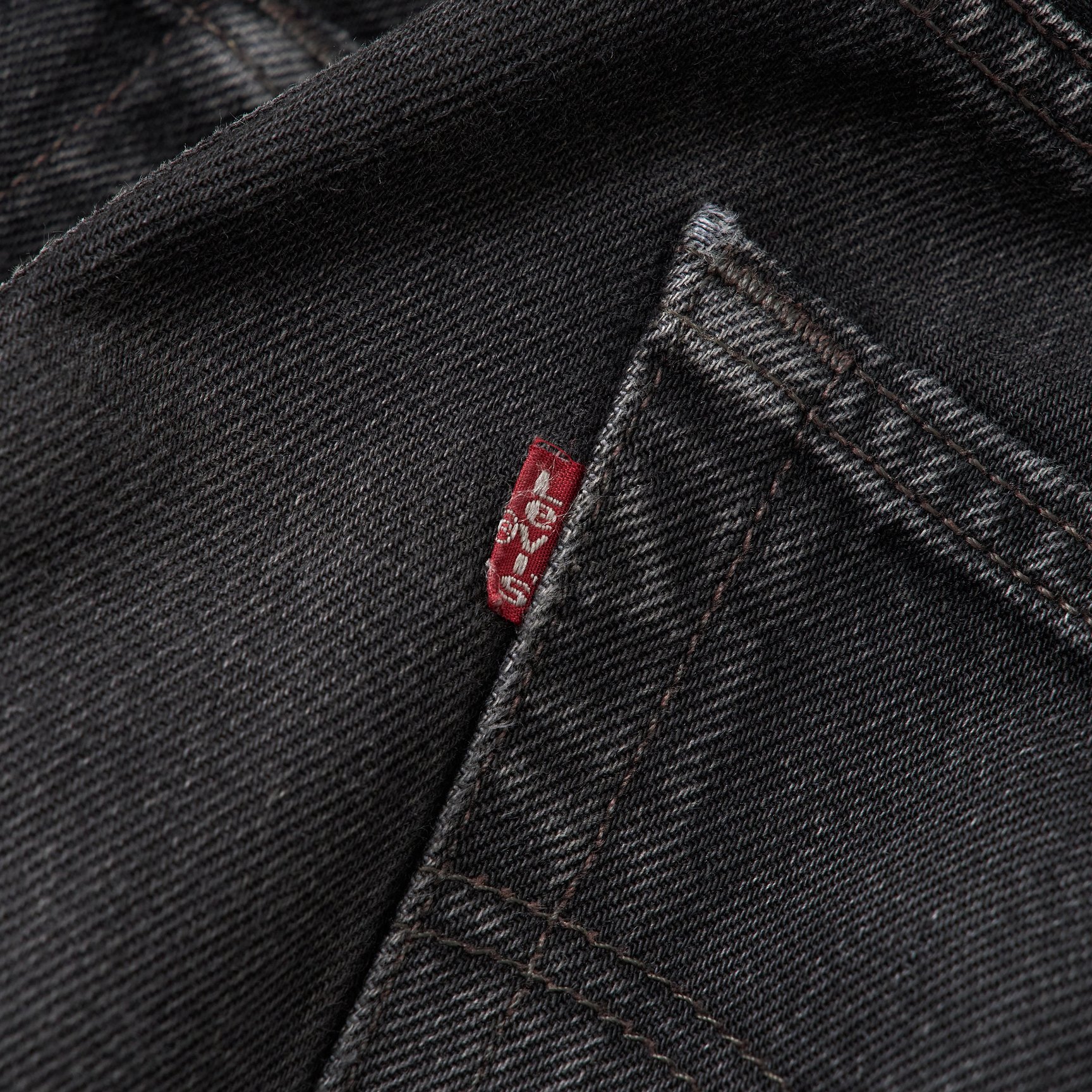 現在のヴィンテージ市場で、リーバイスのブラックデニムは「先染め」と「後染め」の2種類に分類されています。ですが、リーバイスのブラックデニムに対する「先染め」「後染め」という呼称は、厳密に言うと正しくないんです。アパレル業界では、生地を織る前の段階で糸を染めることを先染め、織った後の生地を染めることを後染めと呼んでいますが、リーバイスのブラックデニムは「先染め」も「後染め」も、生地を織る前に糸を染めているので、正式にはどちらも“先染め”。リーバイスブラックデニムにおける「先染め」と「後染め」の違いは、前者がヨコ糸(横方向に通す糸)に白糸を、後者が黒糸を使っているということ。生地の裏側がグレーに見えるのが「先染め」です。